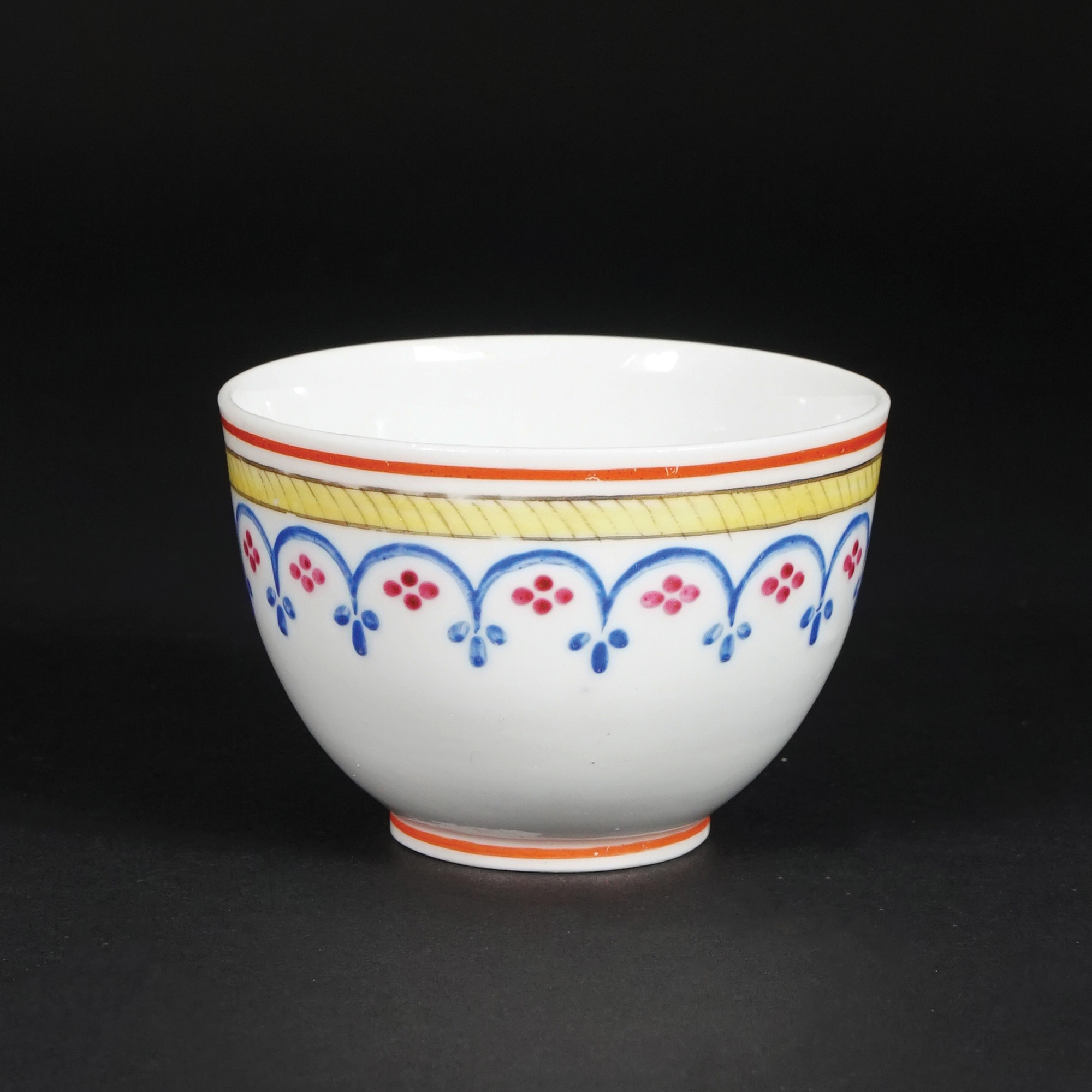 Tazza in porcellana bianca e policroma dipinta lungo il bordo a raffigurare una sequenza di archetti ciascuno dei quali sottende una composizione floreale alquanto semplificata.