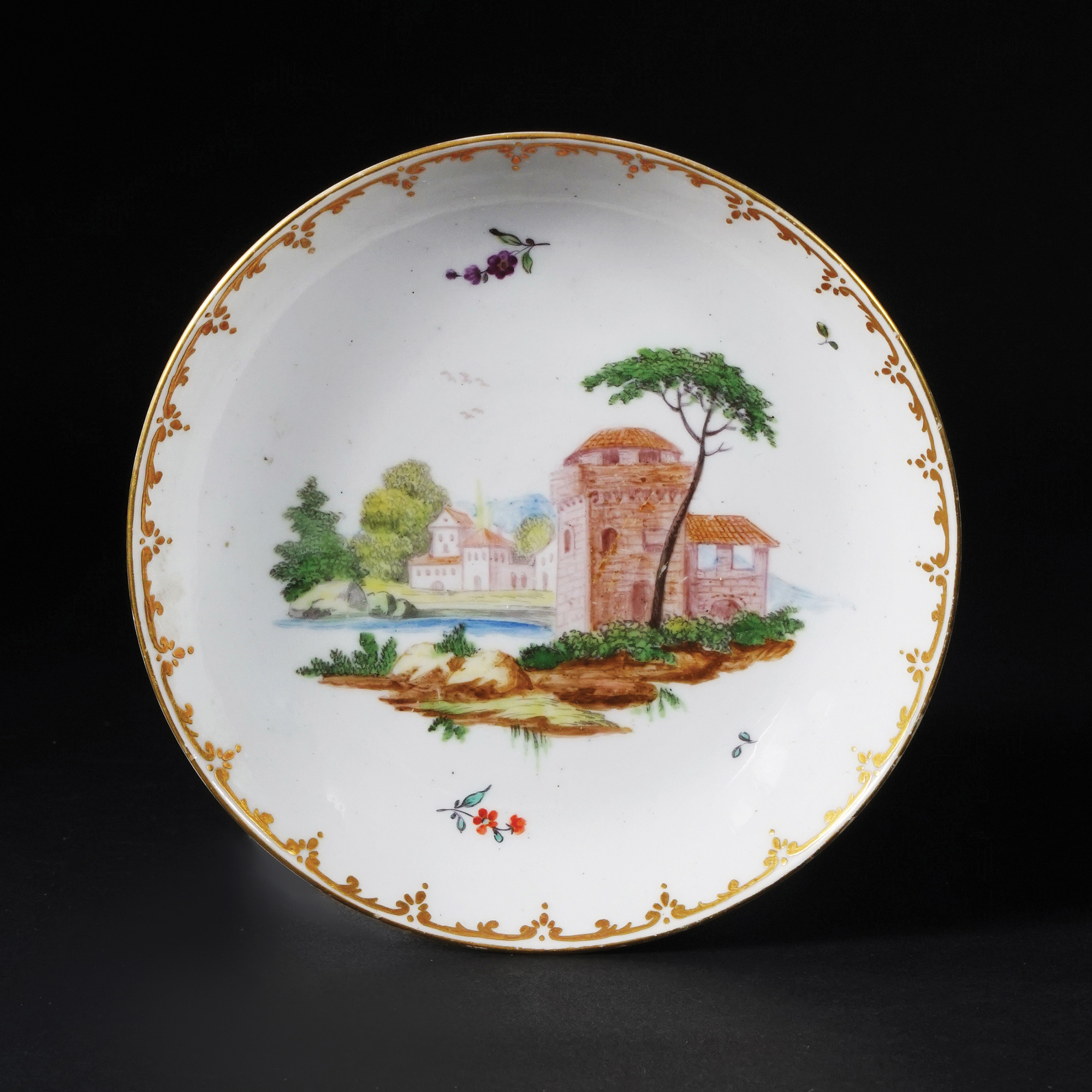 Piattino in porcellana bianca, dorata e policroma dipinto "a ville venete": un agglomerato di edifici si snoda lungo la sponda di un fiume; in lontananza una villa con montagnole sullo sfondo a ricordare il paesaggio collinare veneto.