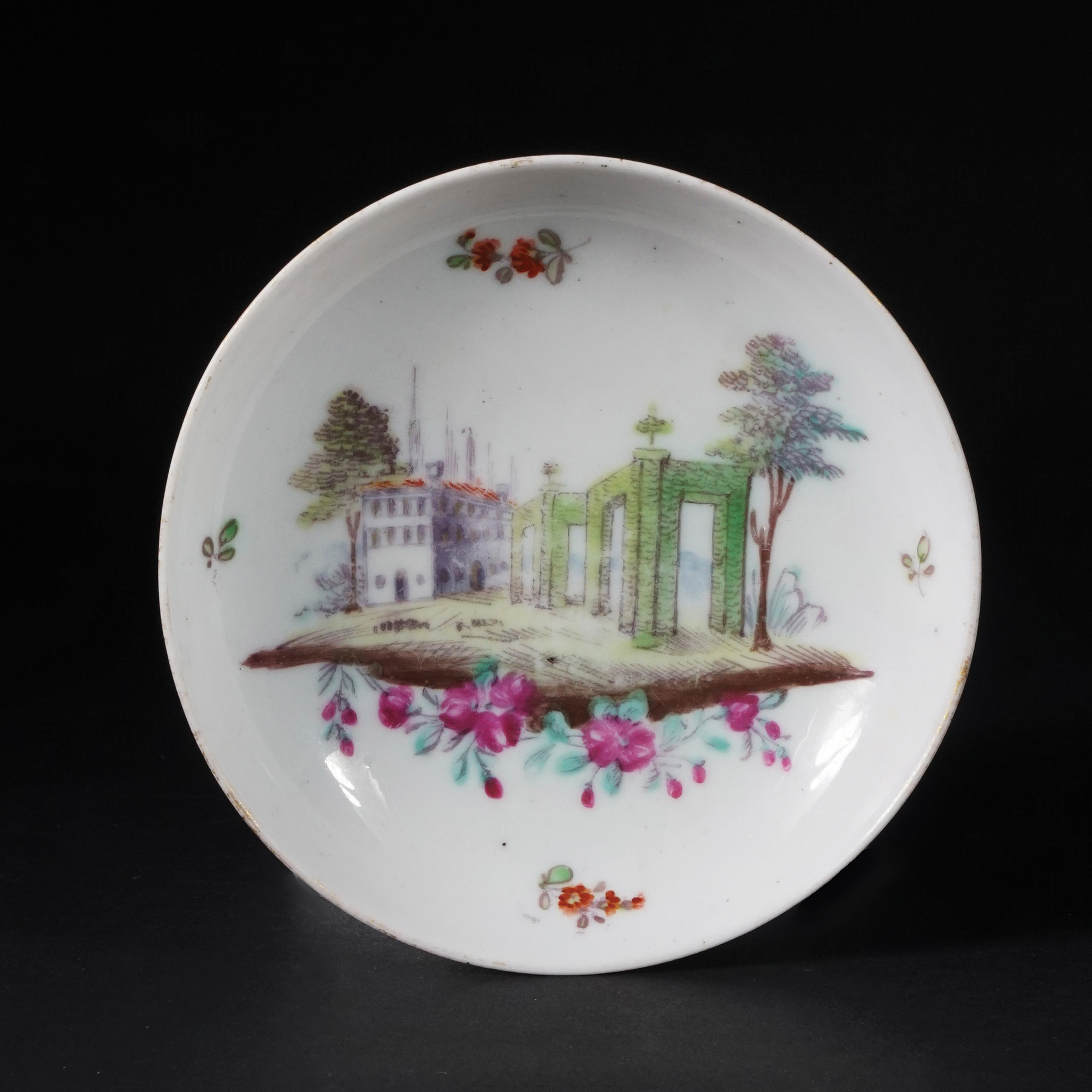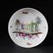 Piattino in porcellana bianca e policroma dipinto "a bersò" con edificio...