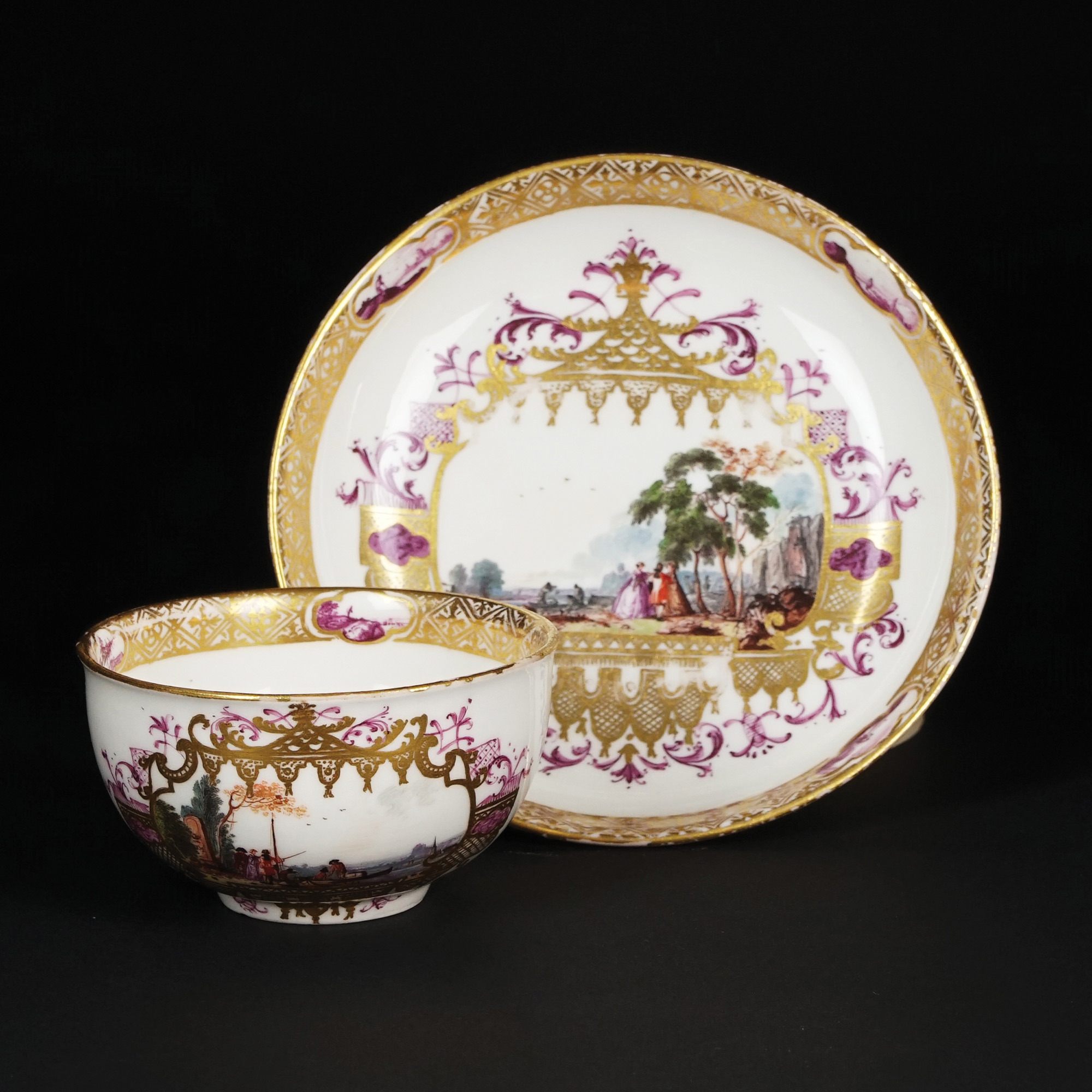 La tipica scena di ambientazione portuale, la cosiddetta Kauffahrtei, che domina sulla tazza, si contrappone ad un paesaggio alla sassone illustrato sia sulla tazza stessa che sul cavetto del piatto. Così troviamo mercanti sullo sfondo di una marina con imbarcazioni e alberi in secondo piano oltre a pittoresche vedute alberate, figurette e montagnole all'orizzonte, ispirate ai luoghi ameni della Sassonia. Le scene sono ben circoscritte da una sorta di cornice caratterizzata superiormente da un motivo a lambrequins tipico del Luigi XIV da cui ricadono cascatelle di volute che, ampliate alla base, formano un appoggio ideale alla vignetta. Paesini realizzati in monocromia verde, animati anch'essi da personaggi minimi, interrompono la bordura che orla sia la tazza sia il piatto.