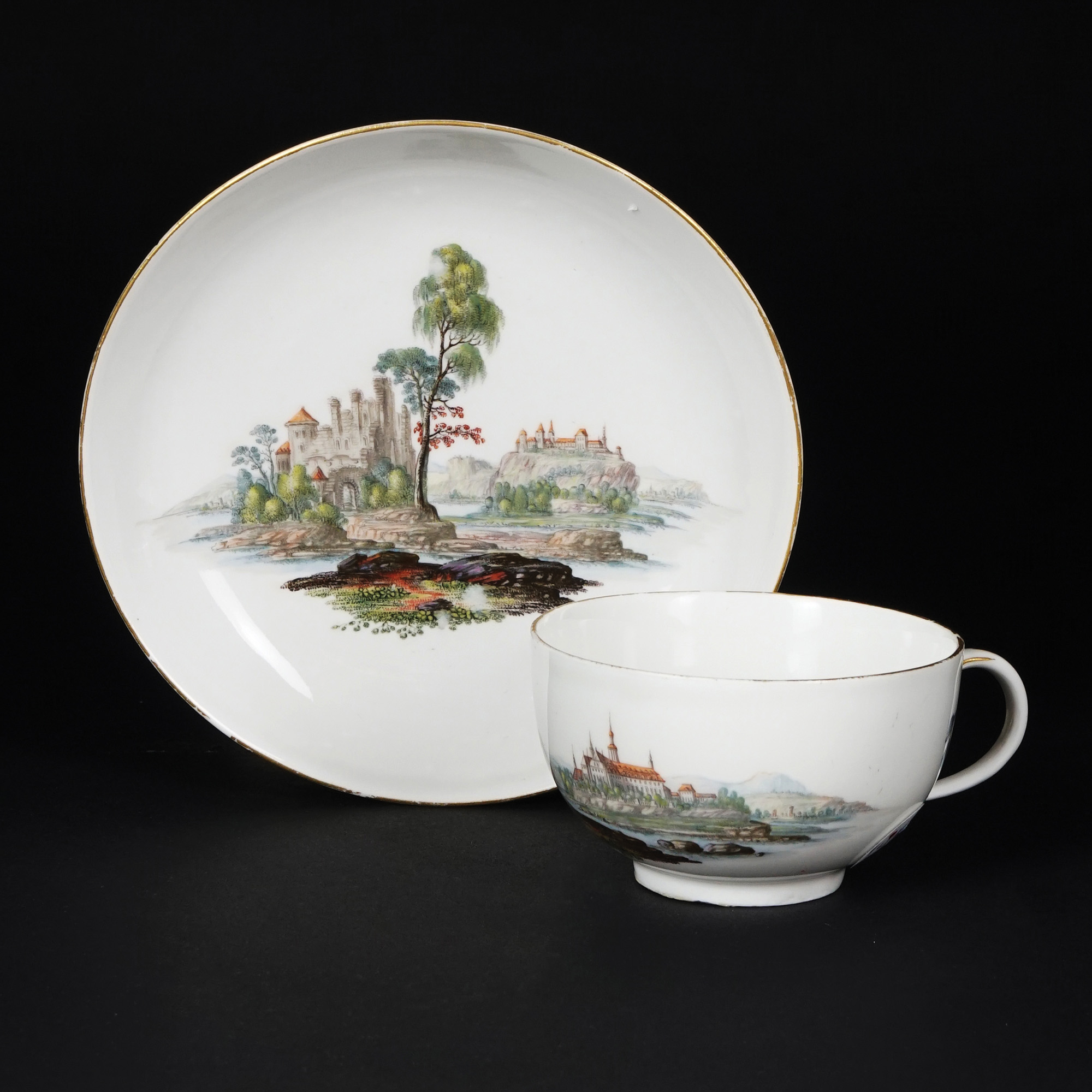 Tazza con piatto in porcellana bianca dipinta nei toni del verde, marrone e azzurro pallido a raffigurare il castello di Albrechtsburg e la cattedrale di Meissen che si ergono sulla collina lungo le sponde del fiume Elba; le scene riprendono le incisioni tratte dalle vedute della Sassonia realizzate da Alexander Thiele (1685-1752). All'interno della tazza campeggia un mazzolino di fiori recisi resi in vivace policromia.