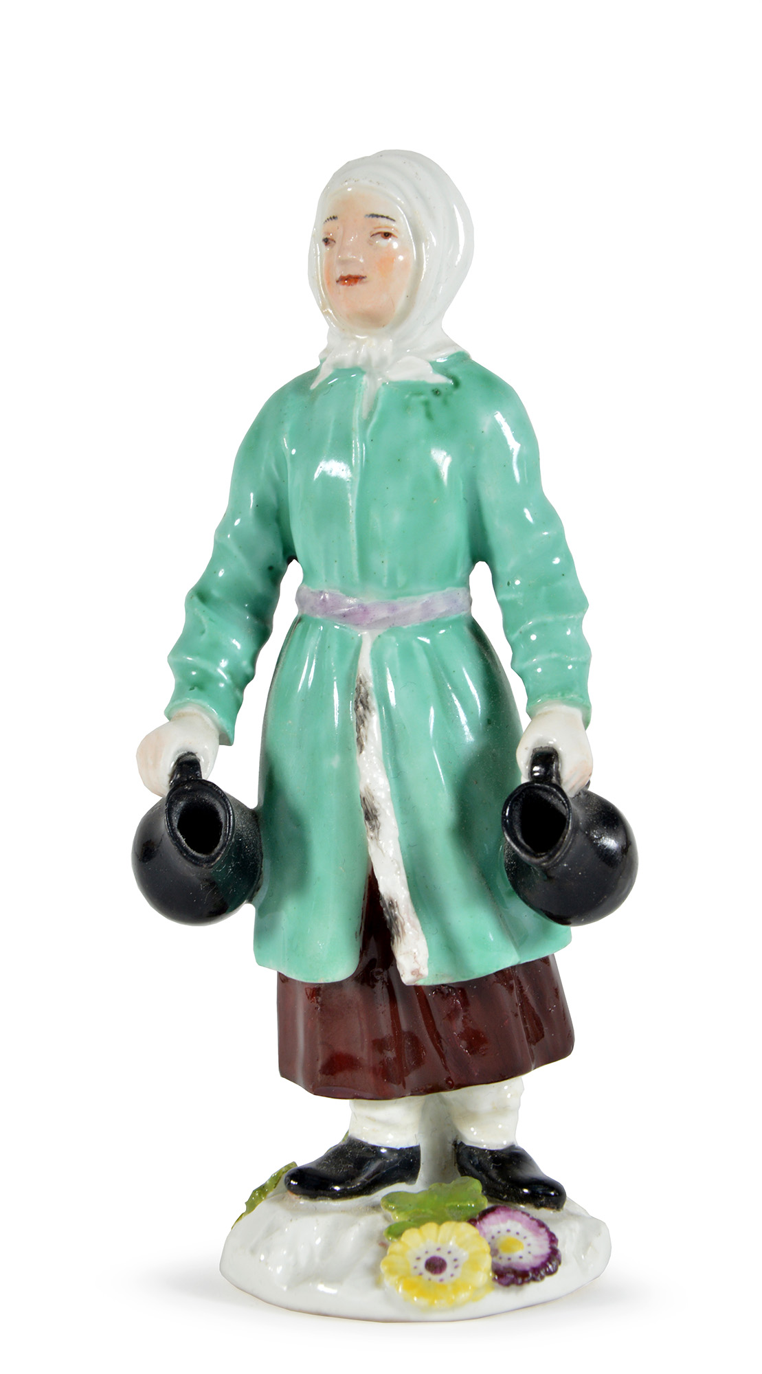 Rara scultura in porcellana policroma modellata da Peter Reinicke, raffigurante una venditrice d'acqua, della serie delle "Grida di San Pietroburgo"; base con fiori applicati.