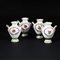 Quattro vasetti in porcellana bianca e policroma; due anse a voluta fogliata con attacco a mascherone.