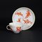 Tazza con piatto in porcellana bianca, giallo paglierino e viola, dipinta in monocromia rosso ferro a raffigurare il decoro denominato Gebrochener Stab: ramoscelli di fiori obliqui posti sulla parete della tazza formano altresì una sorta di girandola a ornamento del cavetto del piatto.