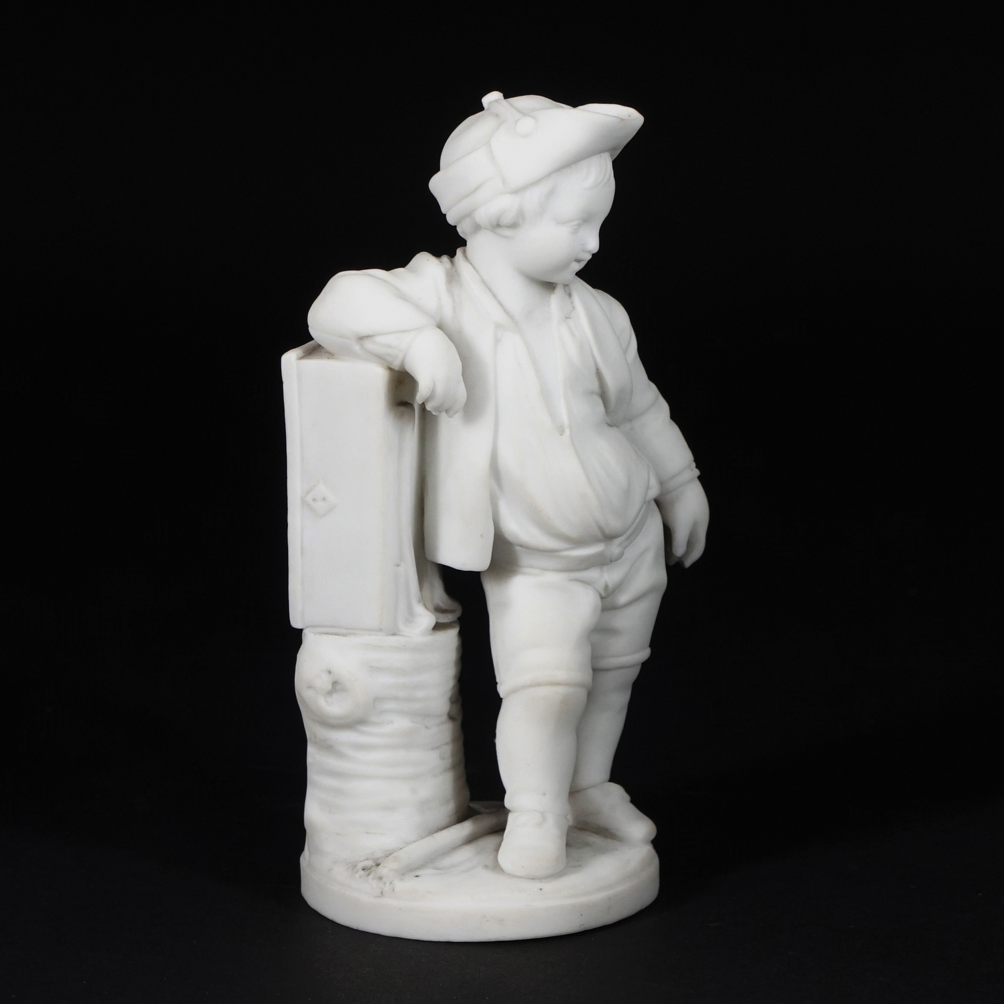 Scultura in biscuit raffigurante un contadinello, appoggiato ad una cassetta....