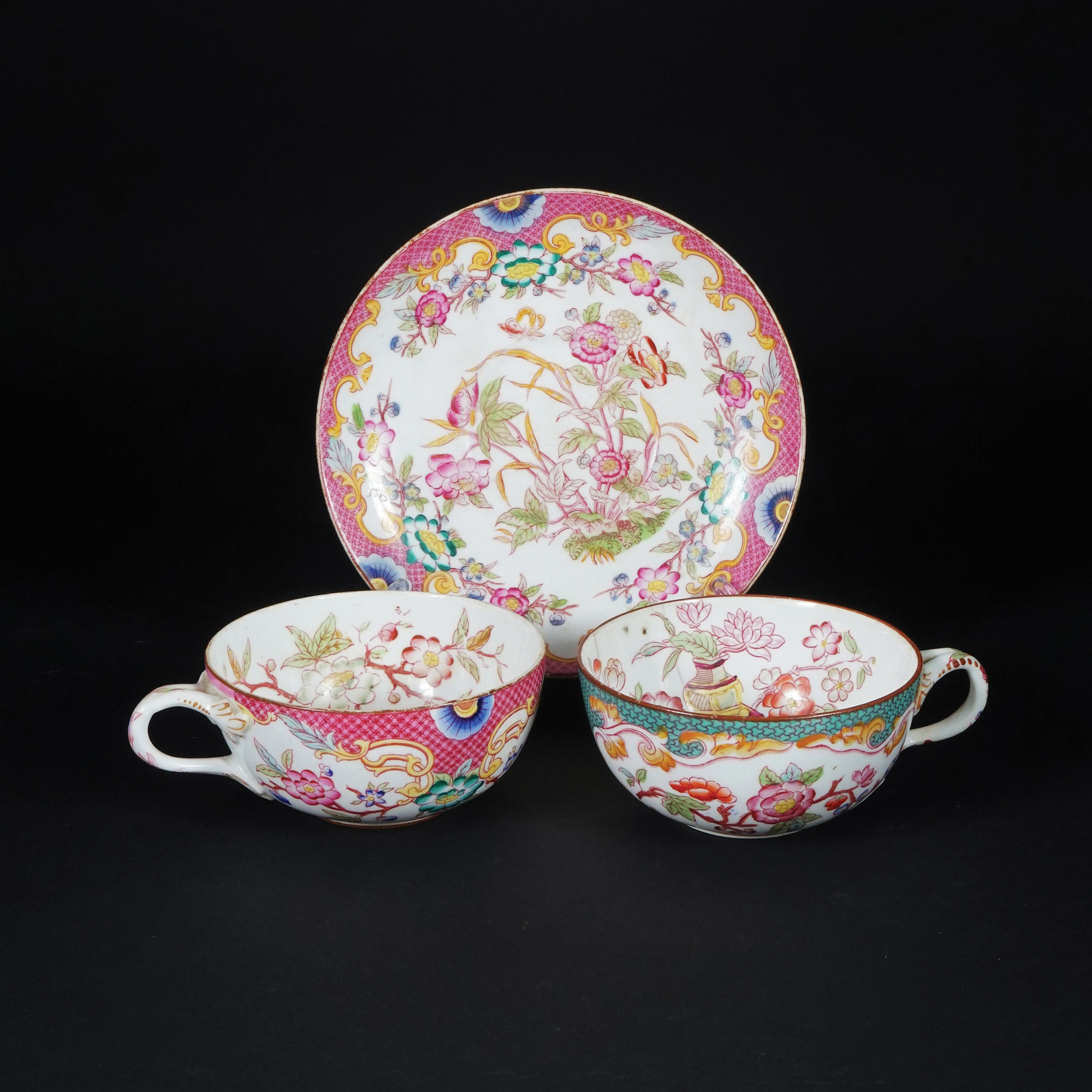 Utzschneider&Co., fine del XIX secolo, marca di fabbrica e numeri dipinti in rosso con le lettere "TB" incusse sotto il piattino, la tazza: cm. 3,7x4,5; il piattino: d. cm. 9,5, UNITA ad altra detta di differente cromia (felata)