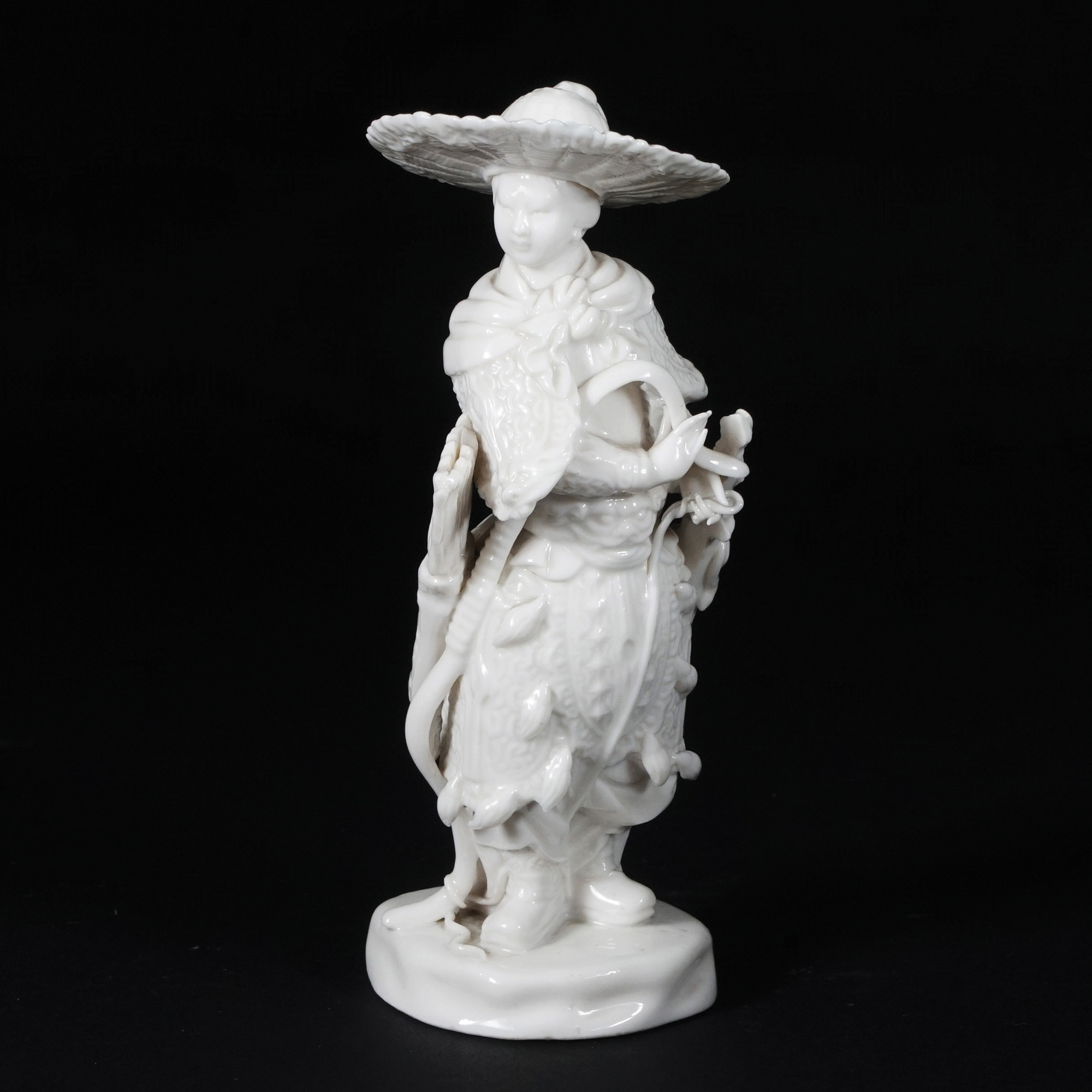 Scultura in porcellana policroma raffigurante un guerriero asiatico....