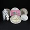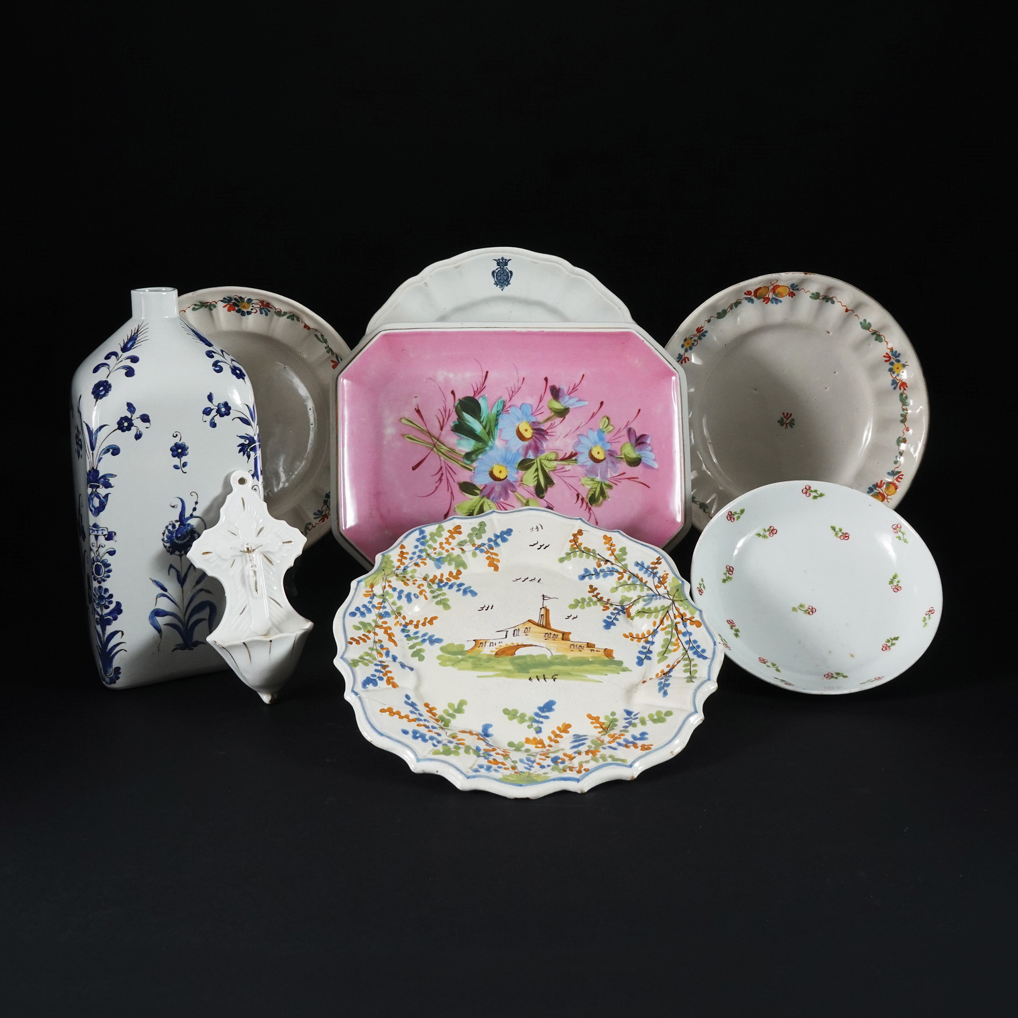 Acquasantiera UNITA a quattro piatti, una bottiglia, un vassoietto rosa, e un piattino in porcellana e maiolica, epoche e misure diverse