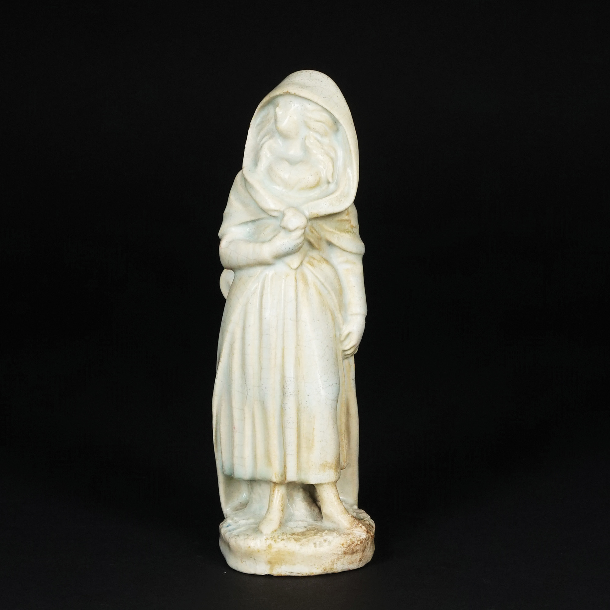 Scultura in porcellana bianca a fondo craquelé raffigurante una donna della borghesia in abiti popolareschi, da un modello di P.Giordano.