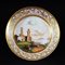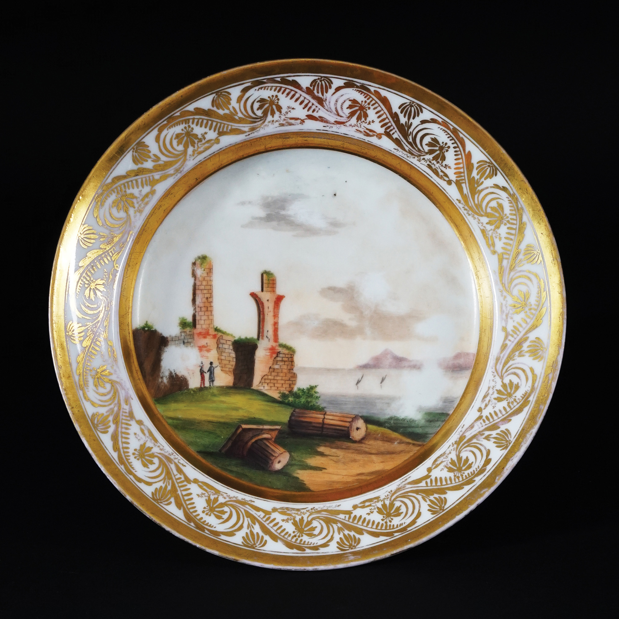 Piatto in porcellana bianca, dorata e policroma dipinto nel cavetto a raffigurare un paesaggio con rovine nei pressi di Selinunte.