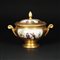 Zuccheriera con coperchio in porcellana dorata e policroma, finemente dipinta...