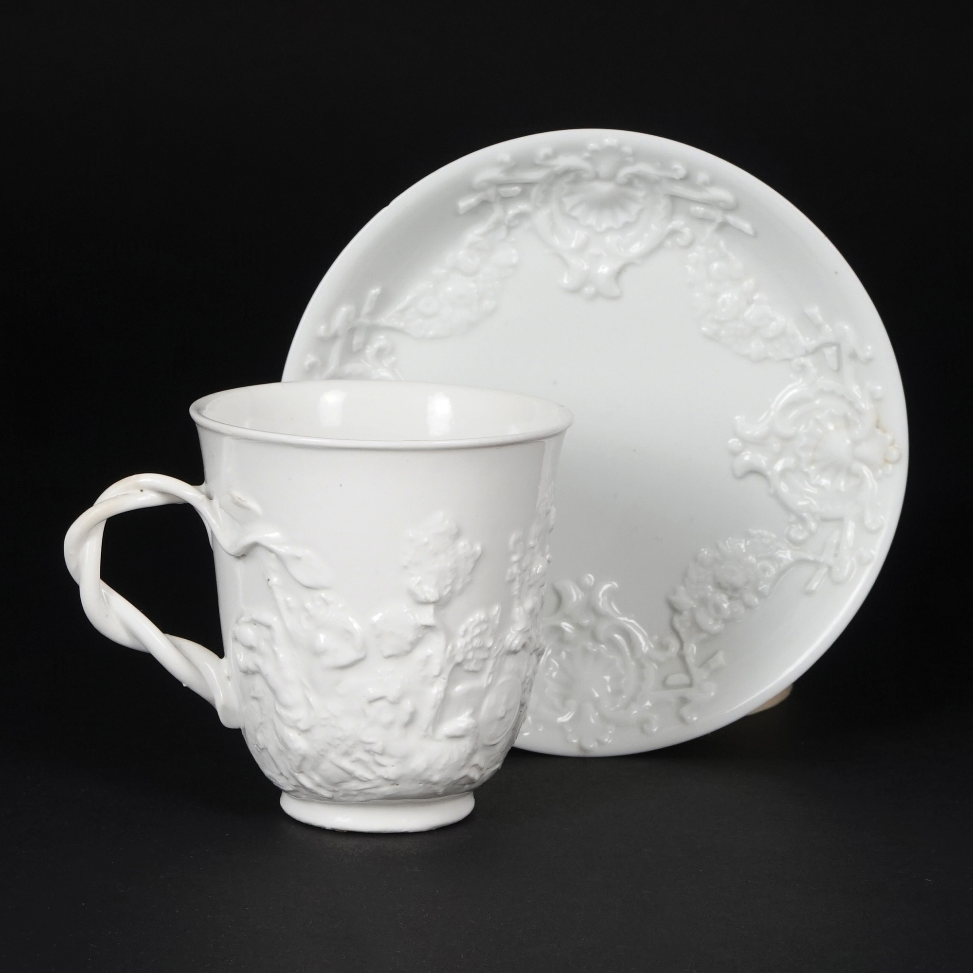 Tazza con piatto in porcellana bianca modellata in rilievo a scene mitologiche; il piatto ospita un ricco motivo a valve di conchiglia alternate a festoni floreali. Presa a doppio ramoscello intrecciato.