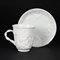 Tazza con piatto in porcellana bianca modellata in rilievo a scene...