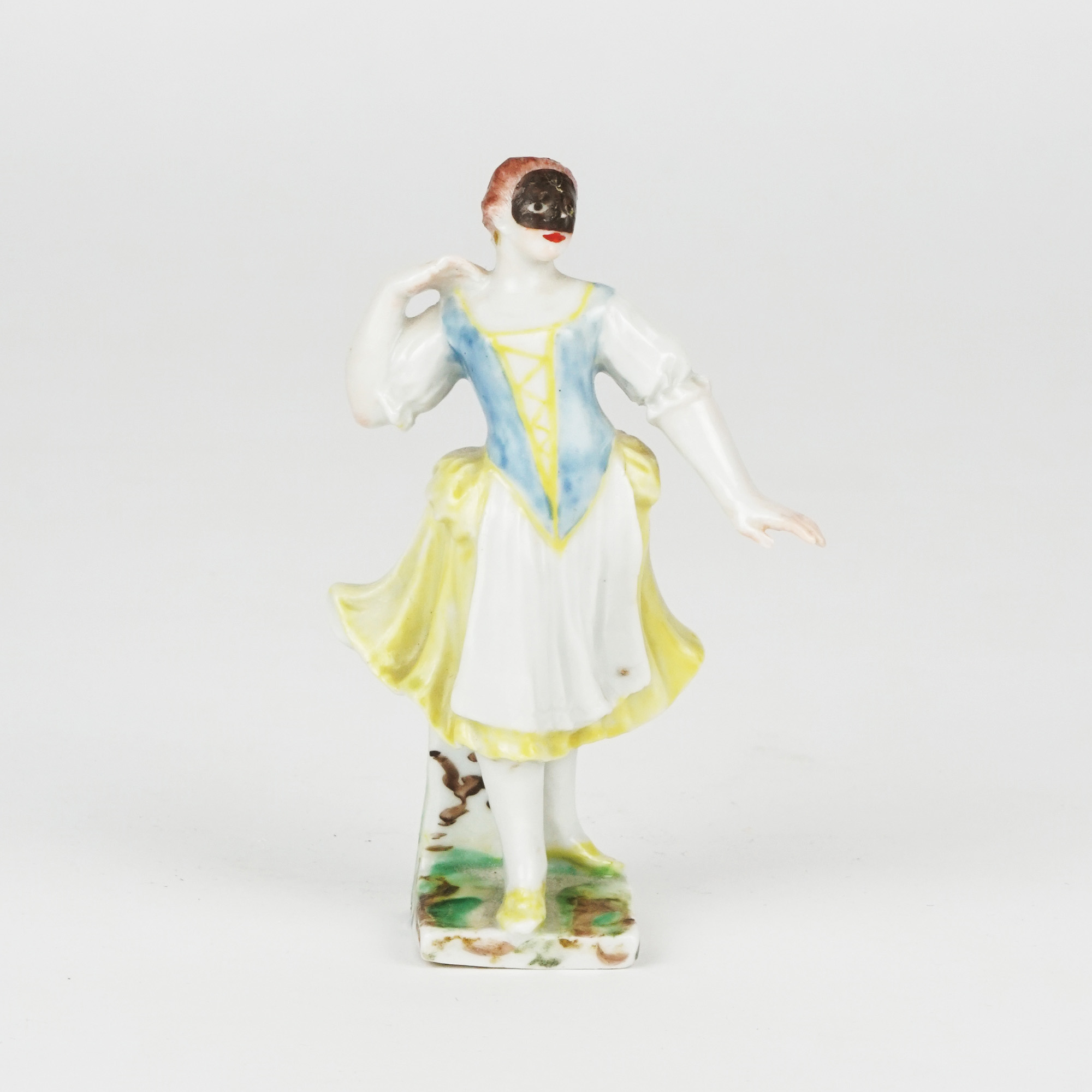 Scultura in porcellana policroma raffigurante una figura femminile con maschera.