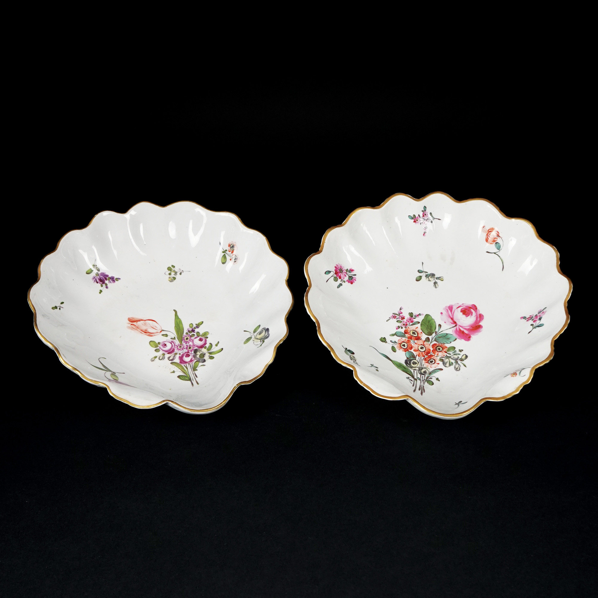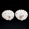 Coppia di antipastiere in porcellana bianca e policroma in forma di conchiglia dipinte a composizioni floreali sparse e fiorellini recisi.