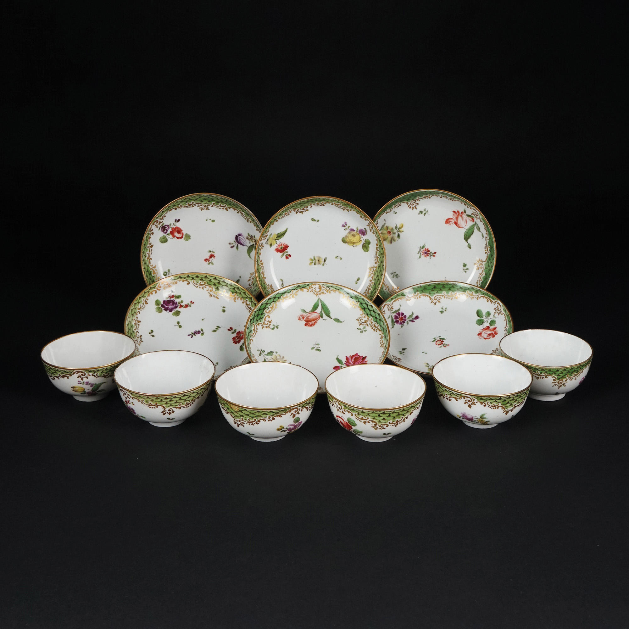 Sei tazze con piatto in porcellana bianca e dorata, decorata in policromia a fiori recisi; profilo del bordo dipinto a squame verdi.