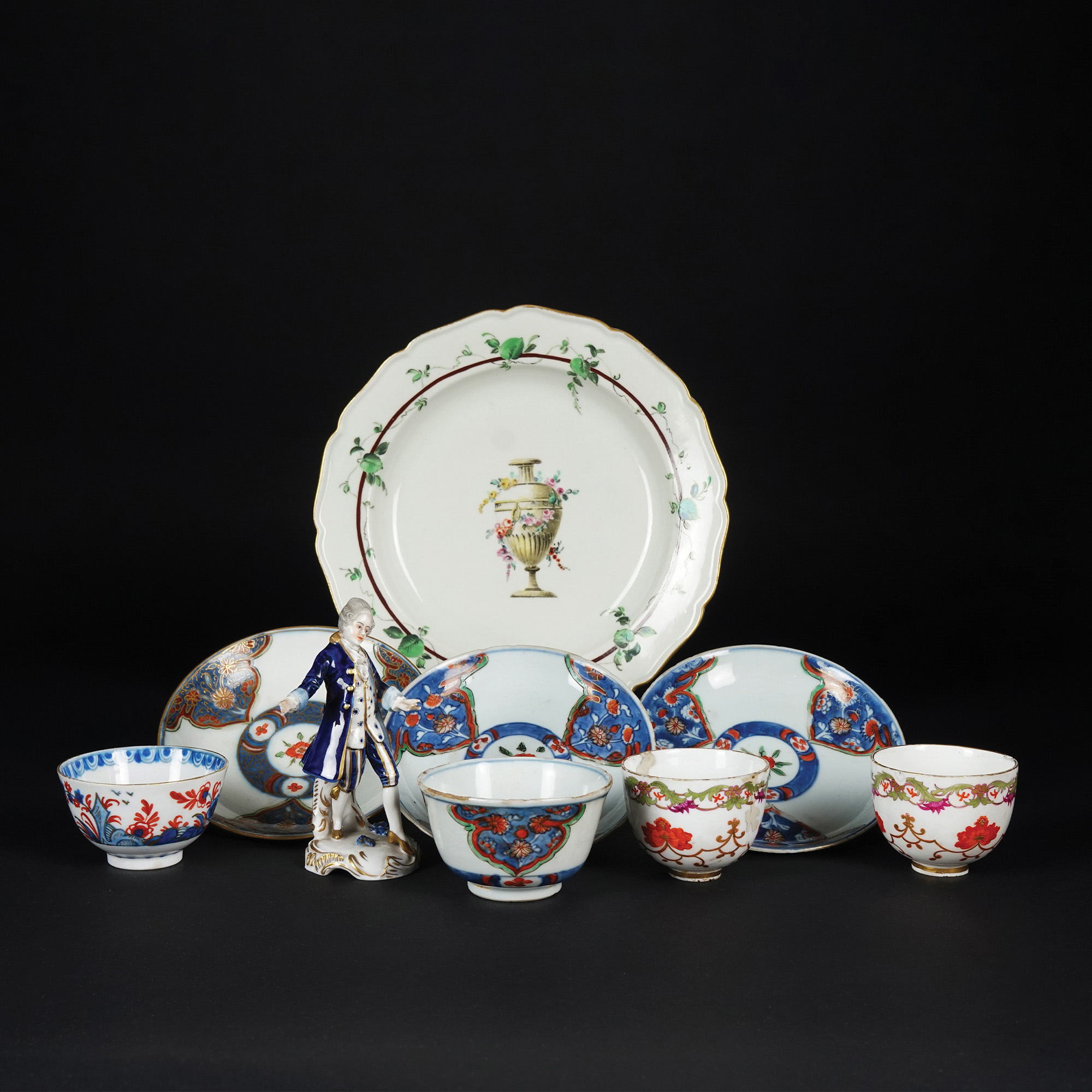 Lotto in porcellana composto da quattro tazzine fra le quali una di Geminiano Cozzi, tre piattini dei quali uno di Ginori, una scultura raffigurante un gentiluomo e un piatto bianco e policromo Worcester circa 1770, la scultura h. cm. 12, il piatto d. cm. 22 (difetti e restauri)