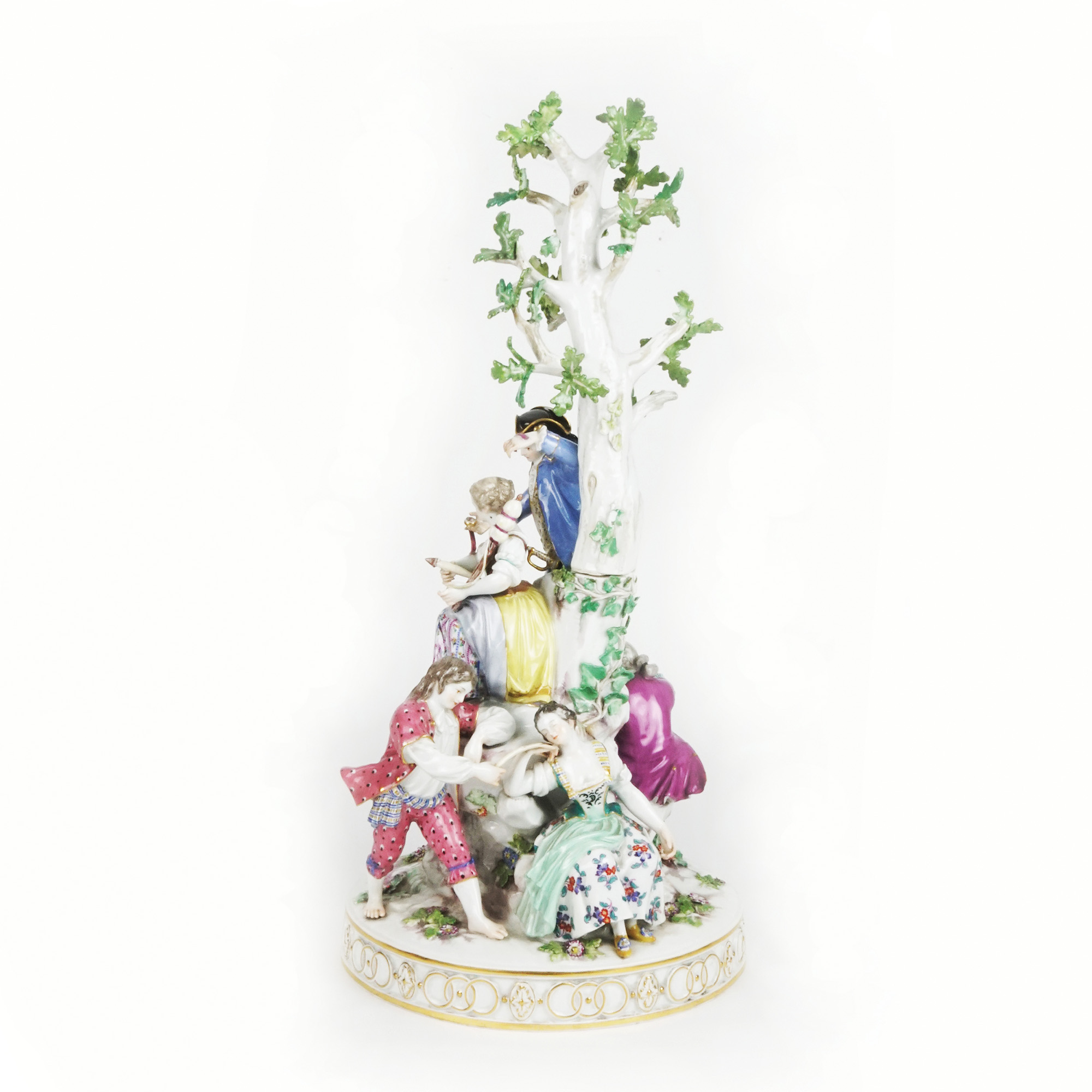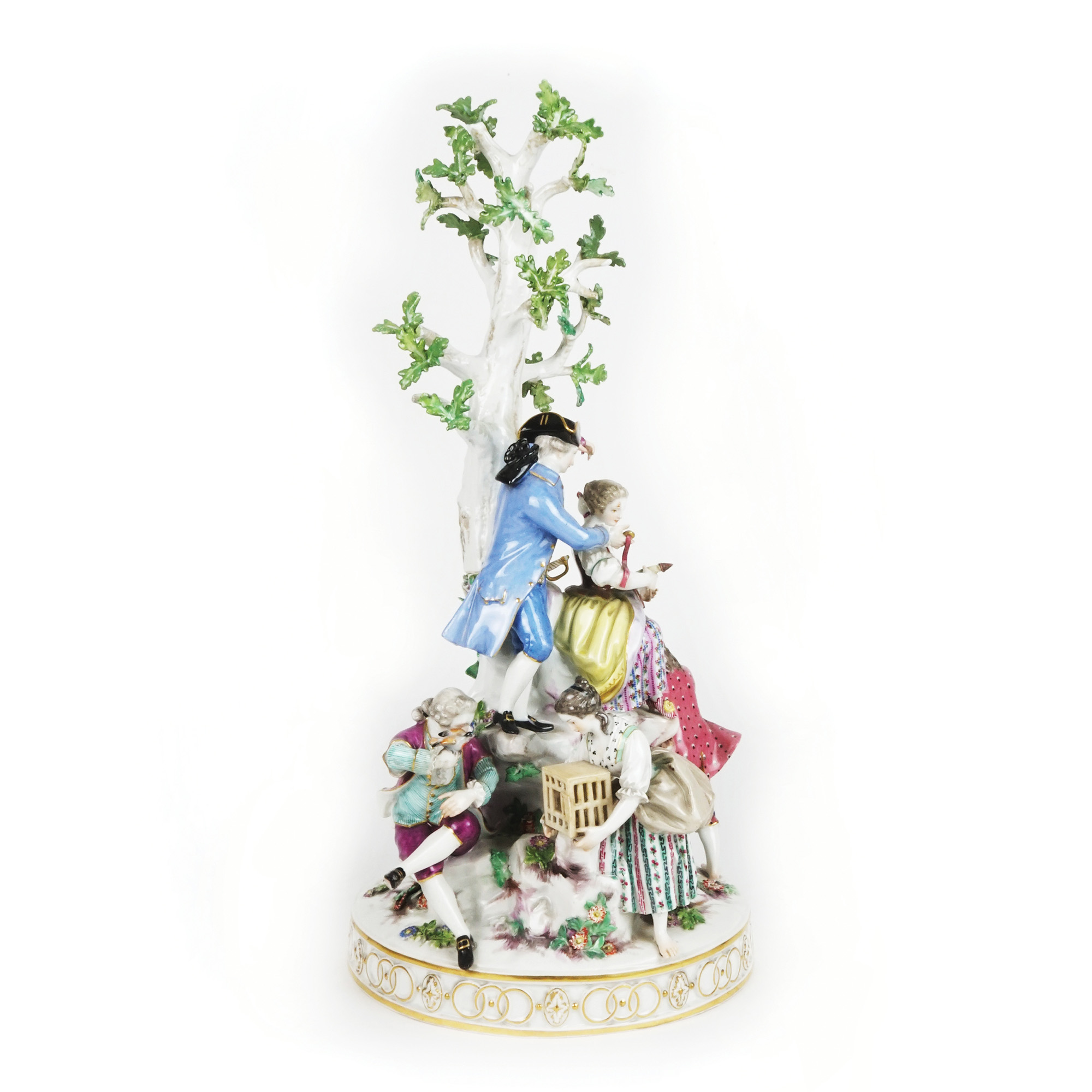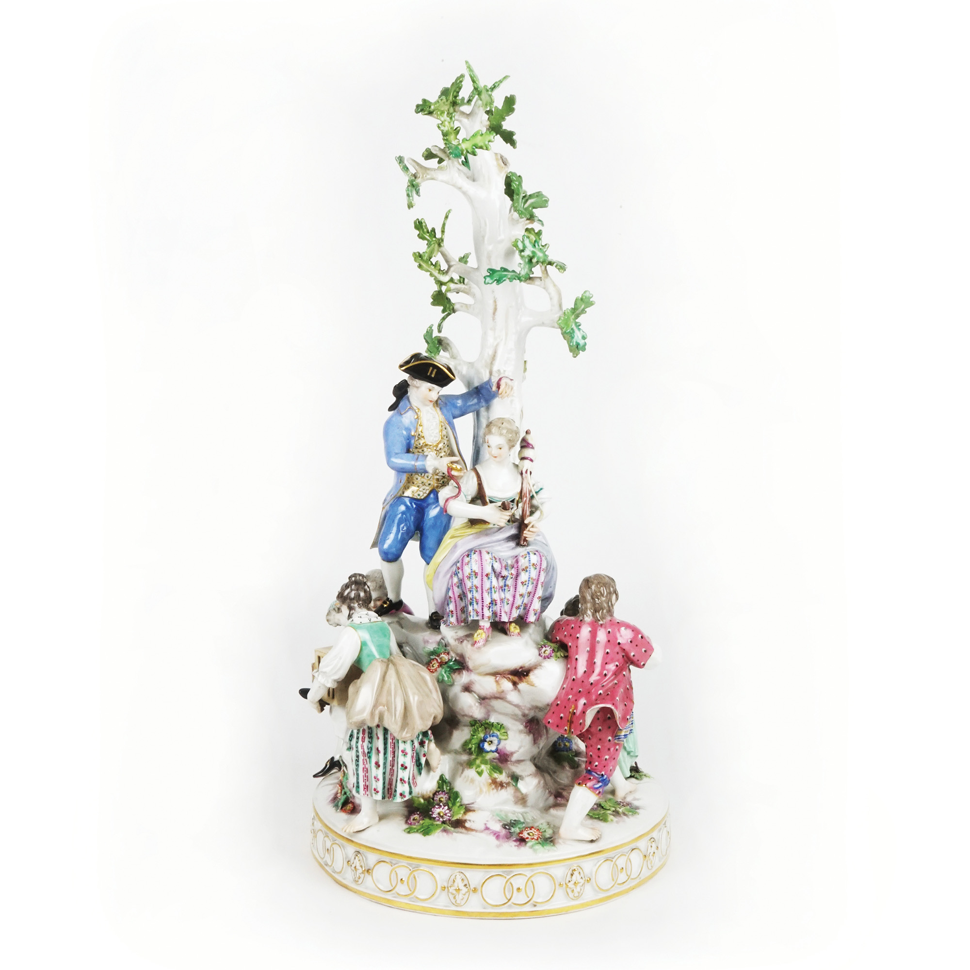 Grande gruppo in porcellana bianca e policroma raffigurante un'Allegoria dell'Amore: tre coppie di giovani si muovono attorno ad un albero colti in diversi atteggiamenti legati al tema della passione amorosa; da un modello di M.V.Acier del 1775.