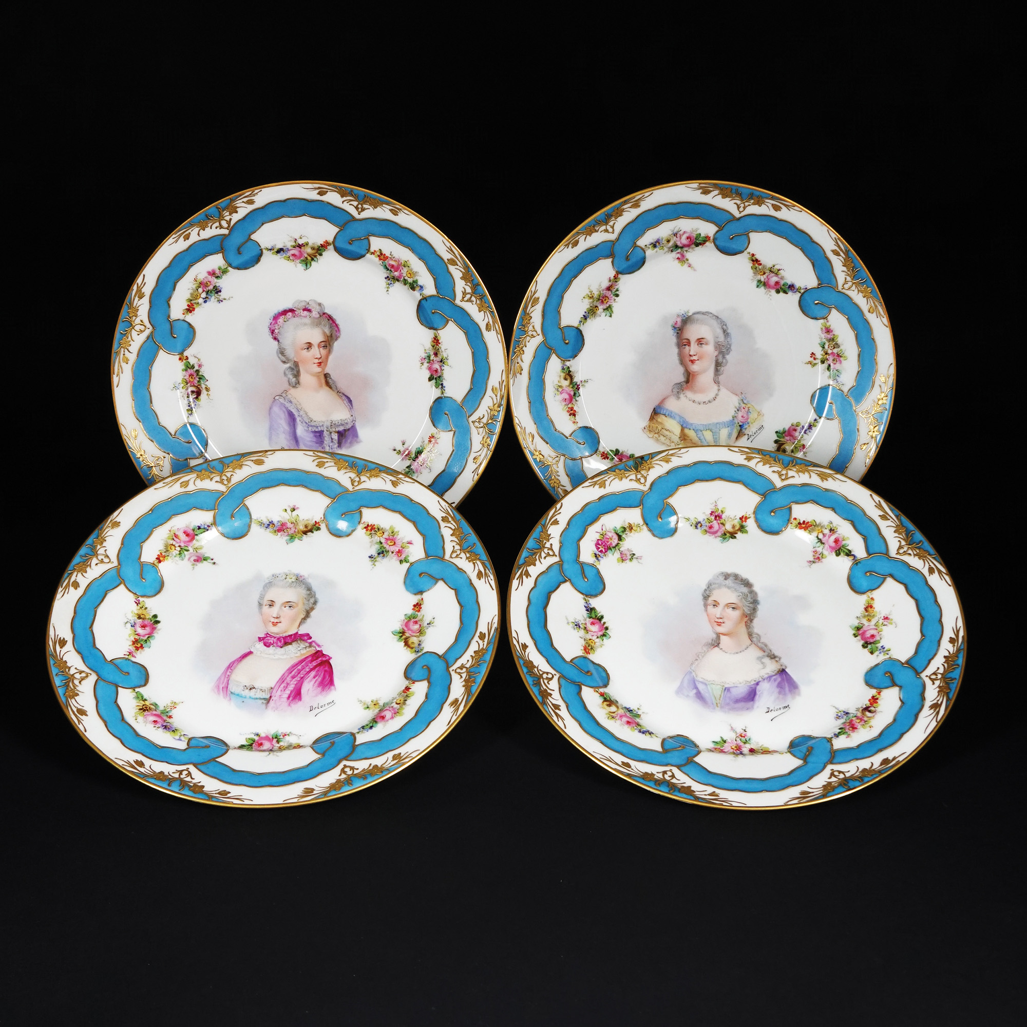 Quattro piatti in porcellana bianca, dorata e policroma, raffiguranti rispettivamente i ritratti di M.me Dubarry, della Viscontessa Dumoulin, di M.me Chouin e di M.me de Chatelet. Ciascun piatto è firmato Delorme.
