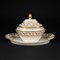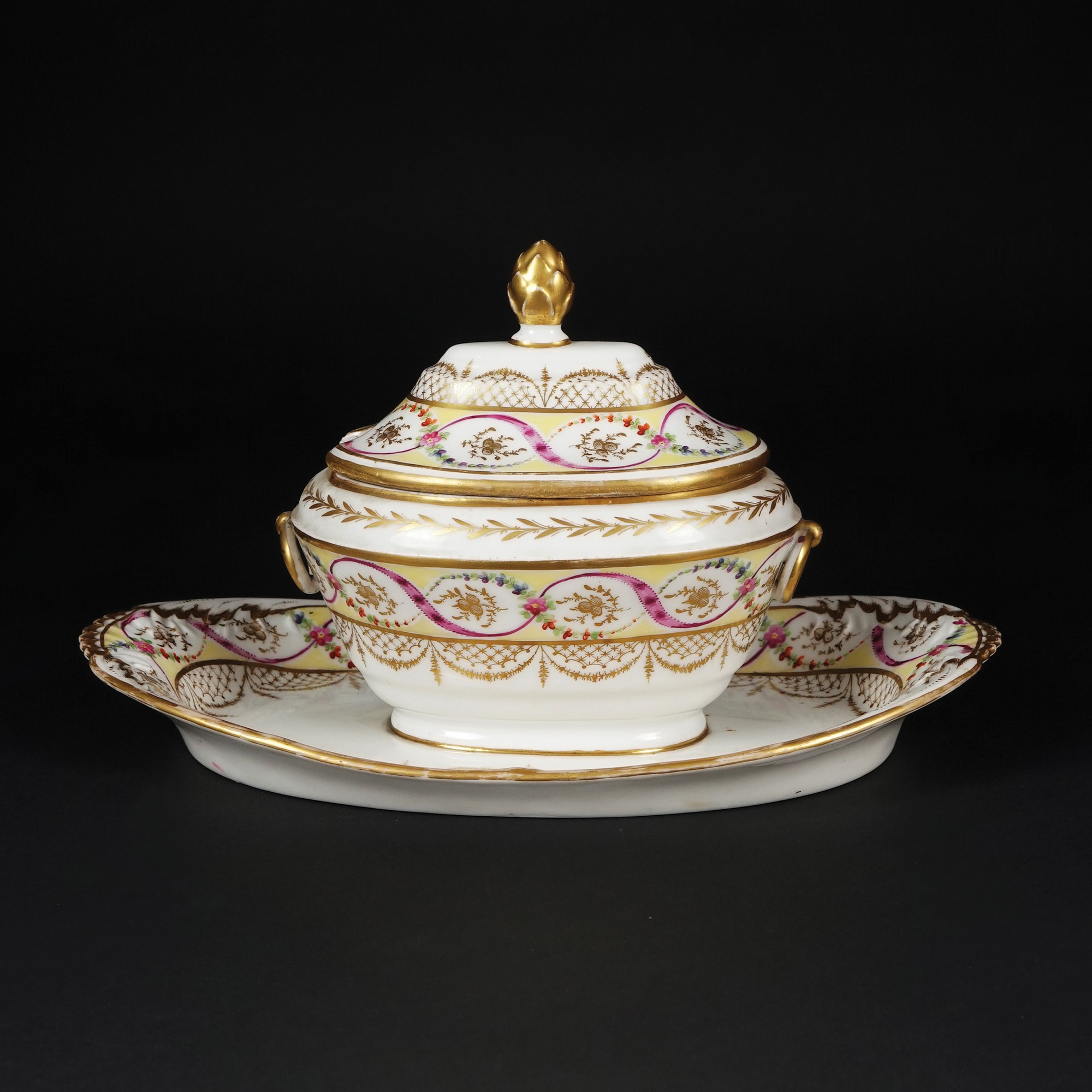 Salsiera in porcellana bianca, dorata e policroma dipinta a raffinati motivi a tendina e nastrini incrociati in parte formati da composizioni floreali. Corpo ovale con prese simulate ad anello; presa del coperchio in forma di pigna.