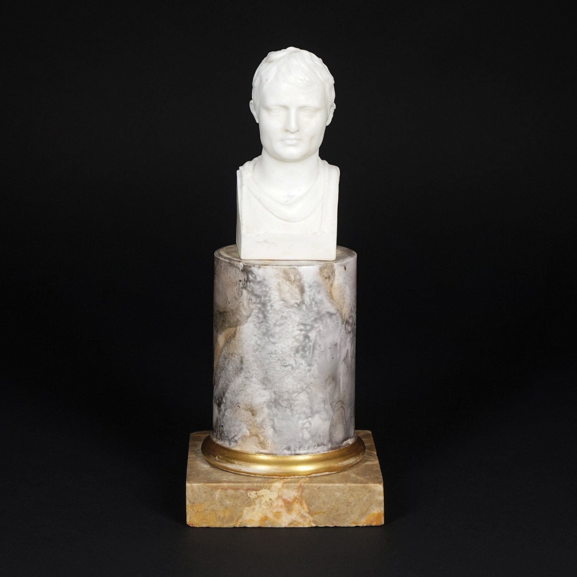 Scultura in biscuit raffigurante il busto di Napoleone; poggiante su una colonna in porcellana dipinta a finto marmo su piede quadrato in marmo.