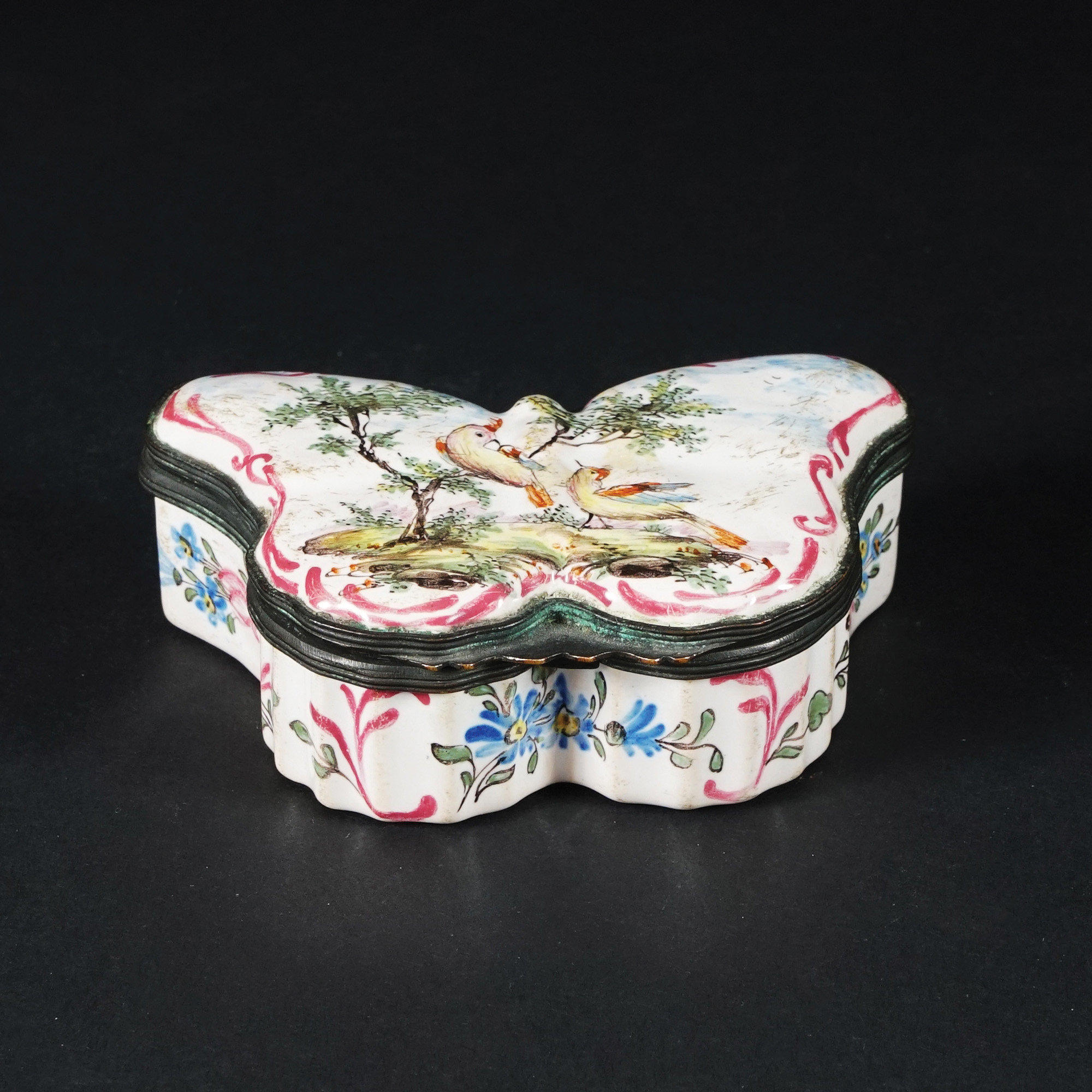 Scatola in maiolica bianca e policroma in forma di farfalla dipinta sul coperchio a raffigurare un paesaggio con volatili; sulle pareti a composizioni floreali.