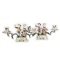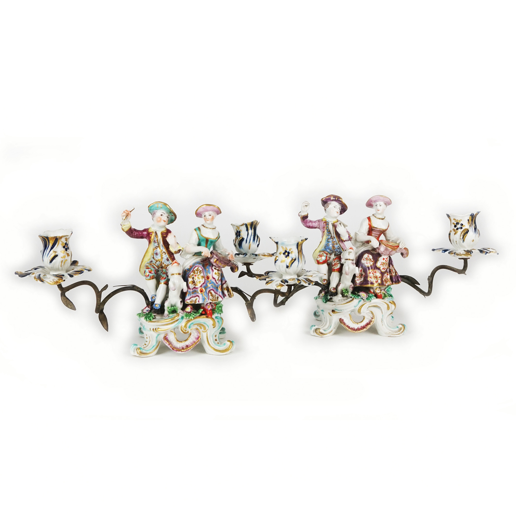 Coppia di doppieri in porcellana bianca, policroma e dorata modellati a raffigurare una coppia di innamorati seduti su tronchi simulati con un cane; due bobèches a bocciolo.