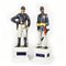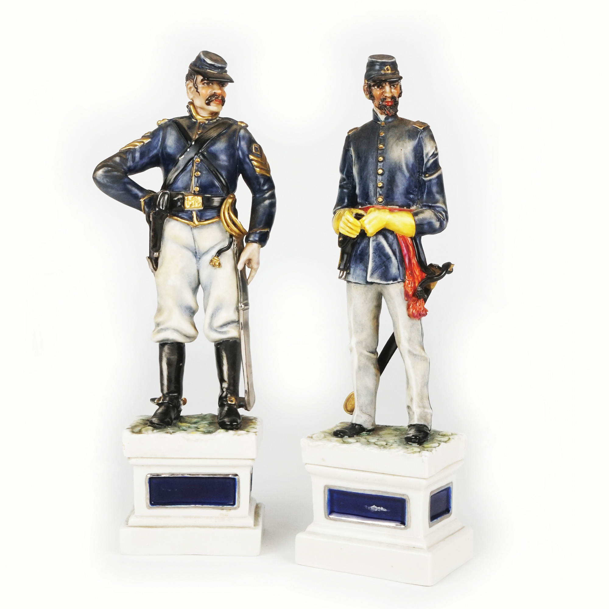 Due sculture in porcellana policroma raffiguranti ciascuna un soldato della cavalleria e della fanteria americana.