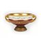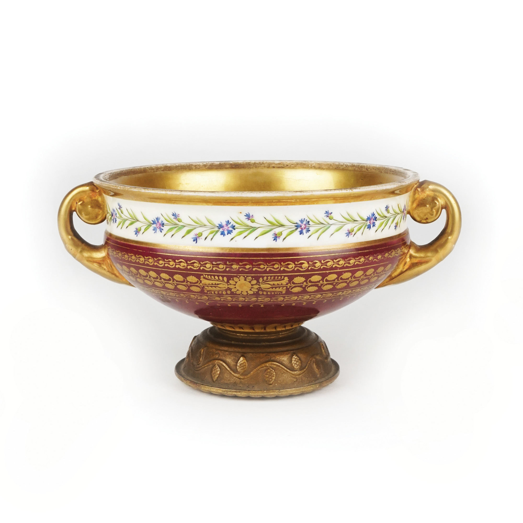 Coppa biansata in porcellana bianca, rosso bordeaux e dorata; una cornice di fiordalisi anticipa il bordo lievemente everso; due anse a ricciolo.