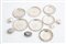 Sette piattini e cinque scatole portapillole in argento, gr. 325 ca. complessivi. XX secolo.