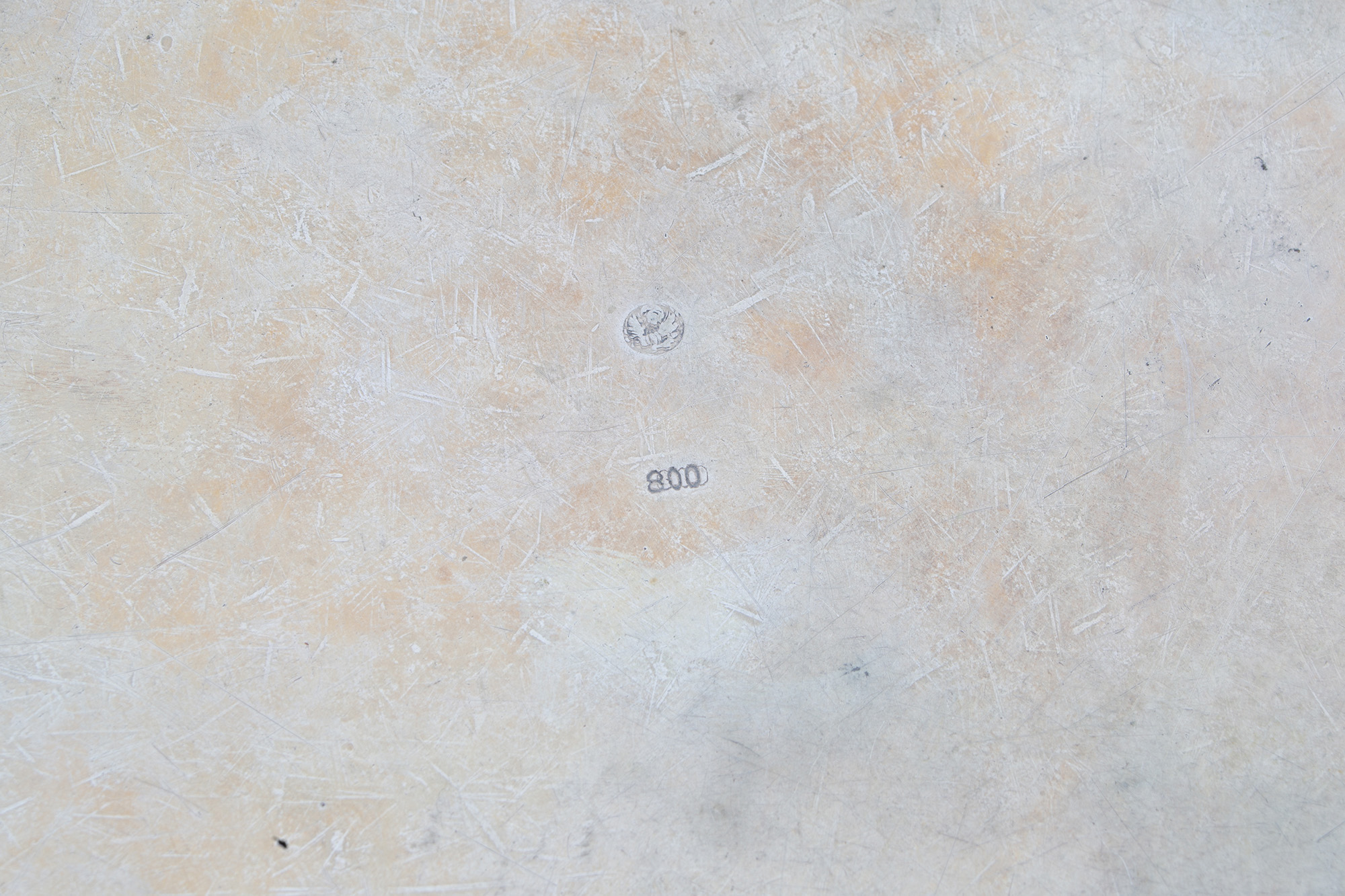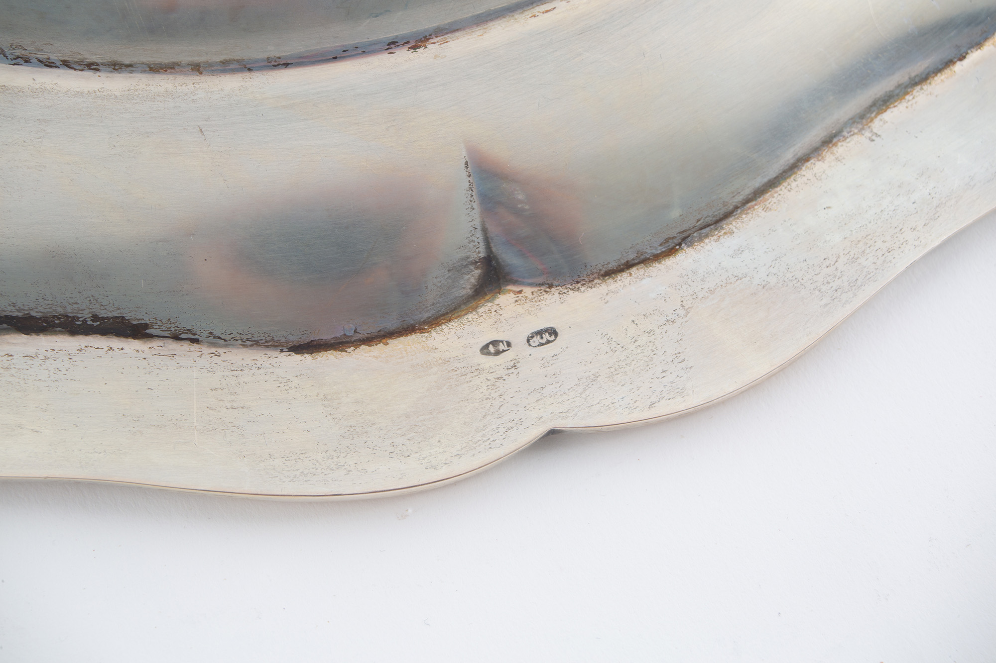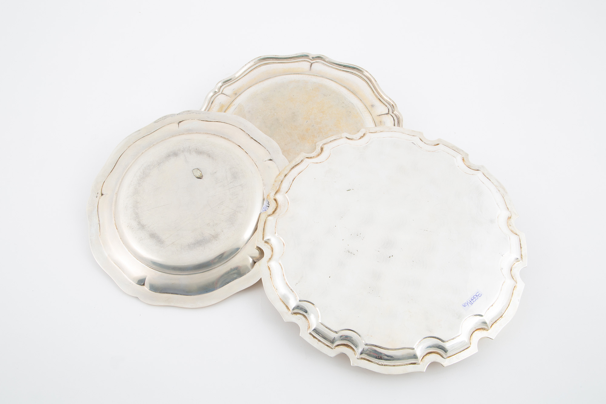 Tre piatti rotondi in argento 800 con bordi polilobati, gr. 2170 ca. complessivi. Inizi XX secolo. Misure varie. Mis. diam. massimo cm. 34.