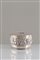 Ciotola con coperchio in argento 800 finemente cesellato e decorato con frutti, gr. 935 ca. XX secolo. Mis. Alt. cm. 14 Diam. cm. 20 ca.