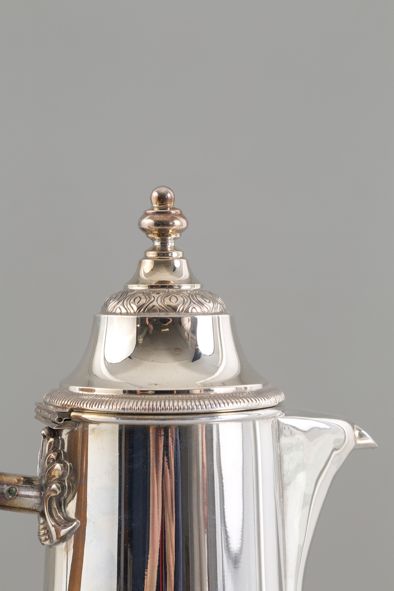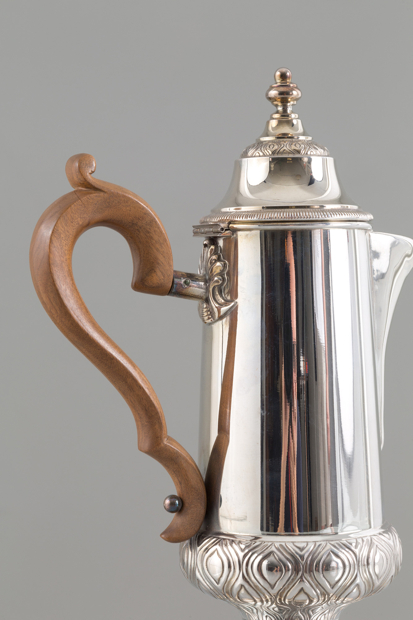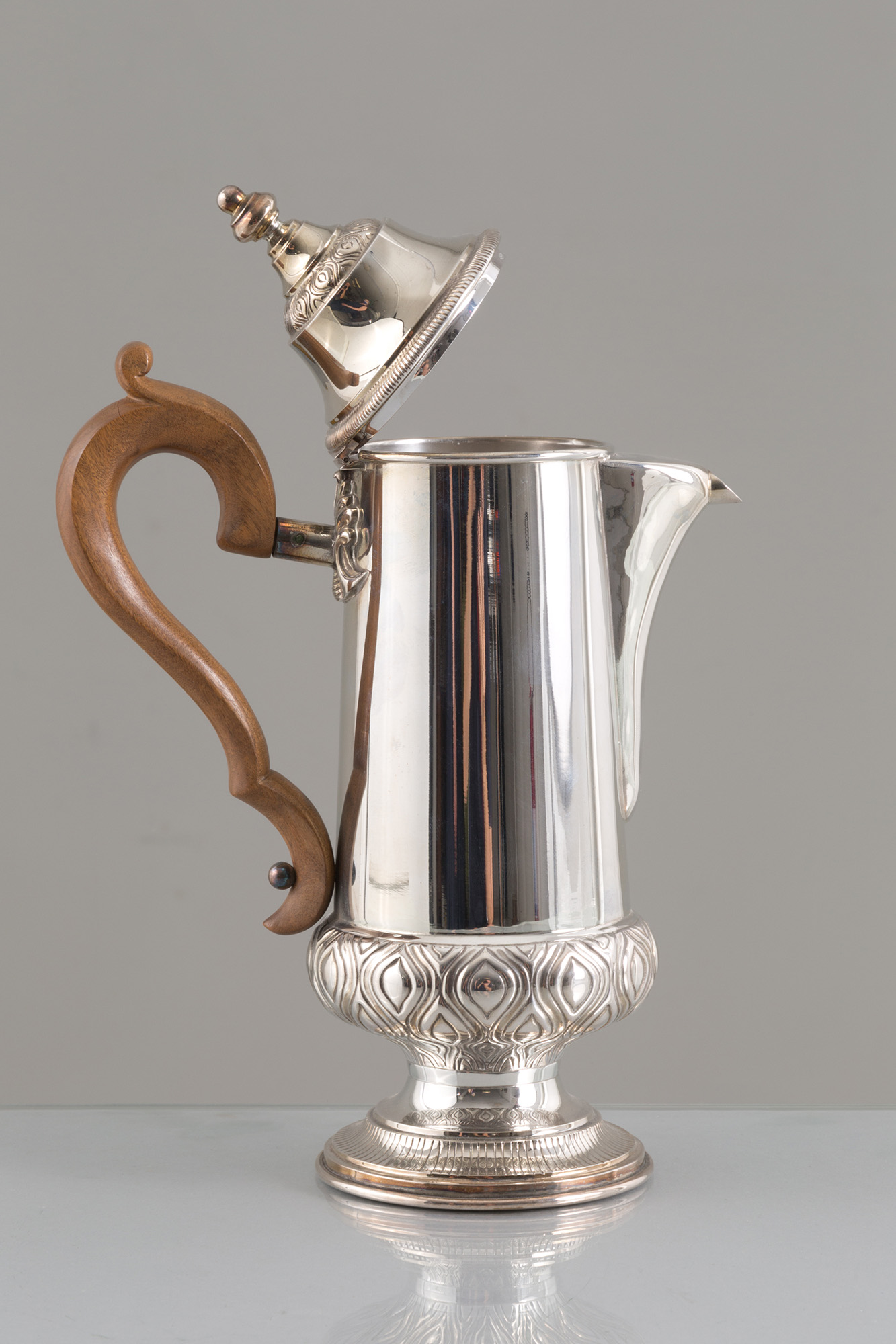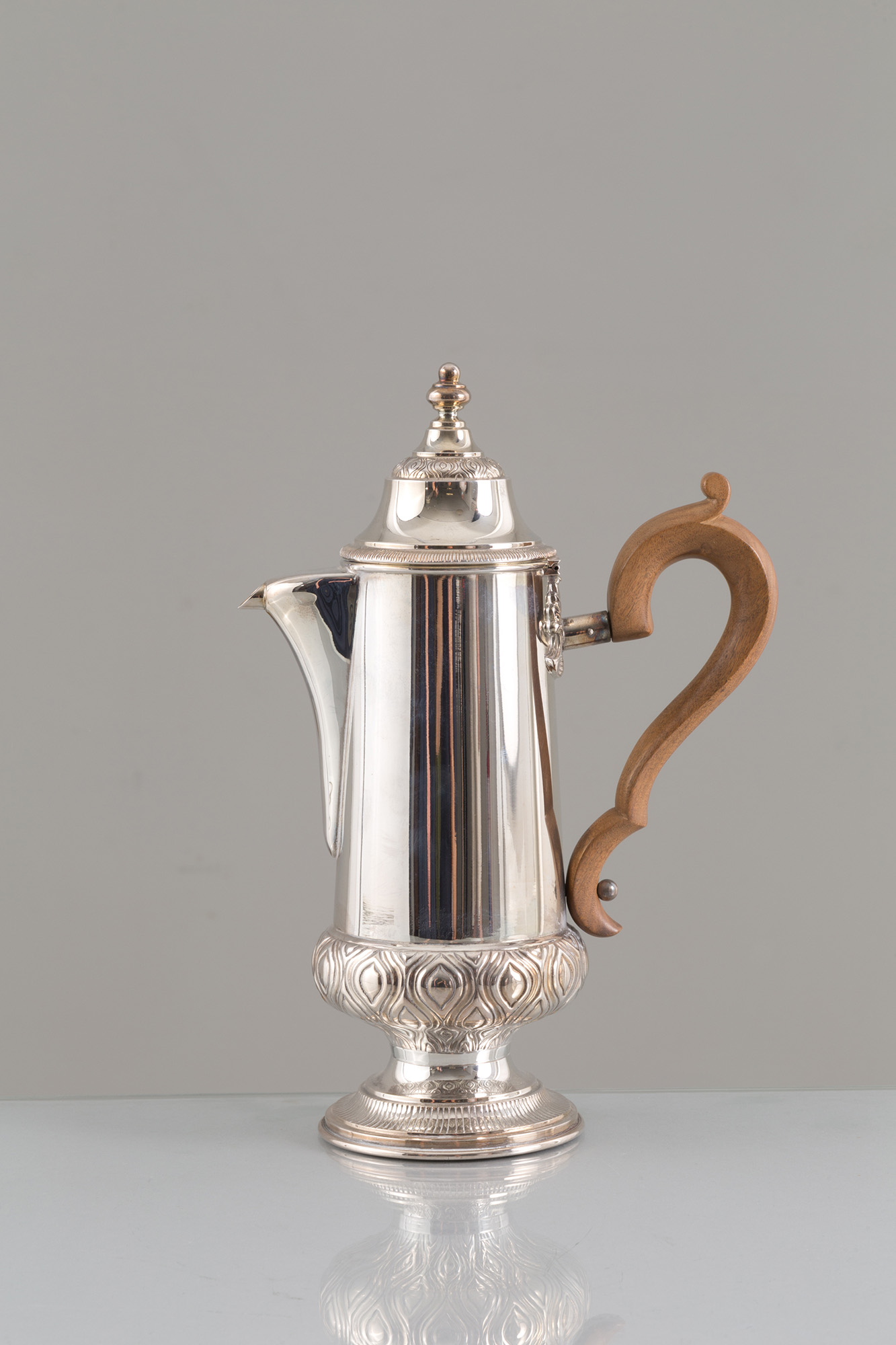 Caffettiera in argento 800 con manico in legno, gr. 550 ca. XX secolo. Mis. Alt. cm. 27 ca.
