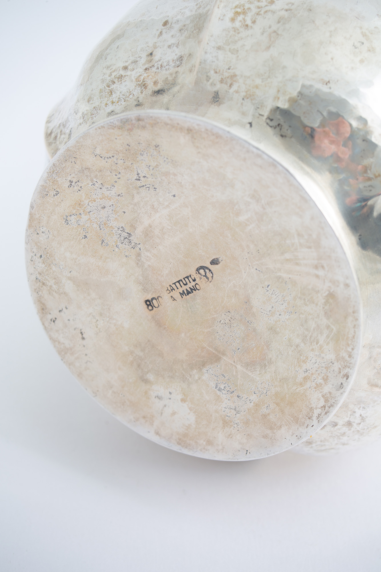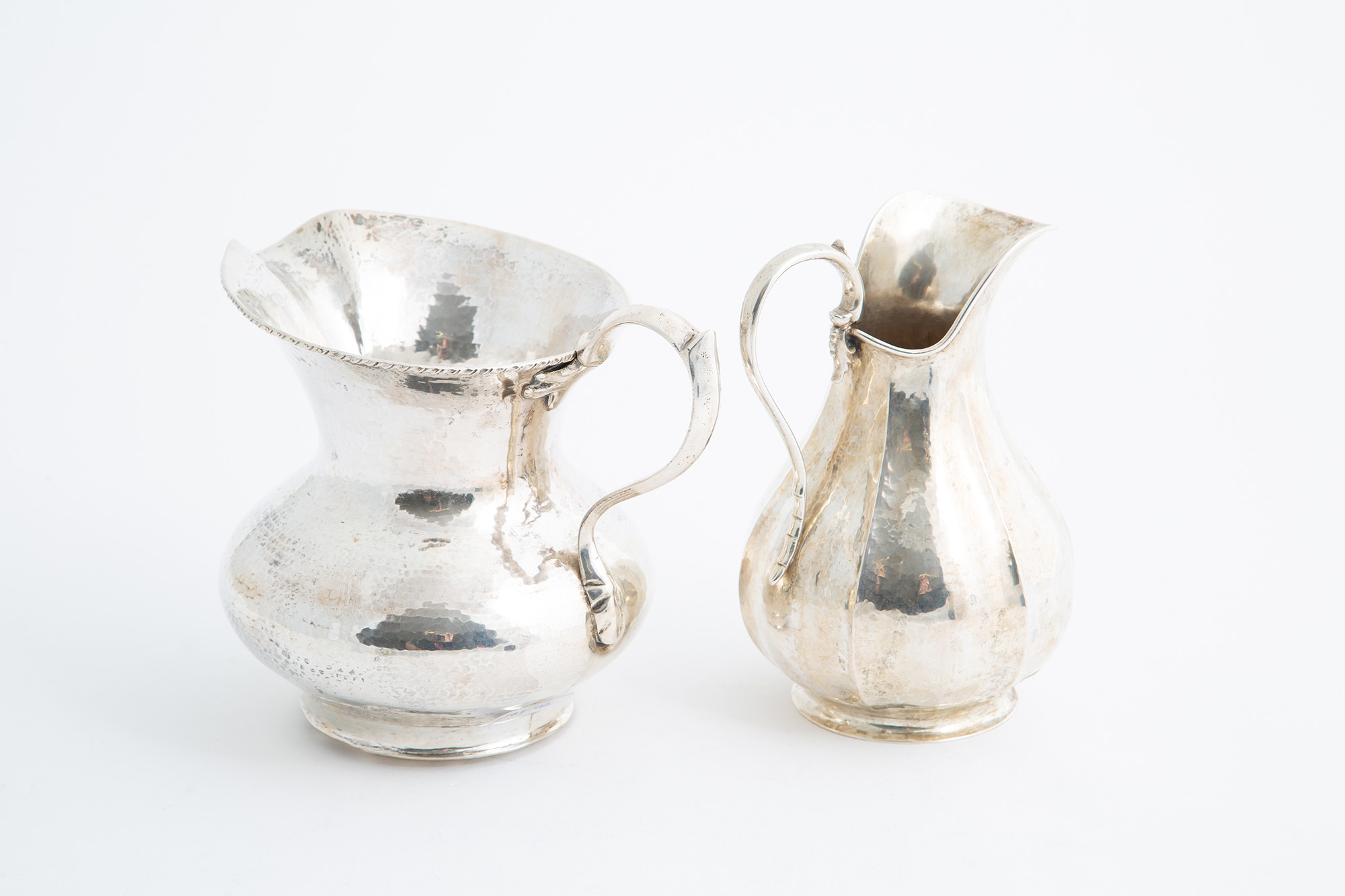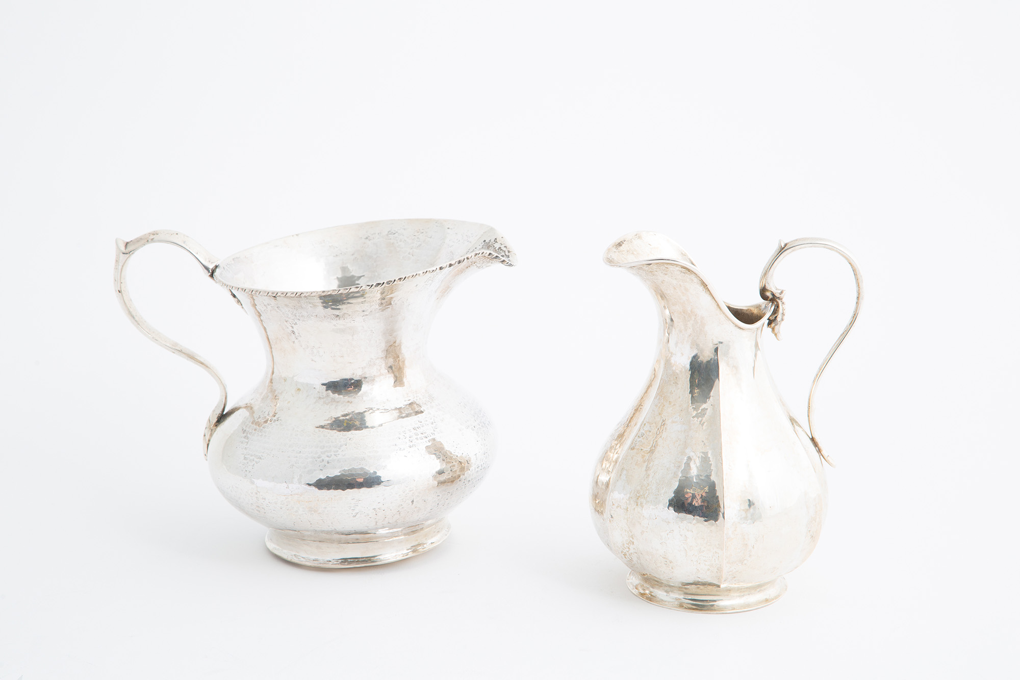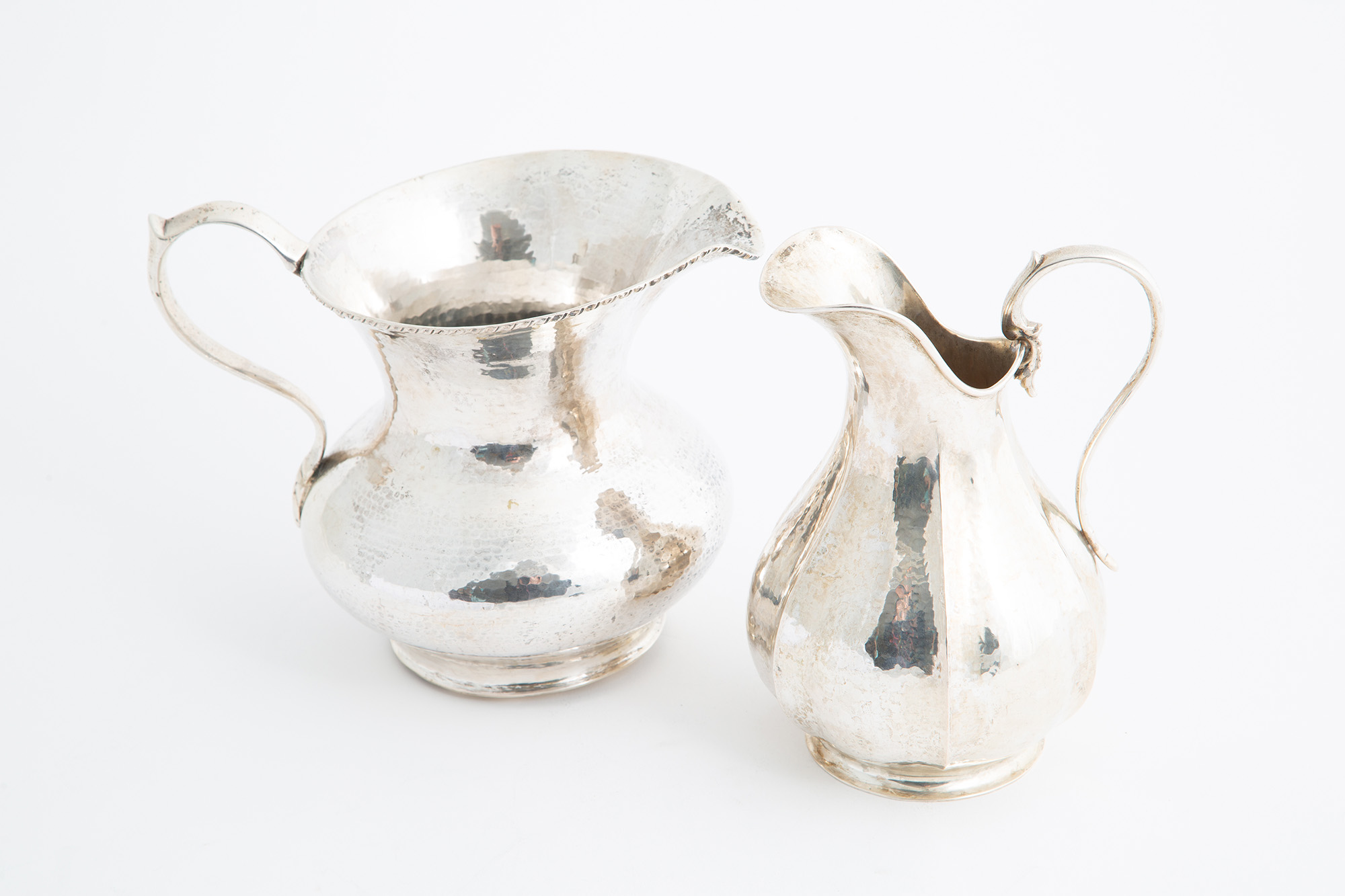 Due versatoi in argento 800 sbalzato, gr. 980 ca. complessivi. Punzoni sul fondo. XX secolo.