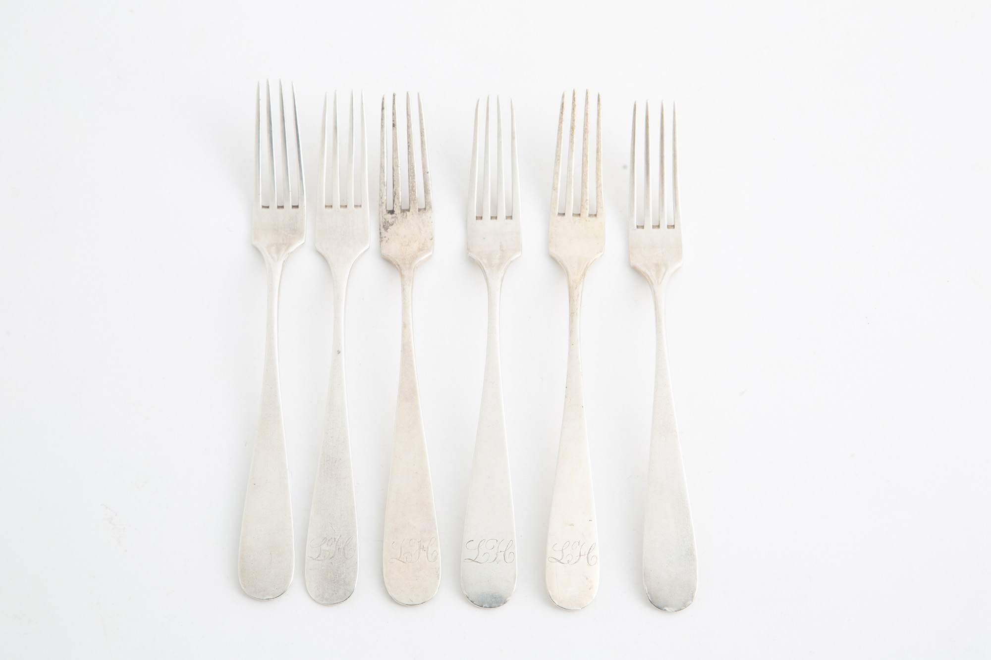 Sei forchette in argento, gr. 315 ca. complessivi. Punzoni MILANO. XIX secolo.