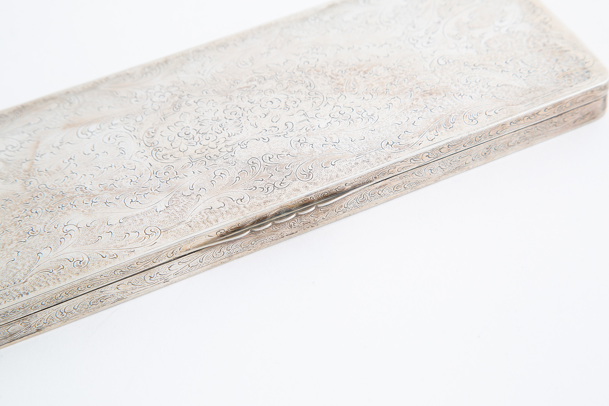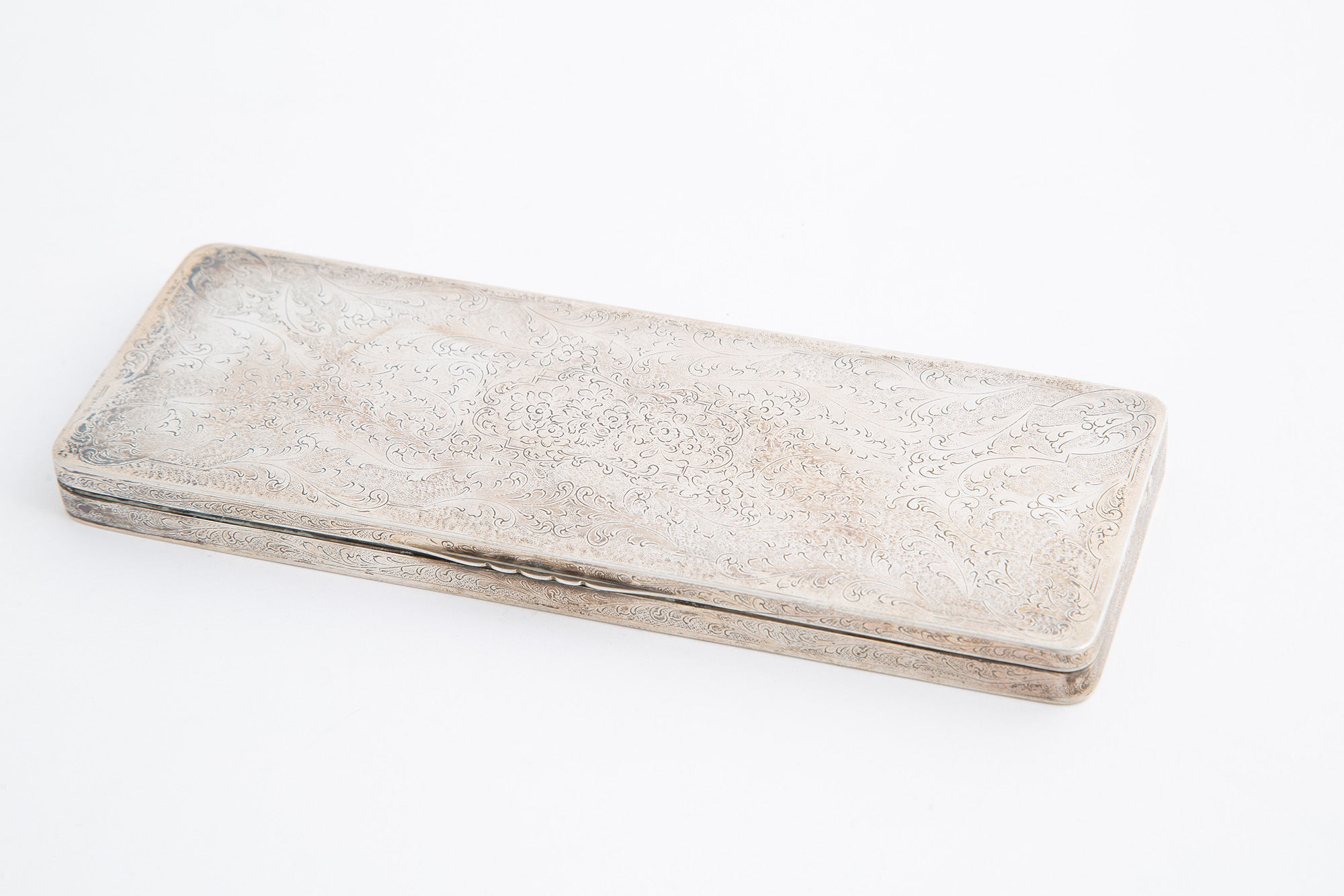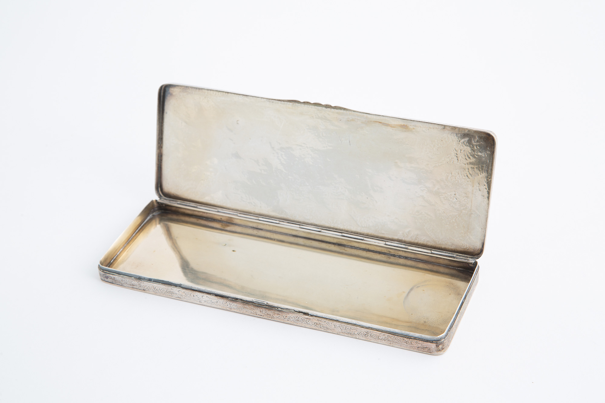 Scatola portapenne in argento cesellato, gr. 305 ca. Fine XIX secolo.