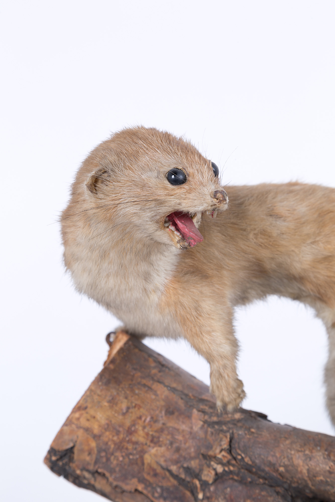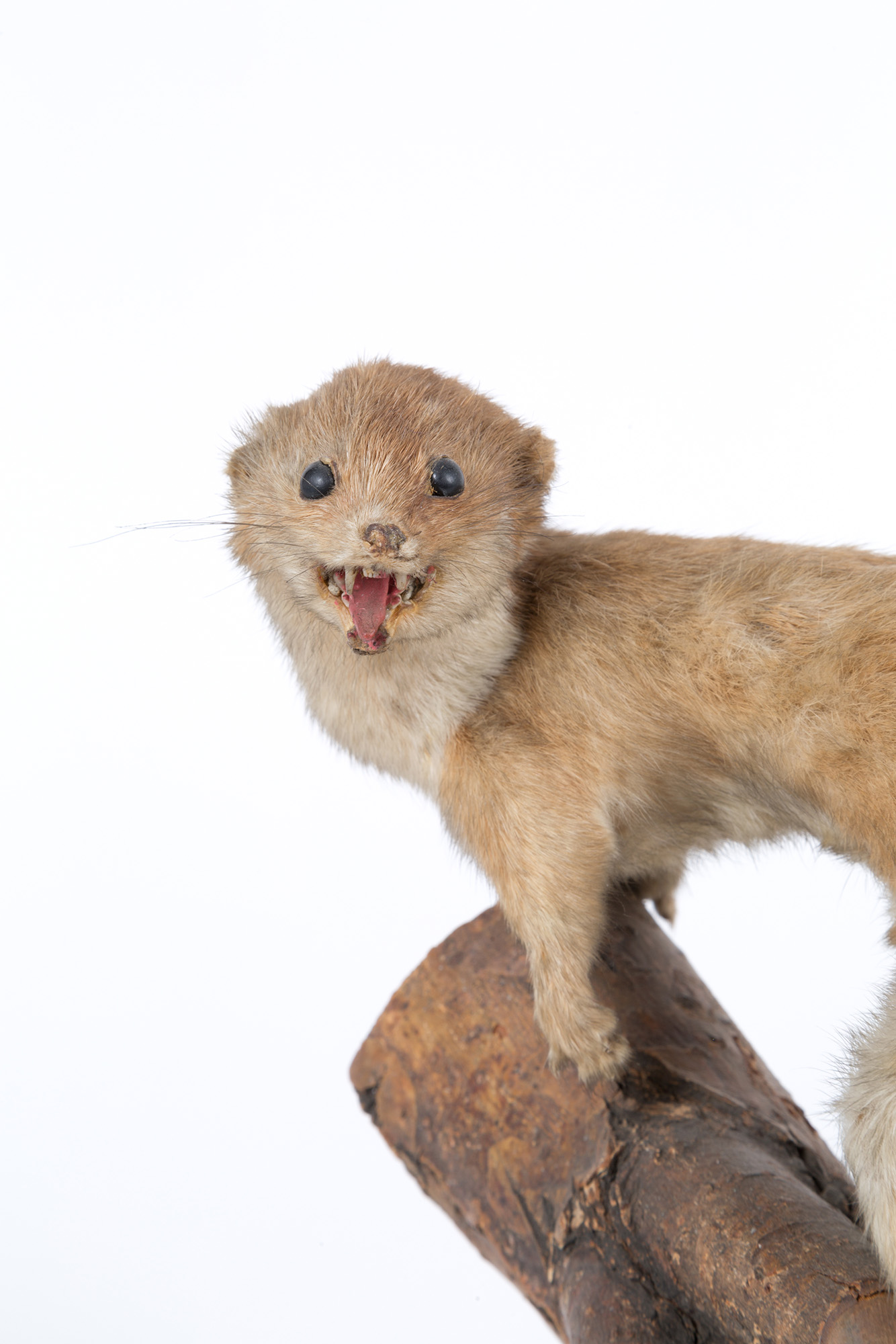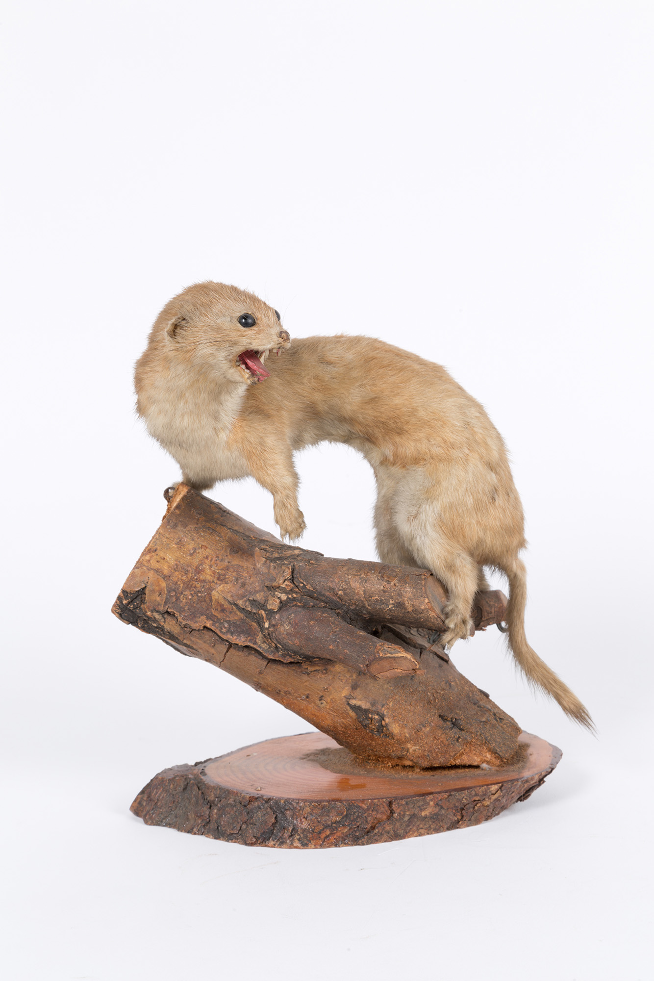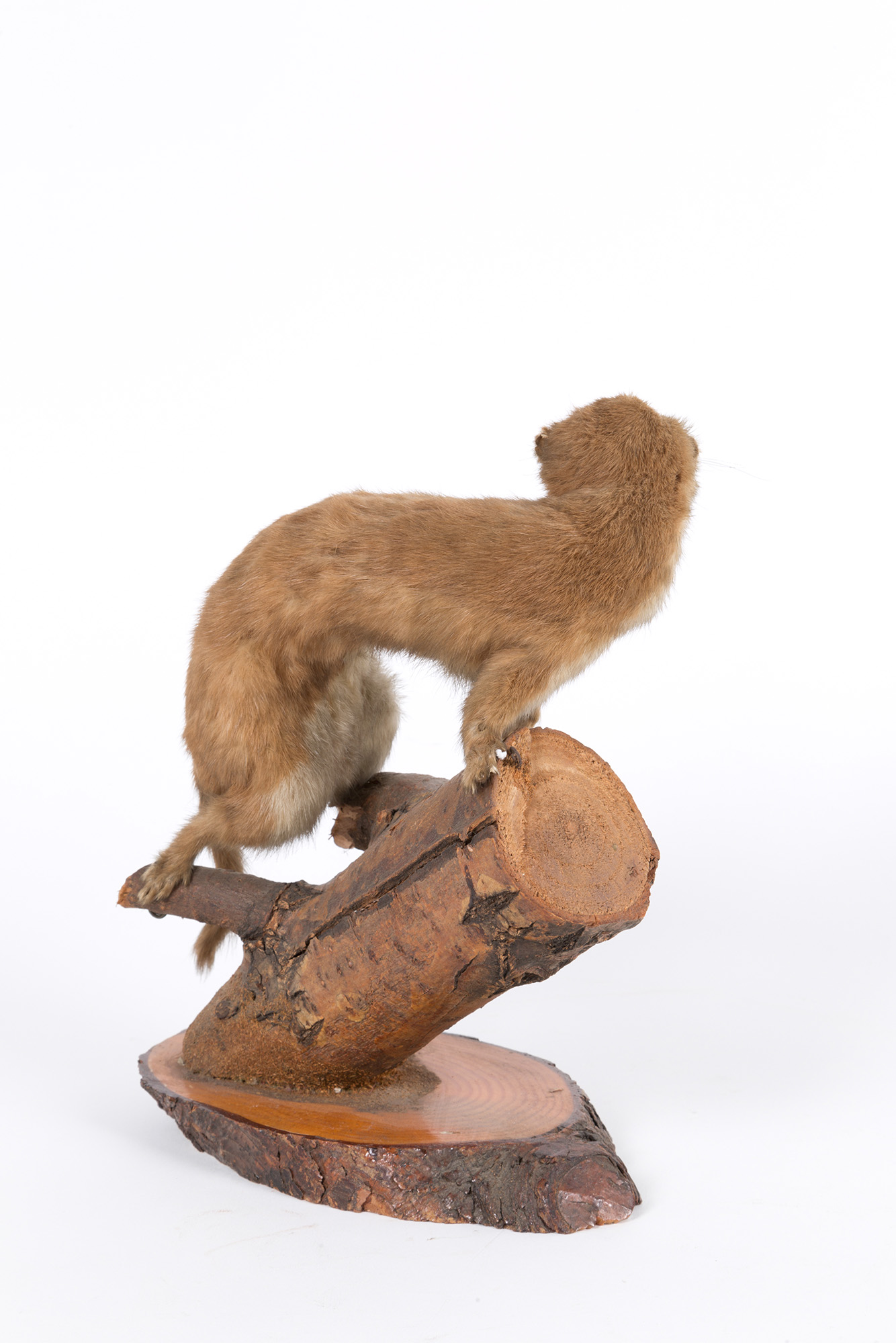 Ermellino (Mustela erminea) tassidermizzato e poggiato su un tronco. Mis. Lung. cm. 20 Alt. cm. 22 Prof. cm. 10 ca.