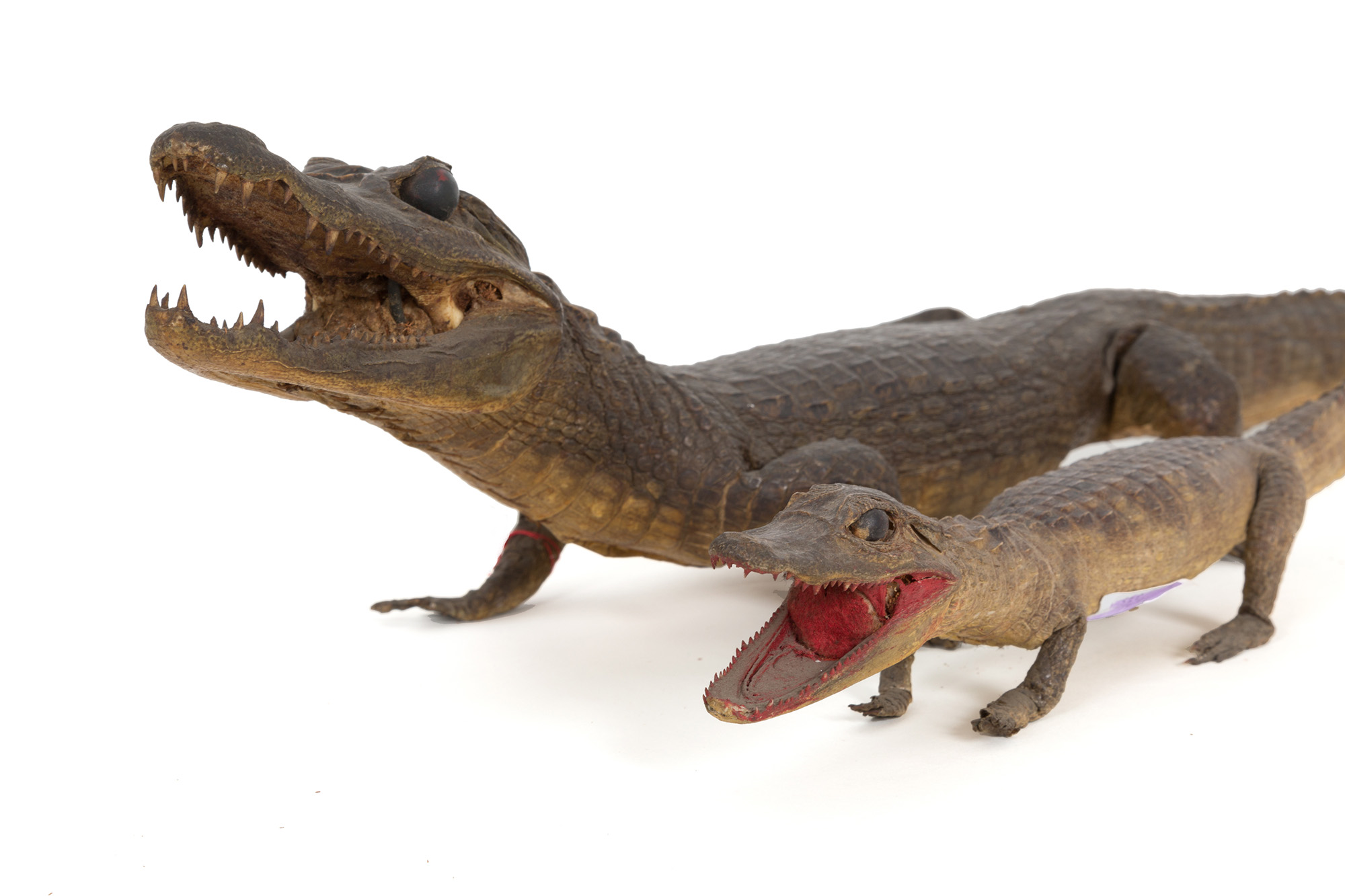 Due coccodrilli acuti americani (Crocodylus acutus) tassidermizzati. Con certificato CITES. Mis. cm. 14x78x20 ca. e 7x49x7 ca.