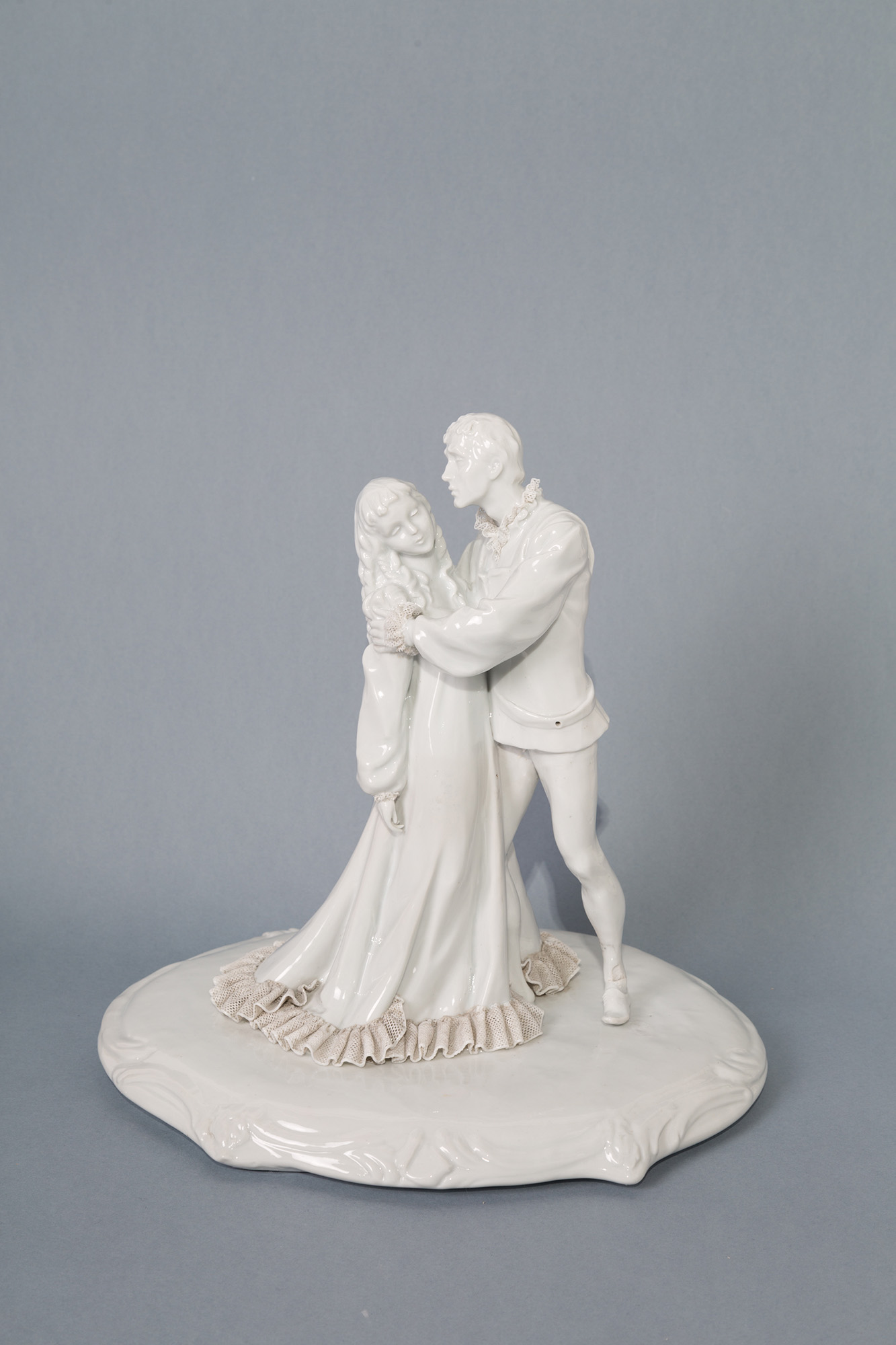 Statuetta in porcellana bianca raff. ''SCENA GALANTE''. XIX secolo. Piccole rotture e mancanze. Mis. Lung. cm. 30 Alt. cm. 30 Prof. cm. 24 ca.