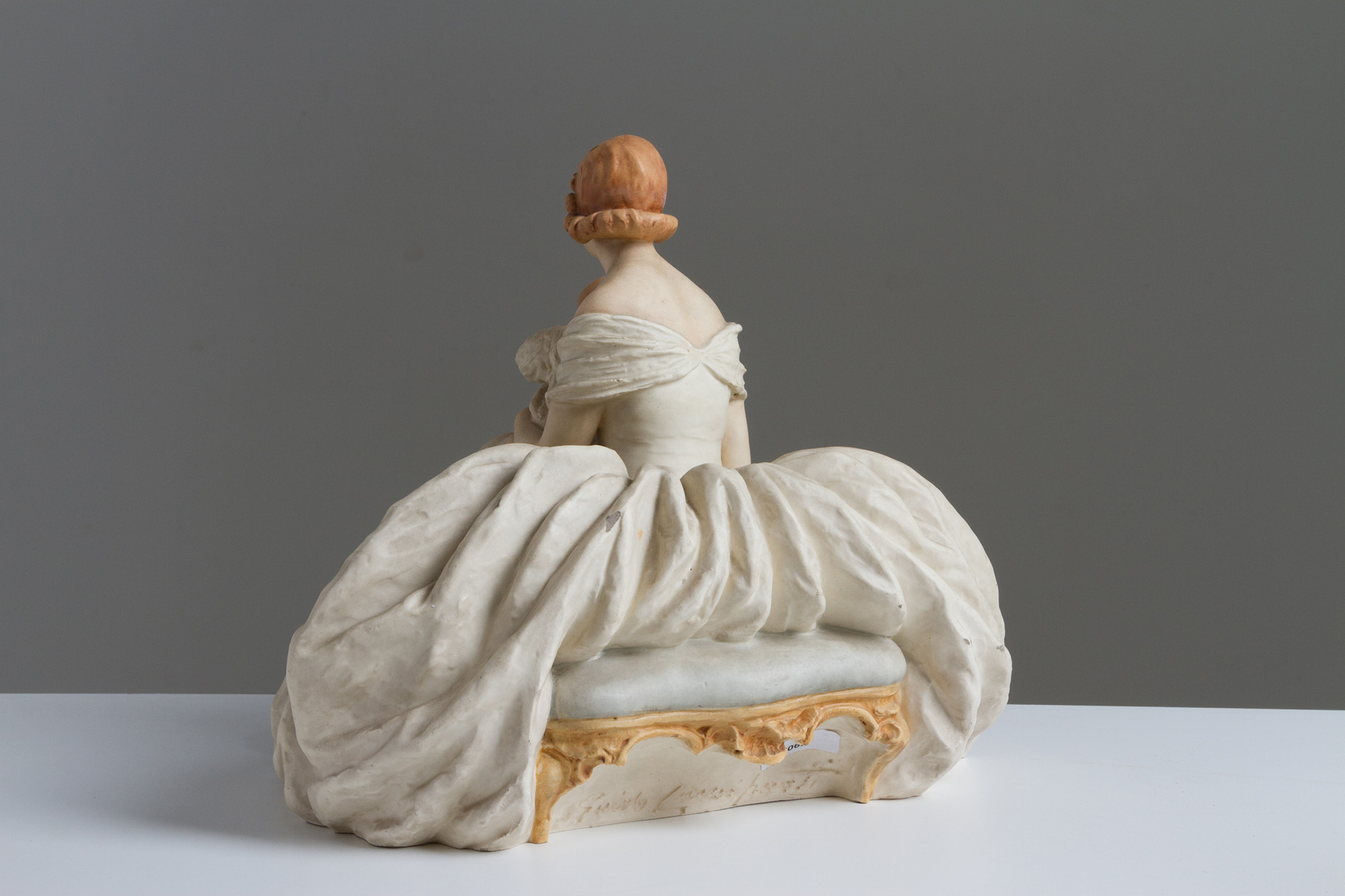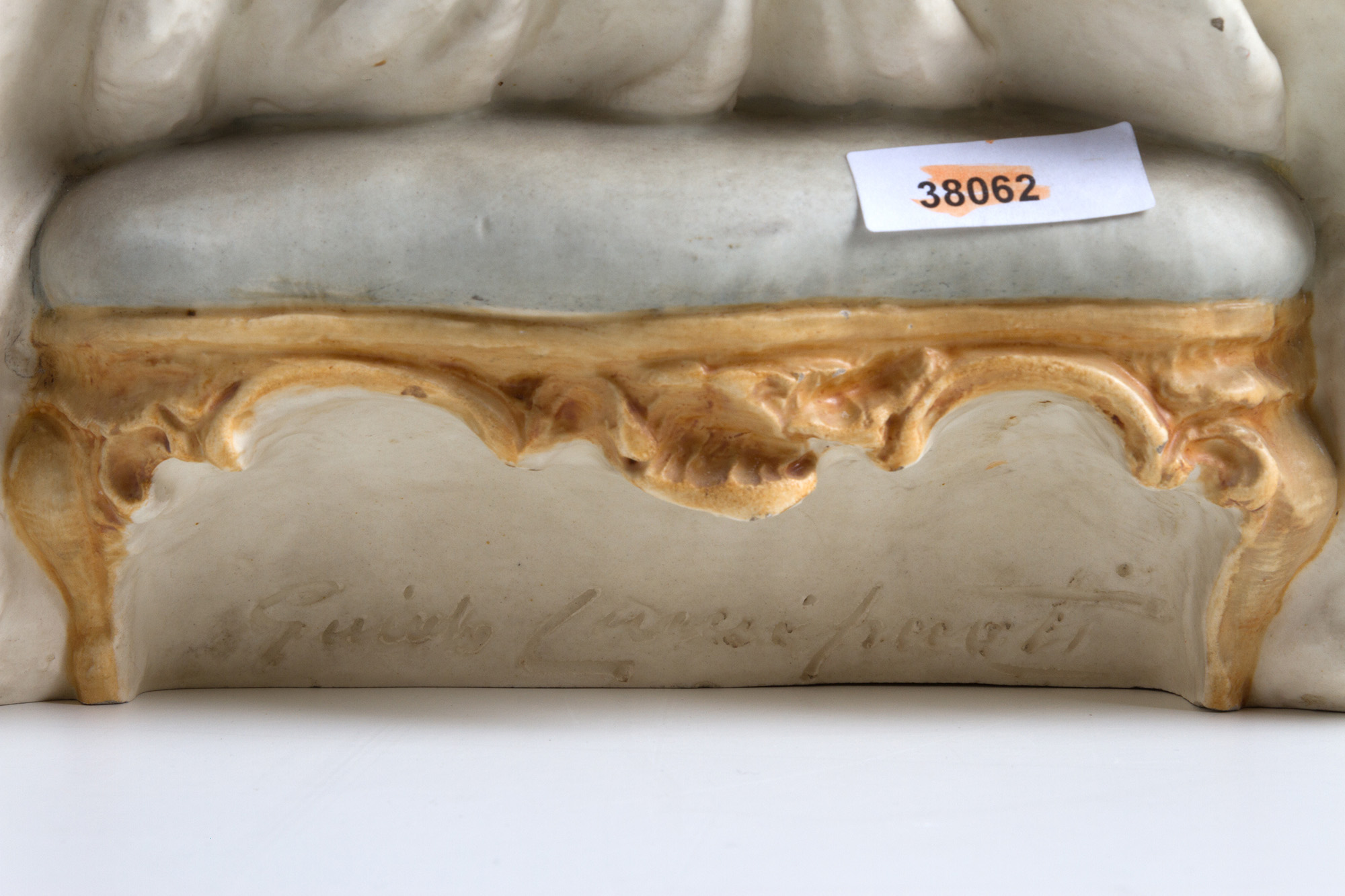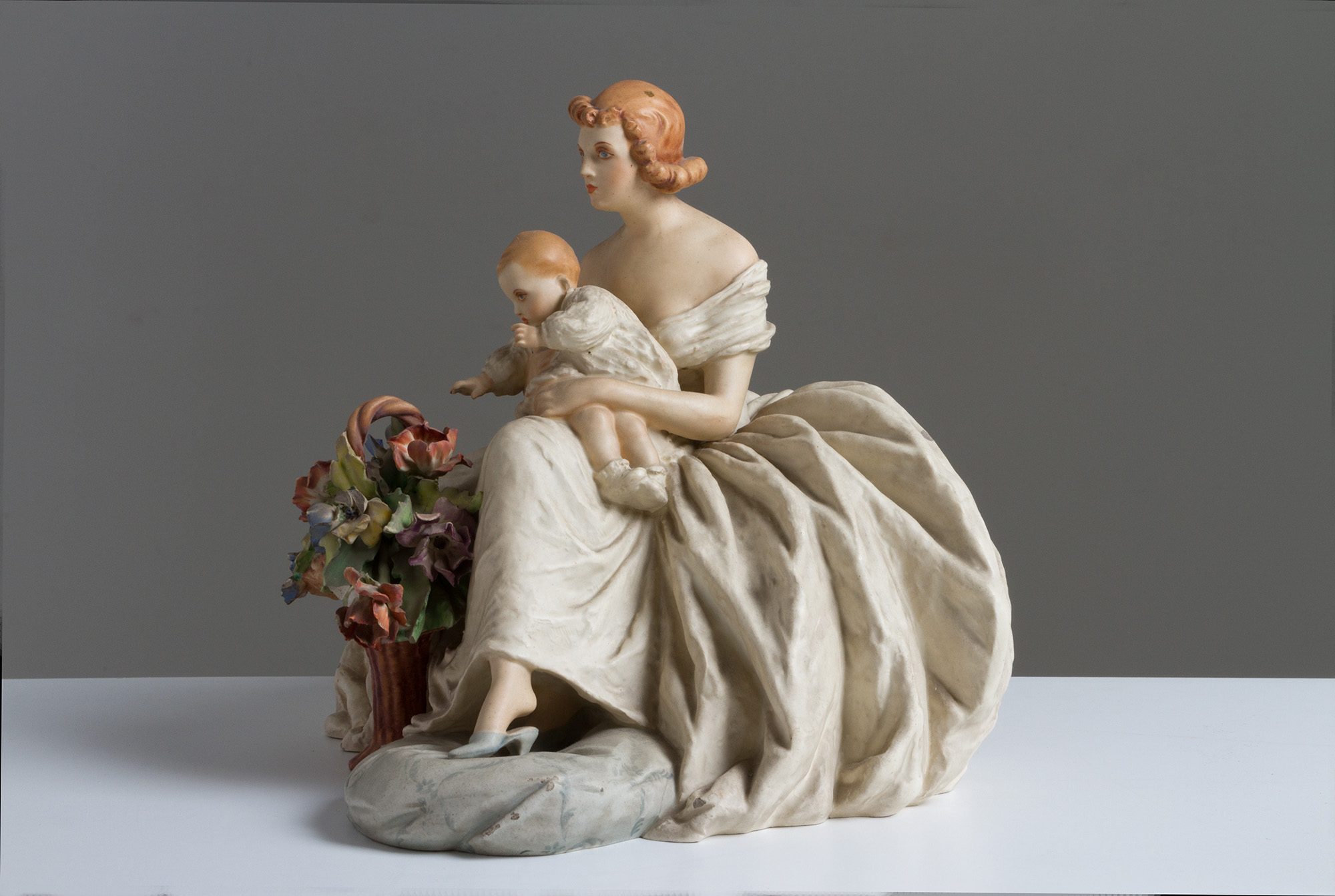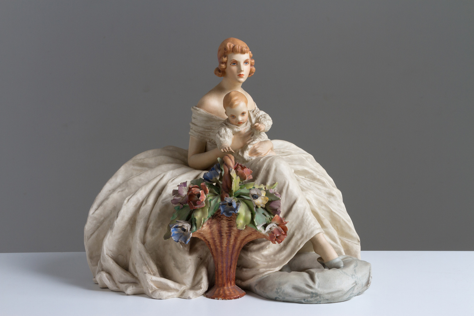 GUIDO CACCIAPUOTI (Napoli, 1892 - Milano, 1953). Scultura in ceramica raff. ''DAMIGELLA CON BIMBO E MAZZO DI FIORI''. Firmata sul retro. Lievi difetti. Mis. Lung. cm. 35 Alt. cm. 30 Prof. cm. 30 ca.