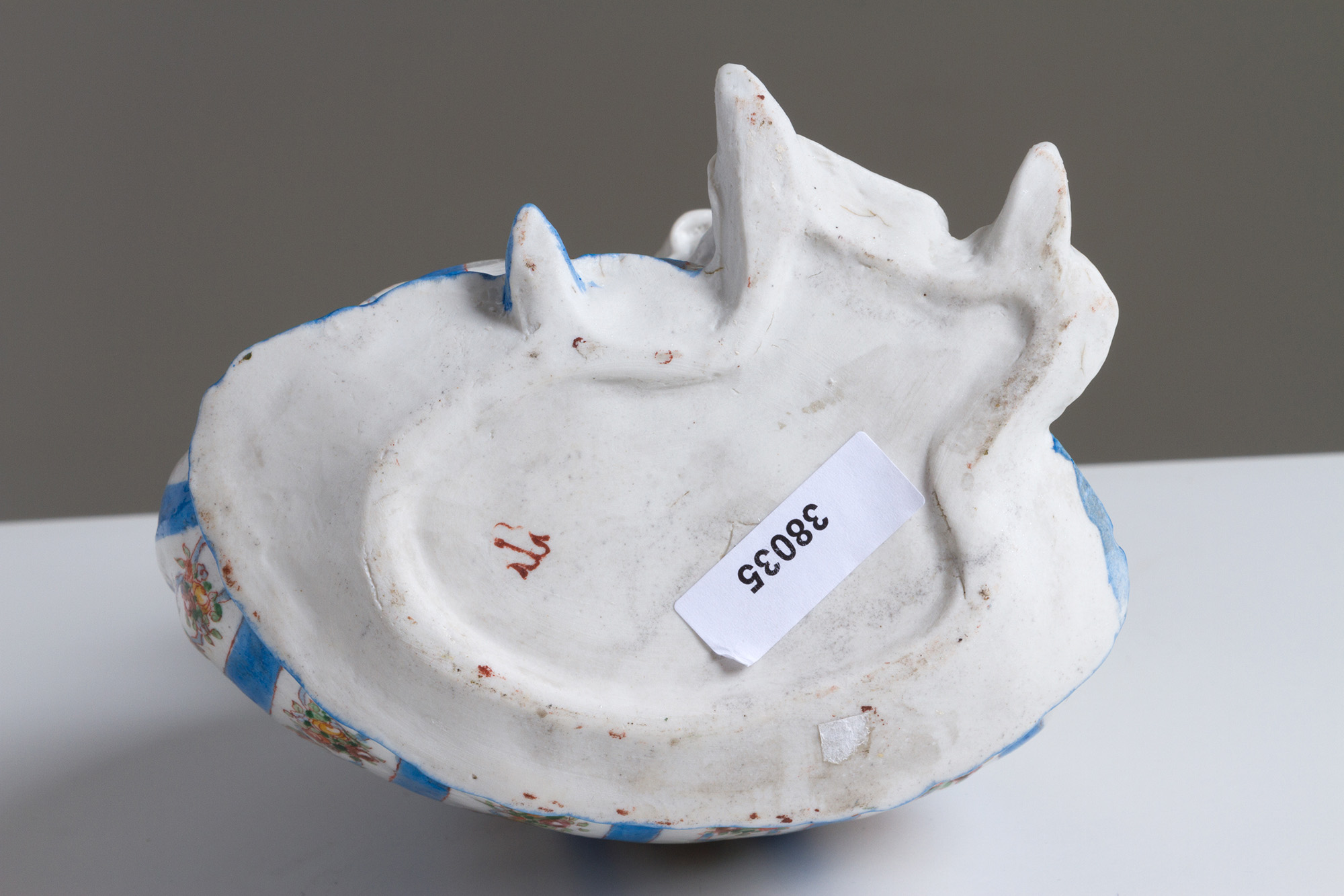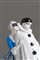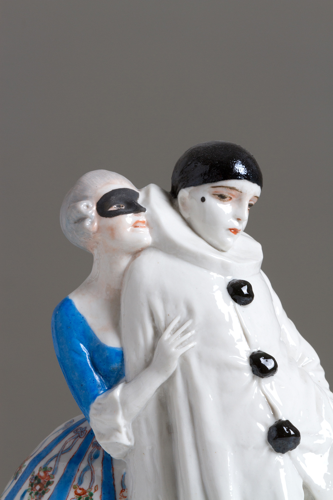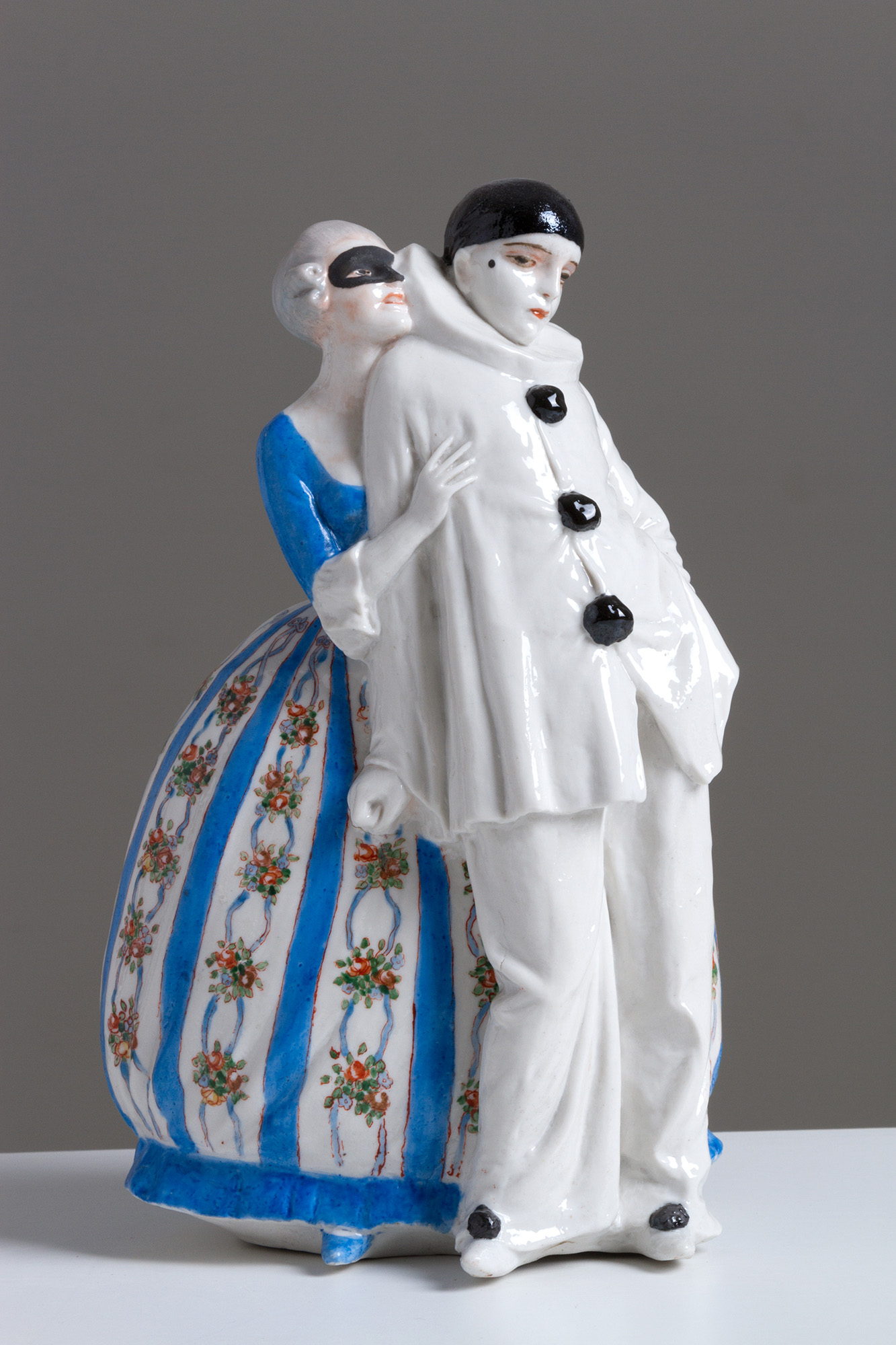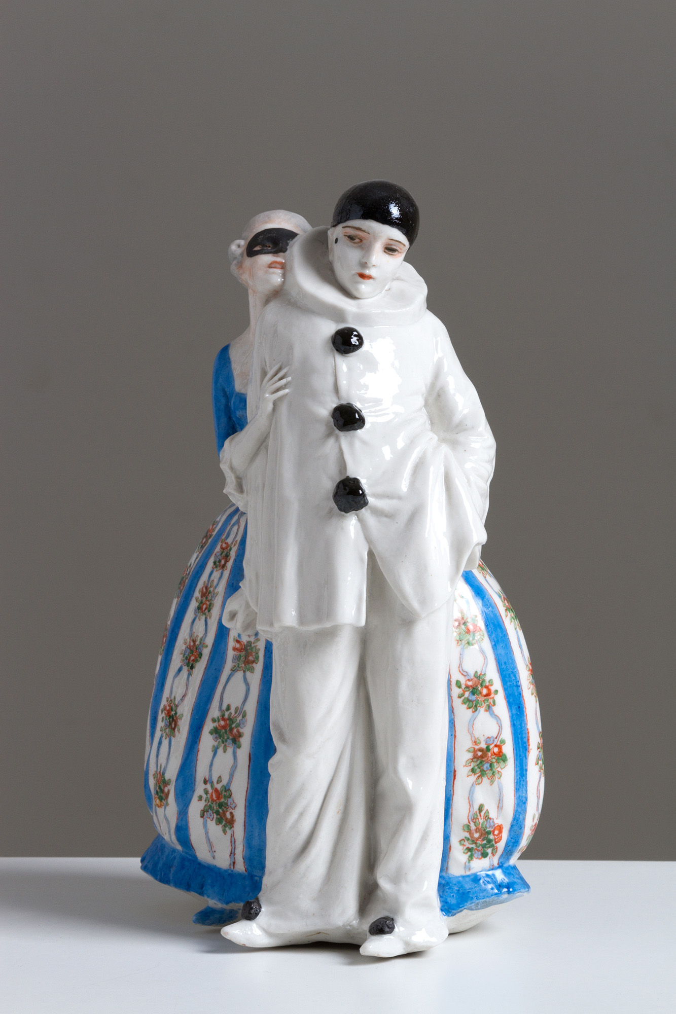 Statuetta in ceramica raff. ''LA TENTAZIONE DI PIERROT''. Produzione FABRIS. 1930. Mis. Lung. cm. 15 Alt. cm. 25 Prof. cm. 10 ca.
