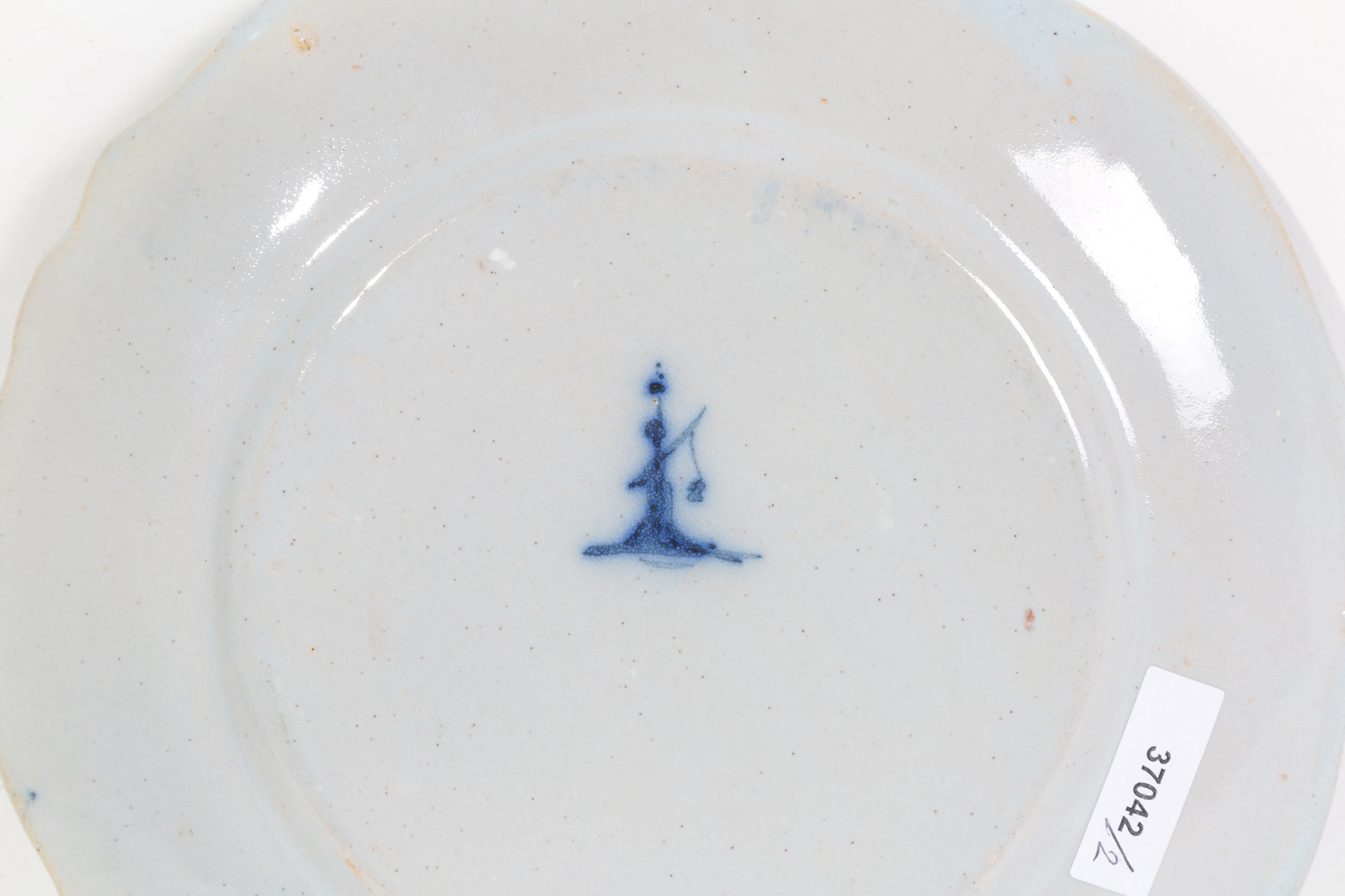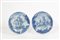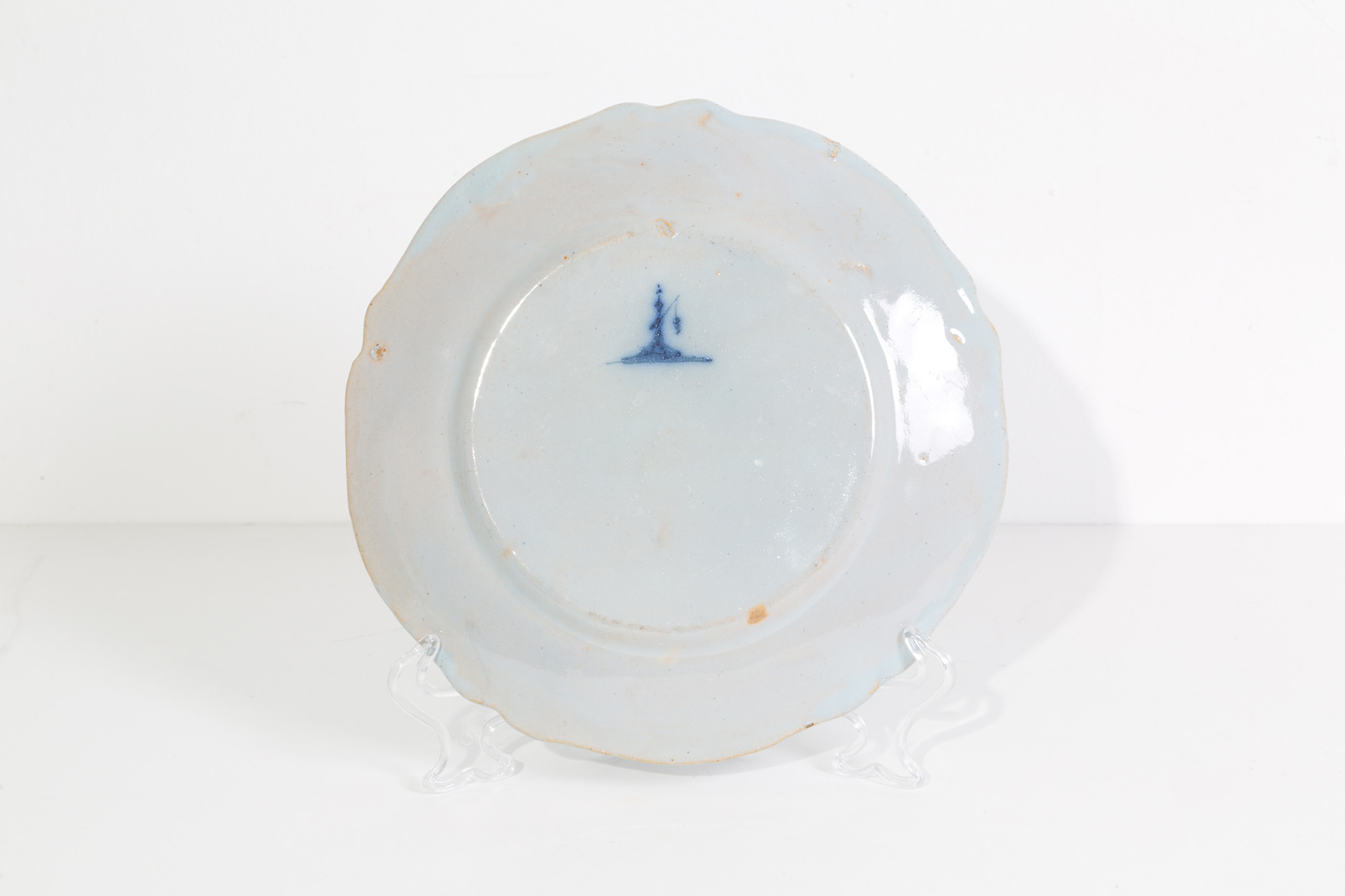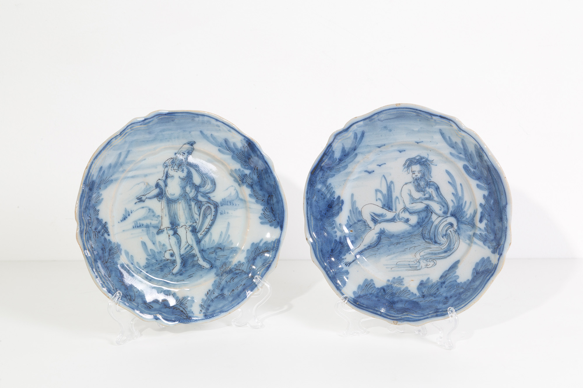 Coppia di piatti in maiolica dipinta di blu raff. ''FIGURE''. Bordi polilobati. Manifattura Savona. Marcati sul fondo. XVIII secolo. Mis. Diam. cm. 23.5 ca.