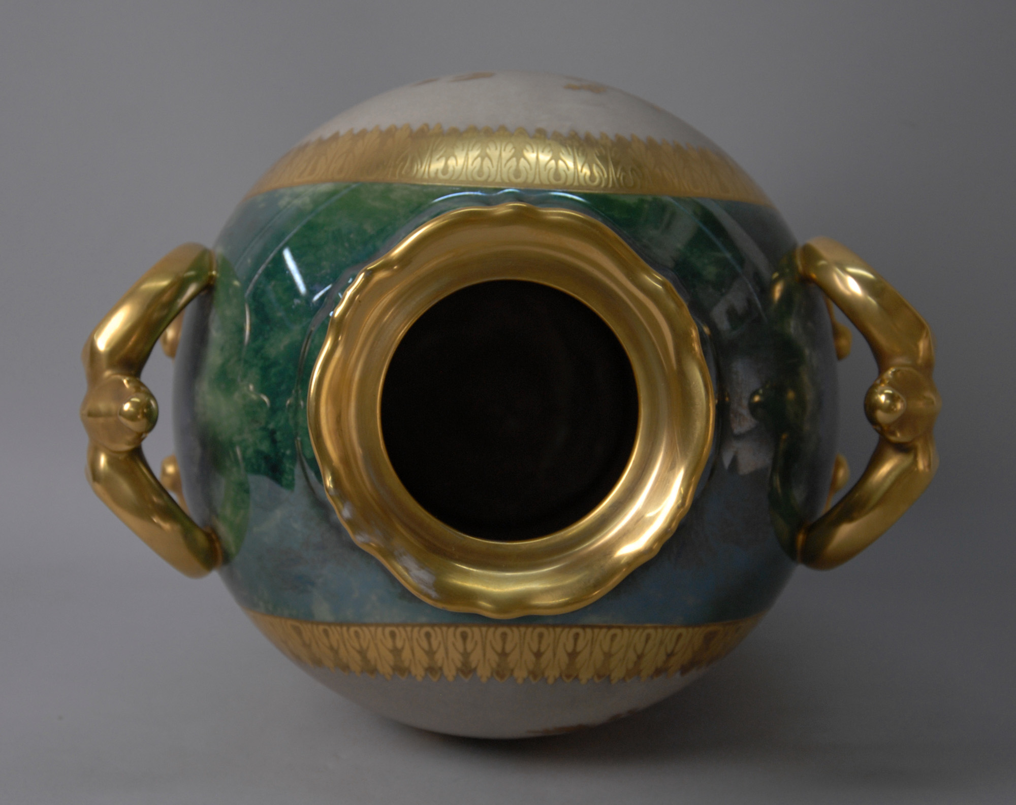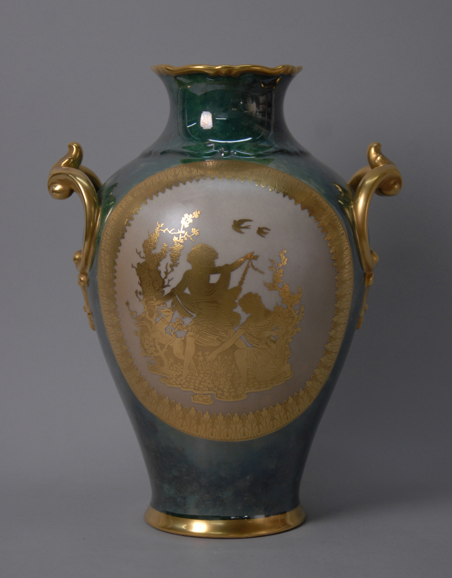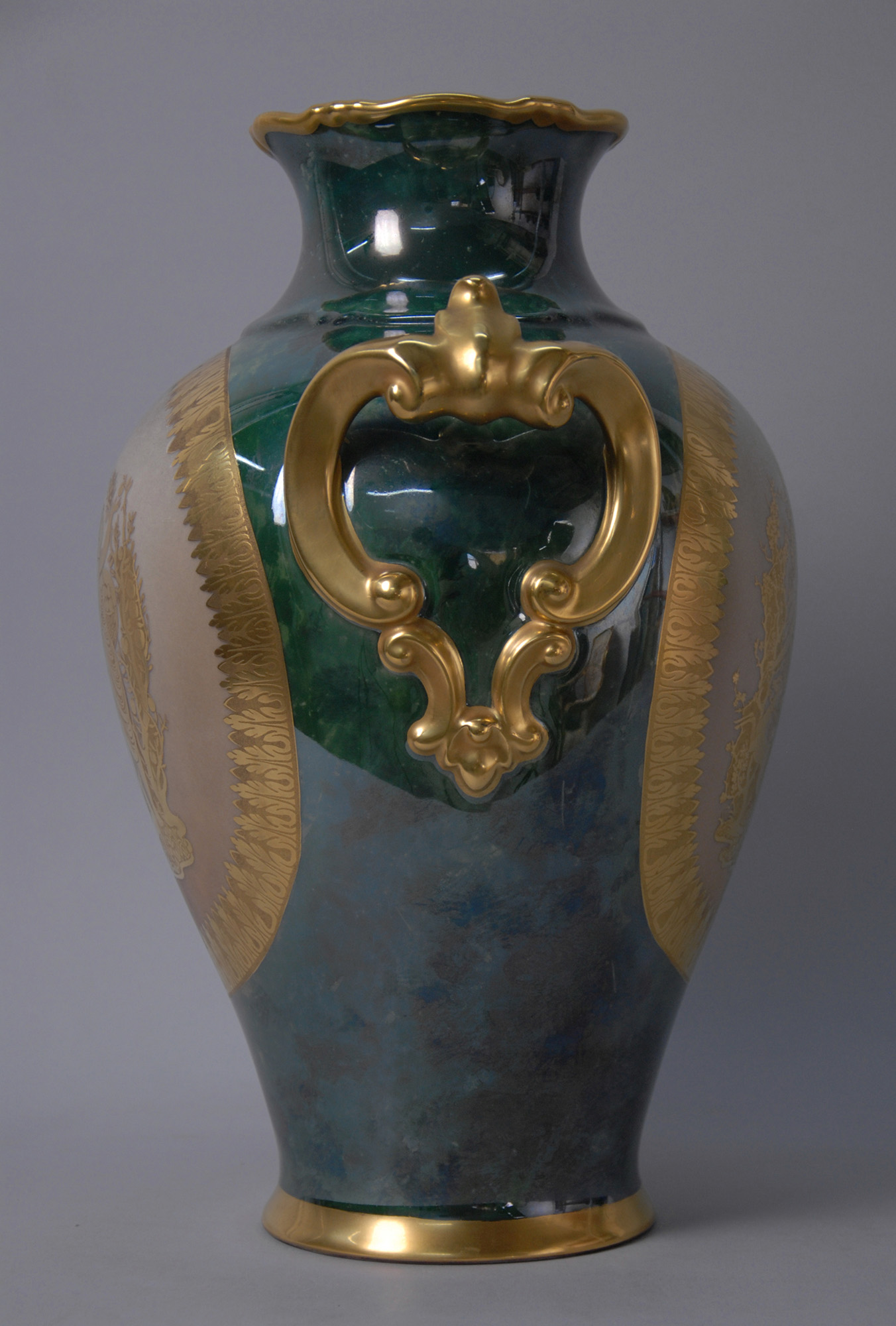 Vaso in porcellana policroma con finiture in oro zecchino. Firmato THOMAS BAVARIA sotto la base. Germania. XX secolo. Mis. Alt. cm. 37 ca.