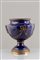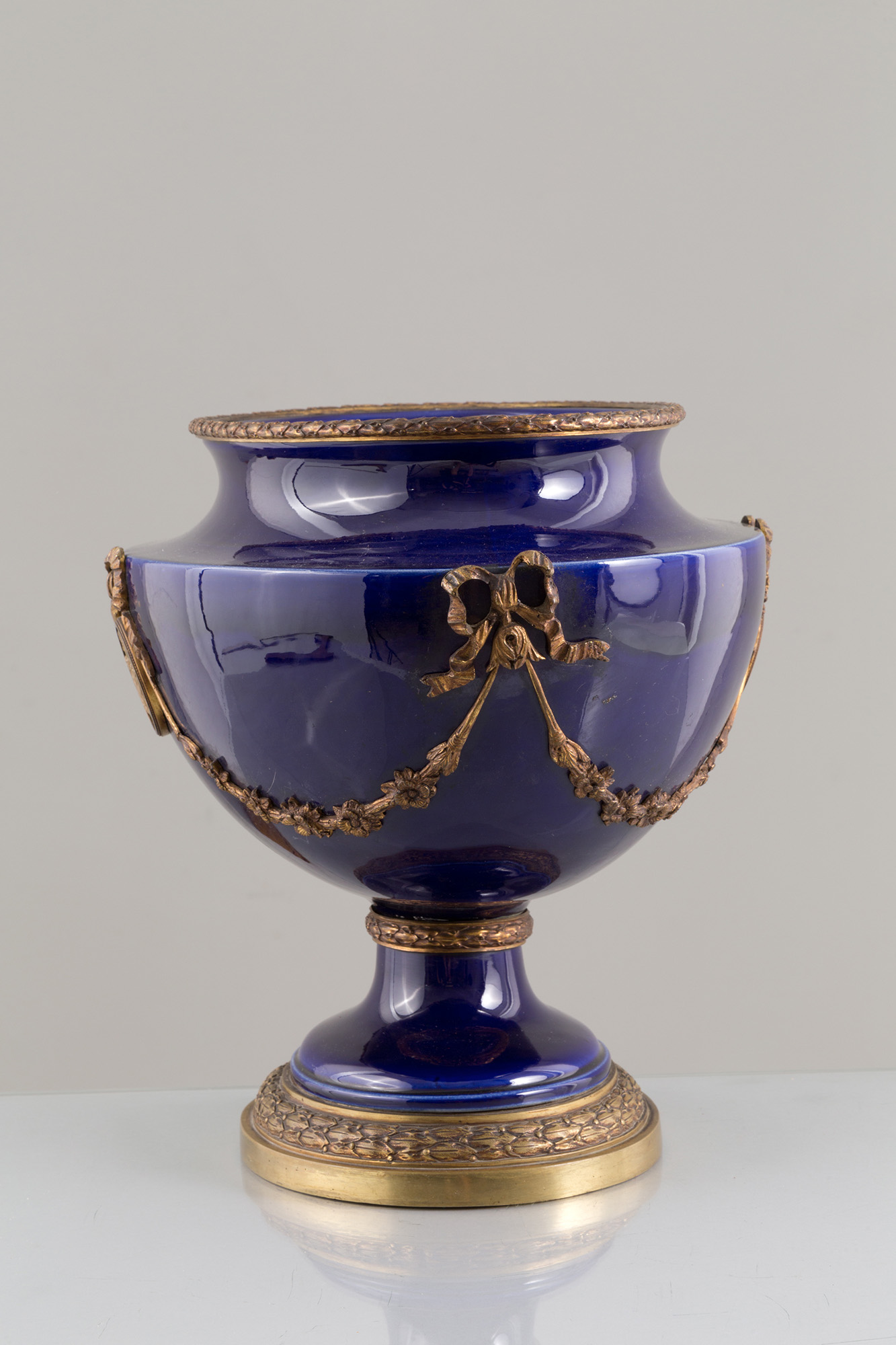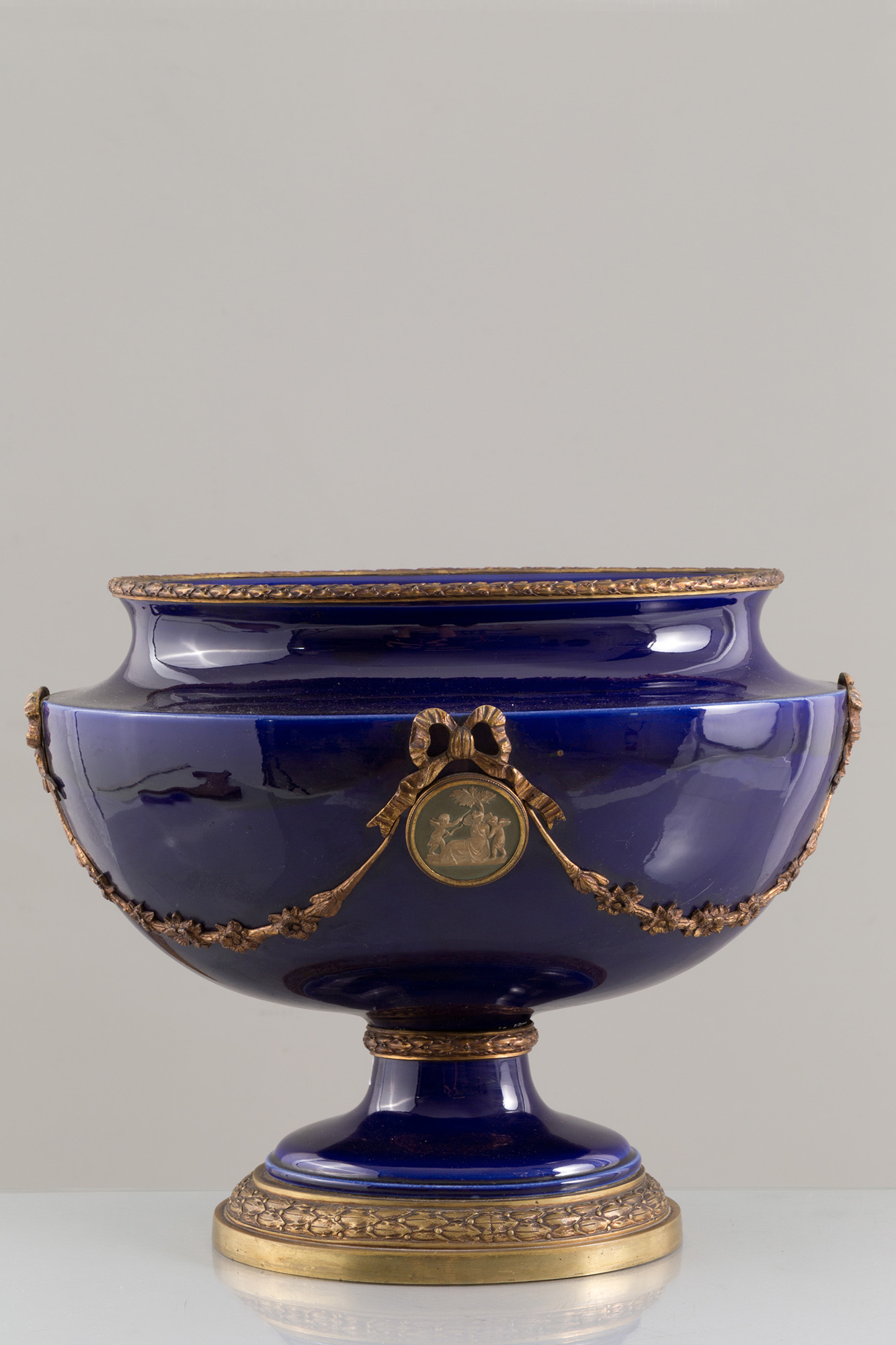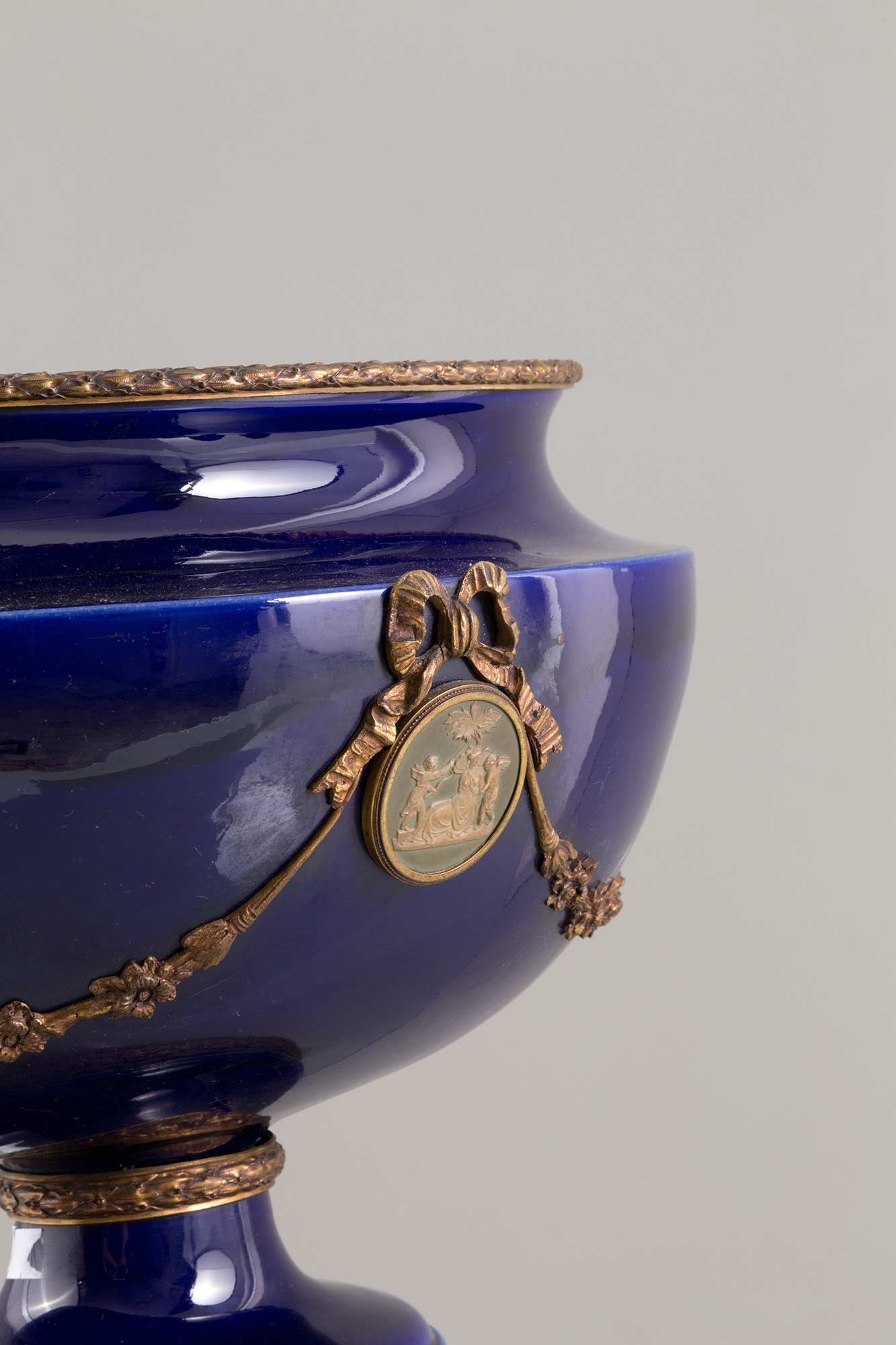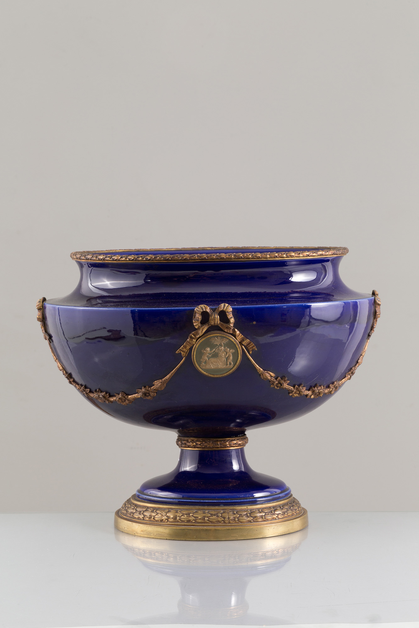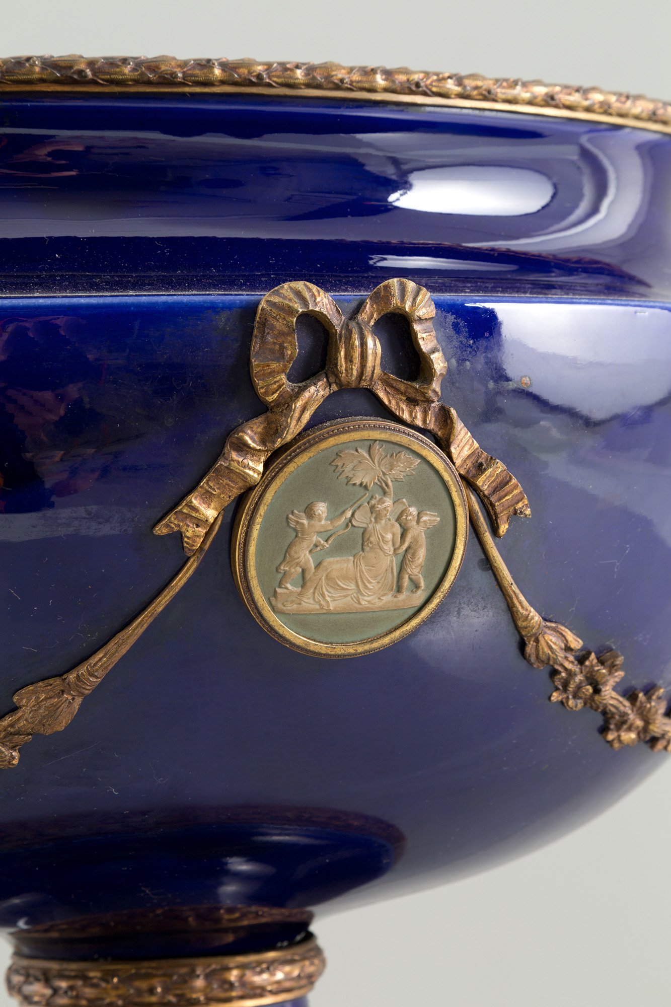 Cachepot in ceramica blu cobalto con finiture in bronzo e medaglioni in porcellana di Wedgwood. XX secolo. Mis. Lung. cm. 45 Alt. cm. 34 Prof. cm. 30 ca.