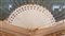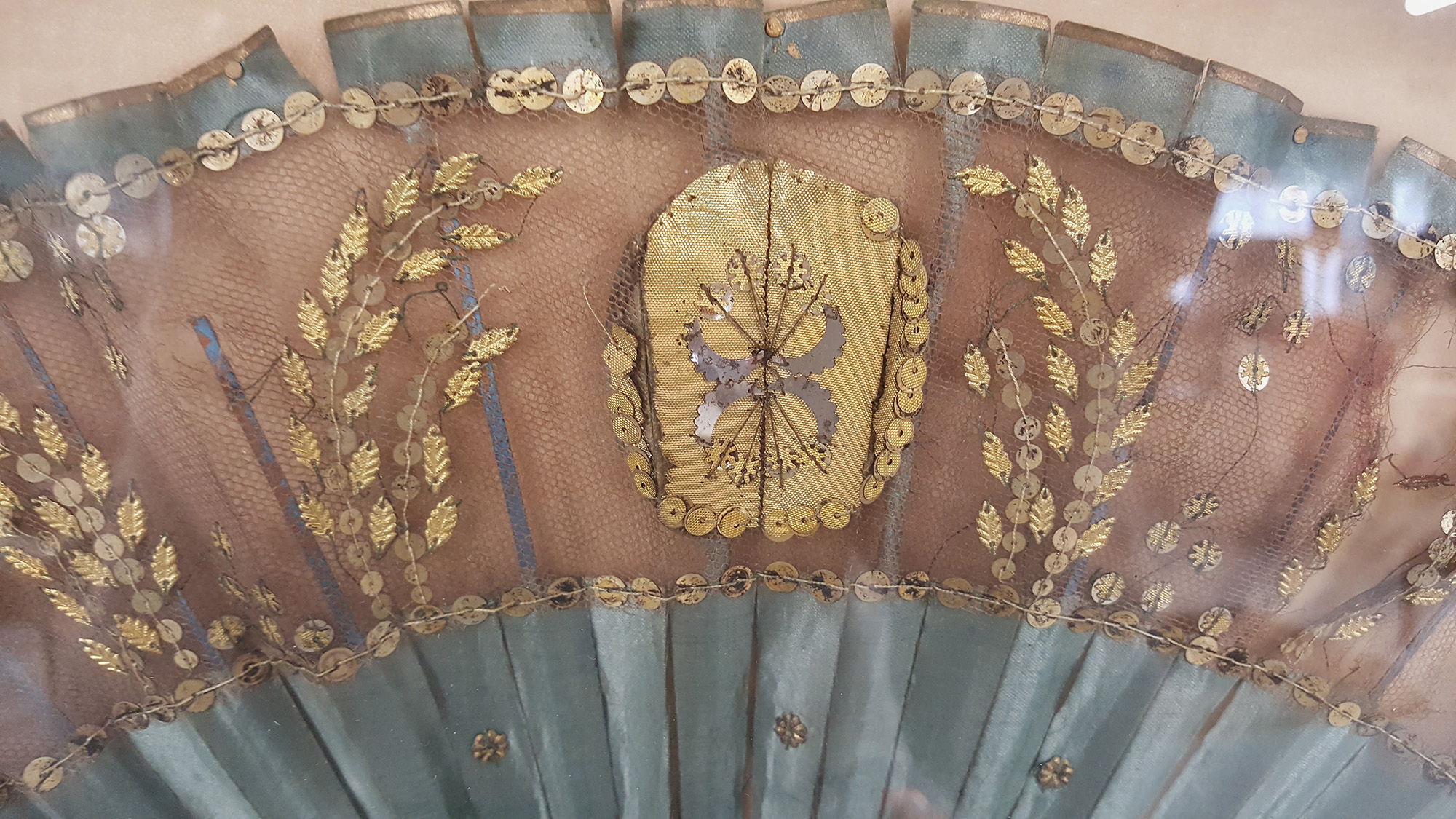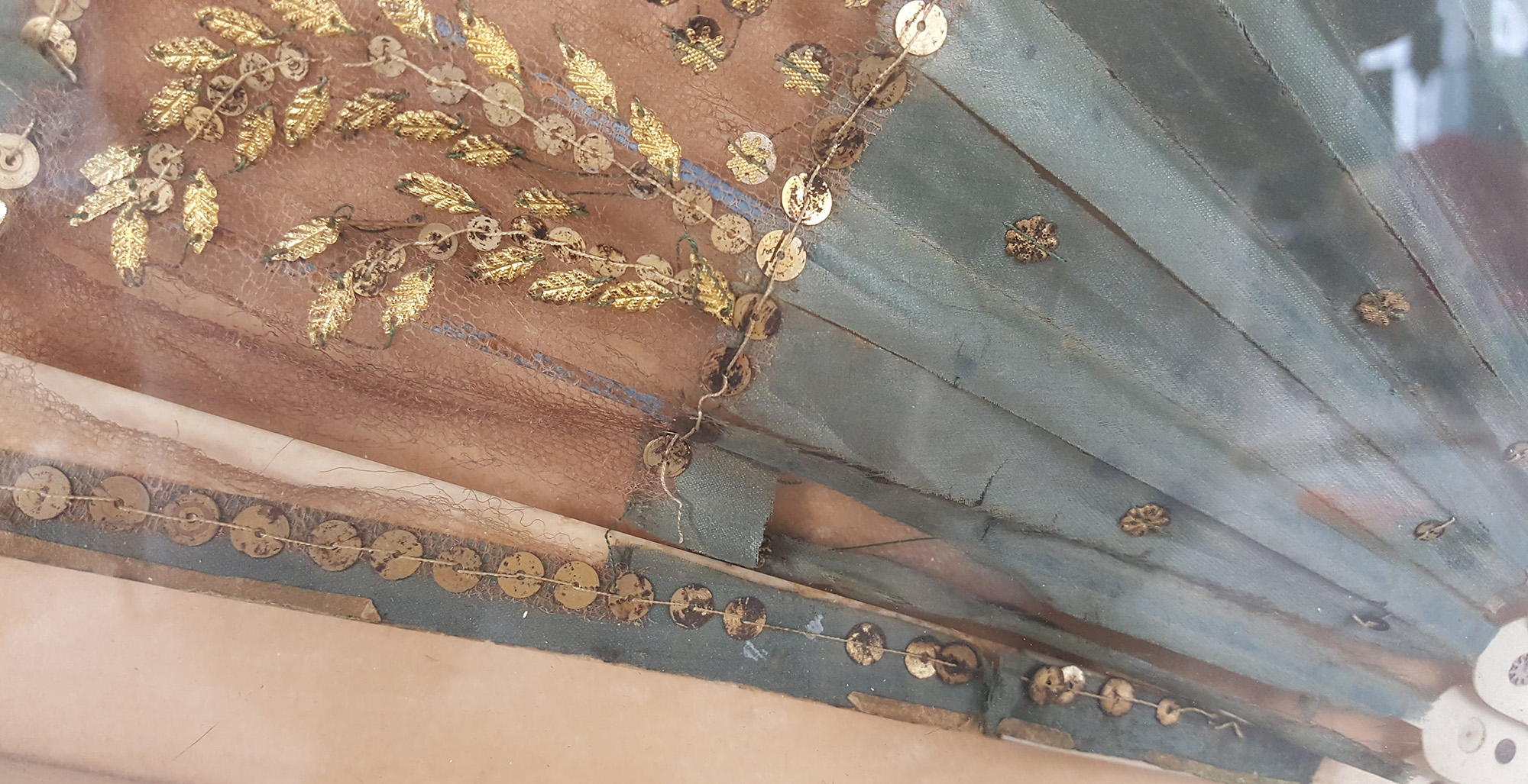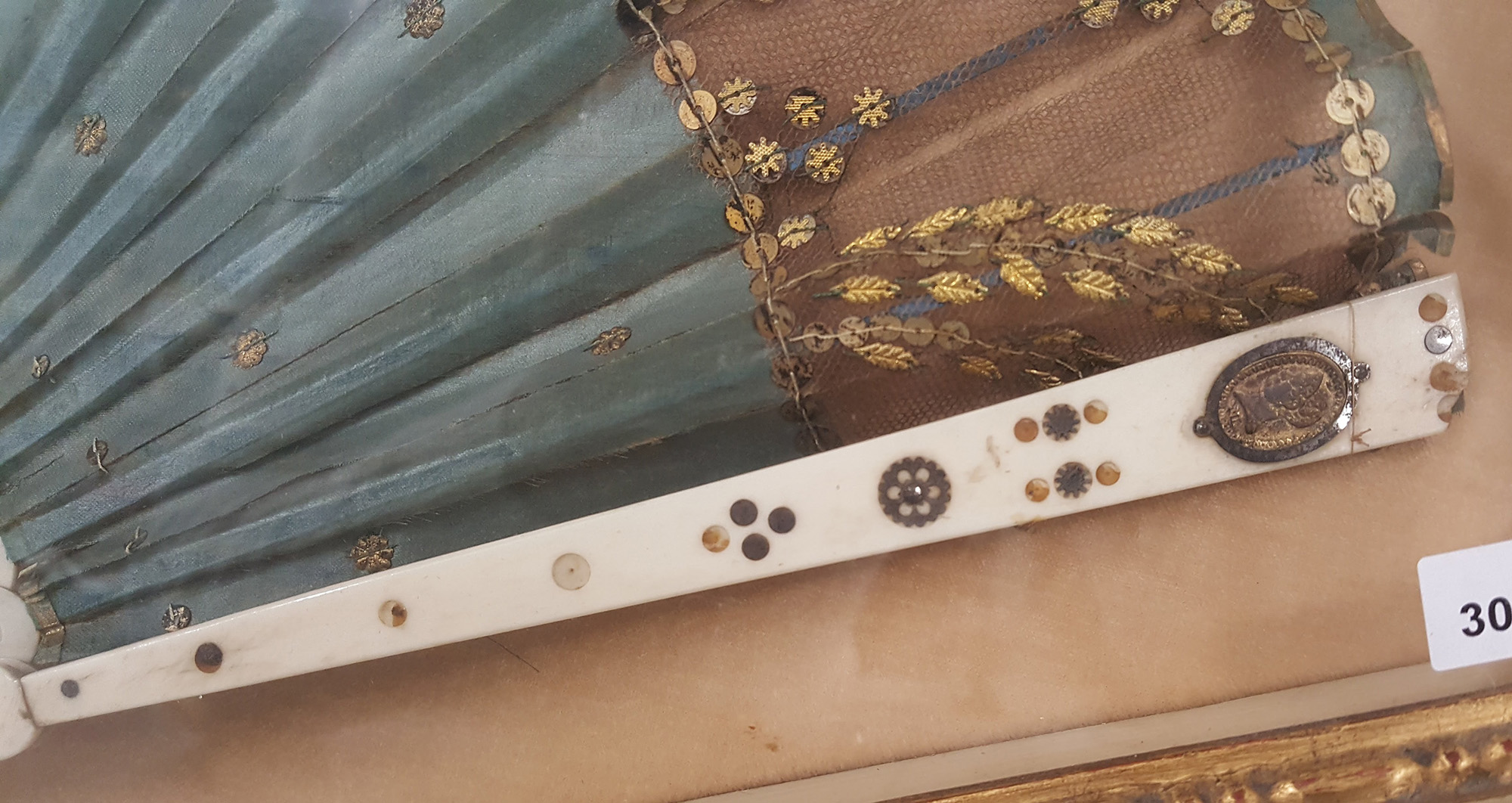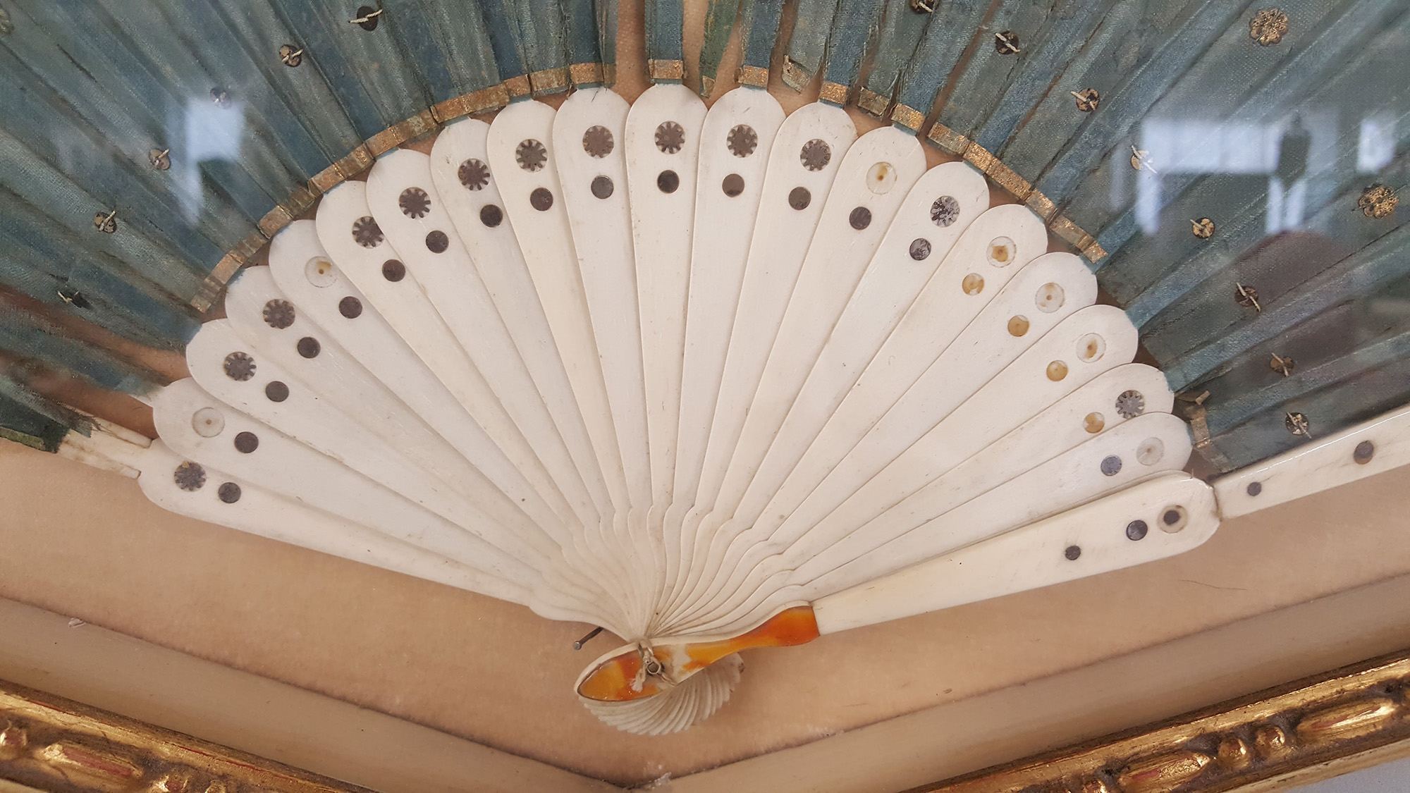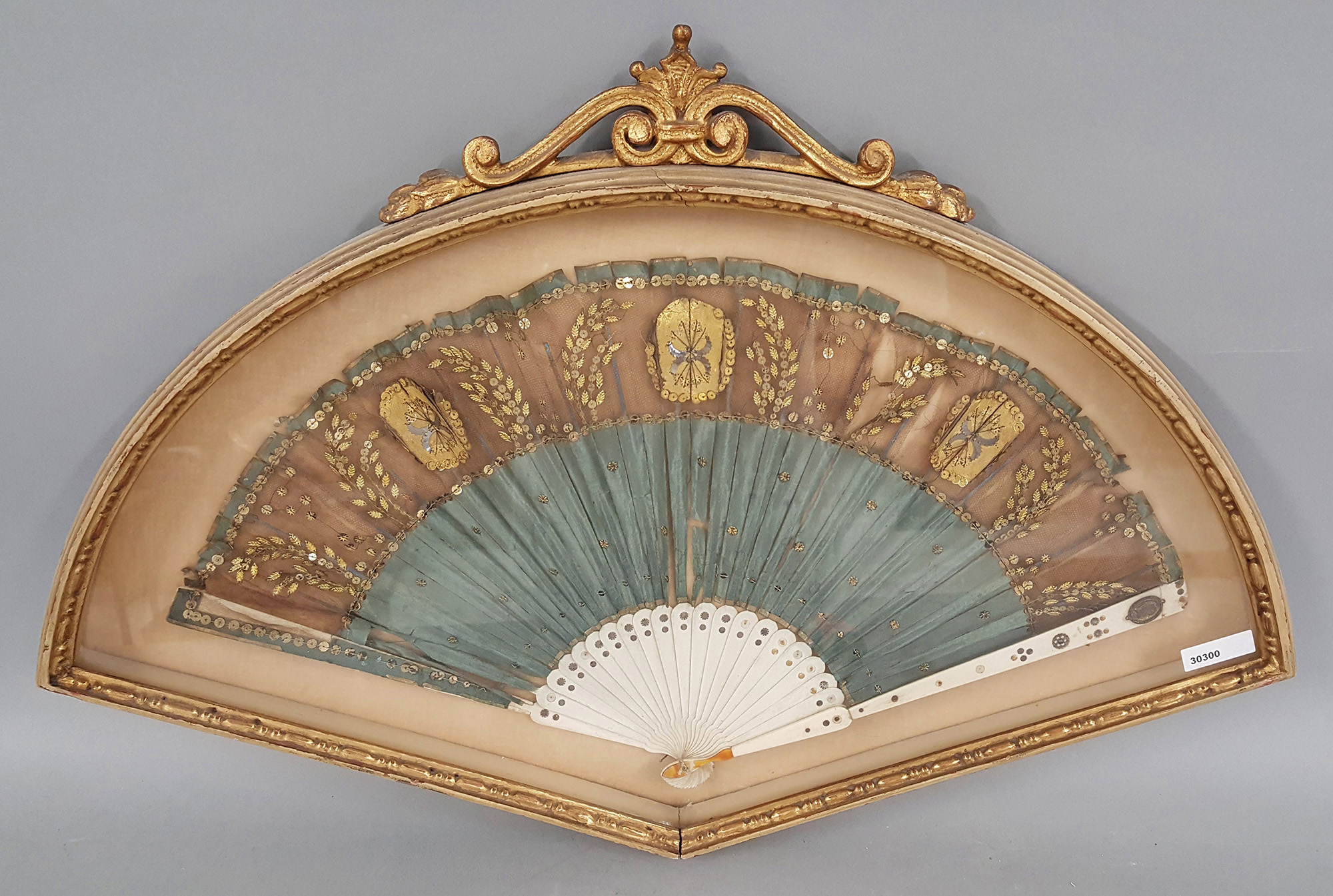 Ventaglio in avorio e seta con decoro in oro. XIX secolo. In teca. Lievi difetti. Mis. Lung. cm. 64 Alt. cm. 44 ca.