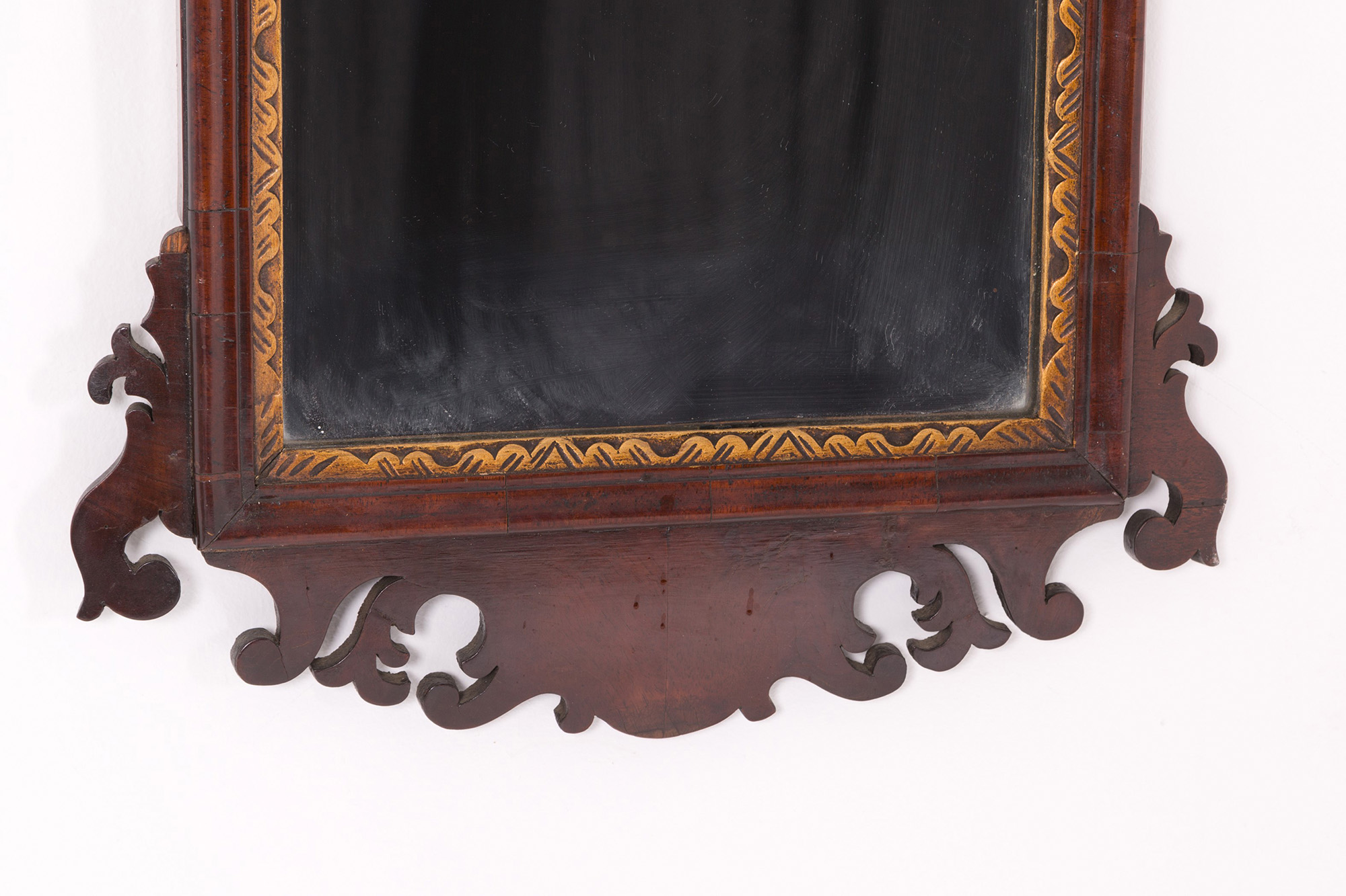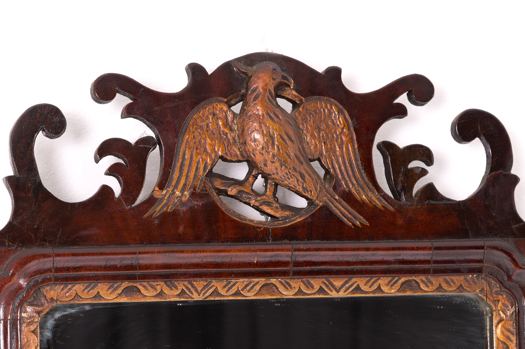 Specchierina in mogano con profili dorati e cimasa traforata decorata con aquila. Inghilterra. XIX secolo. Mis. Alt. cm. 88 Prof. cm. 50 ca.