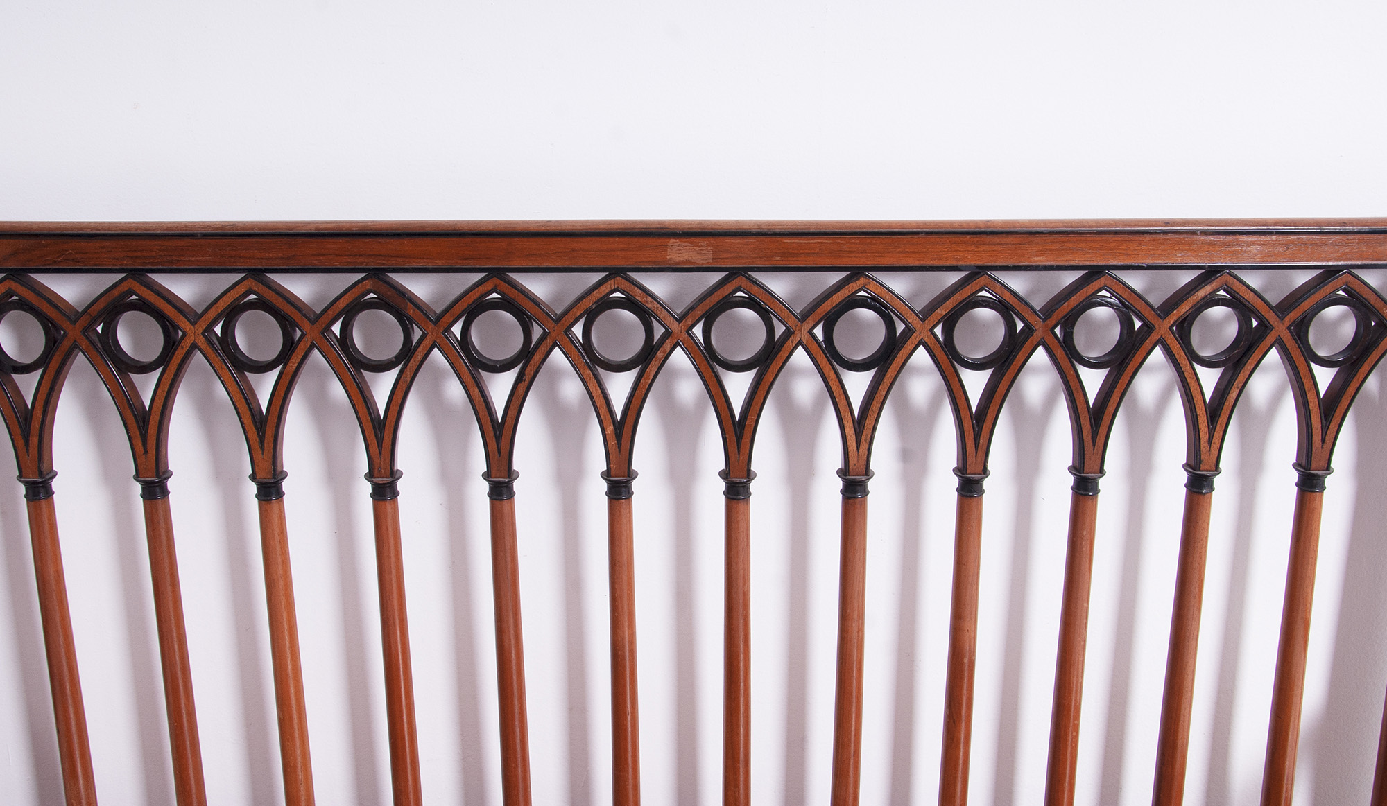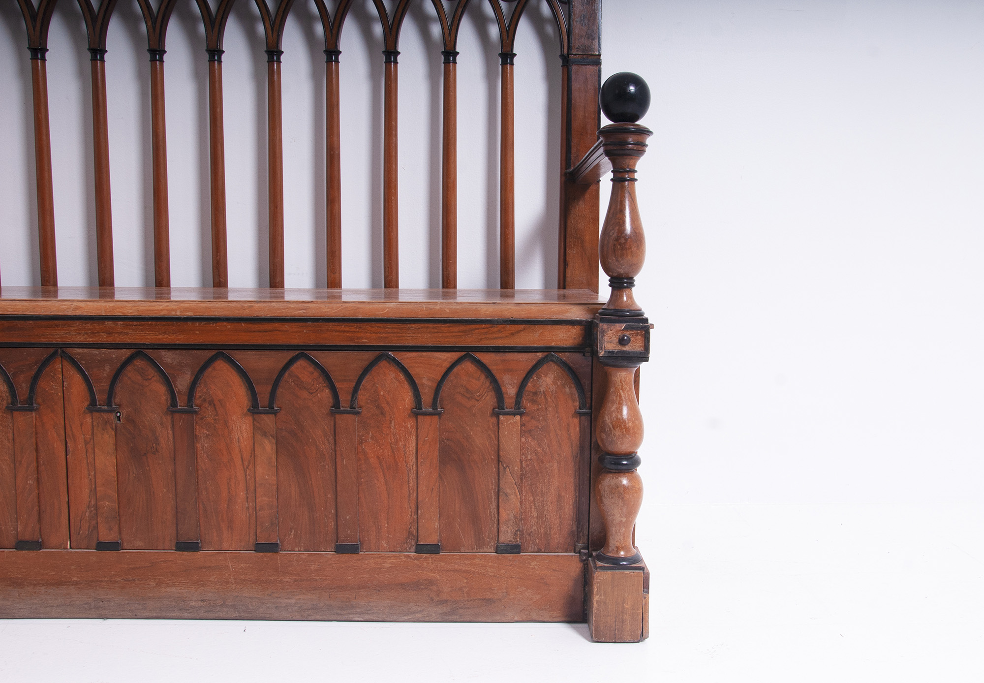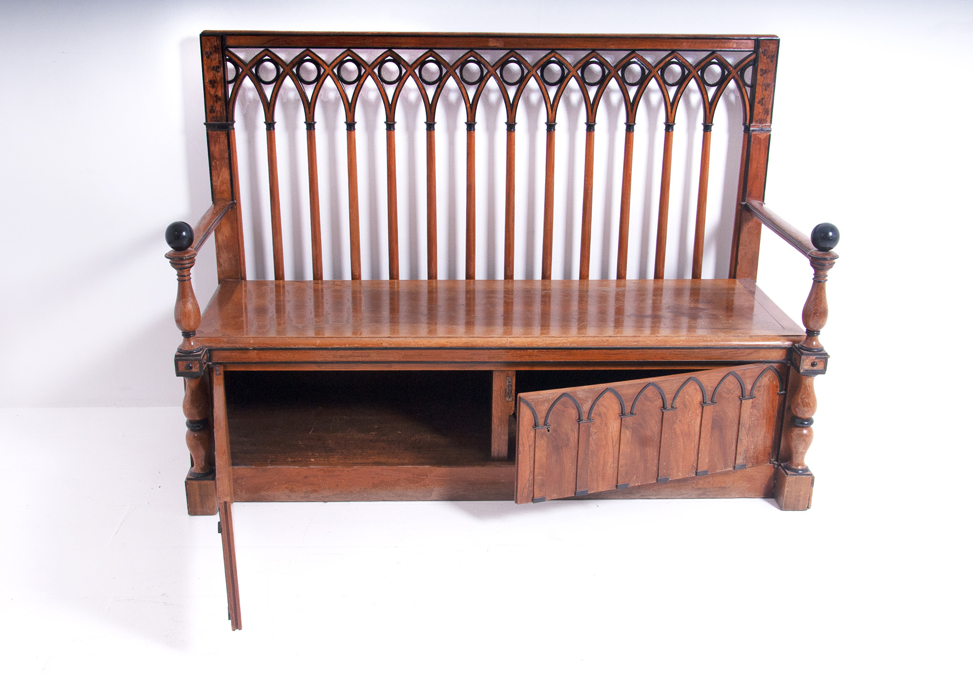 Panca in legno di noce con due ante nella parte bassa e decori ebanizzati. Francia. Periodo neogotico. Lievi difetti. Mis. Lung. cm. 147 Alt. cm. 107 Prof. cm. 68 ca.