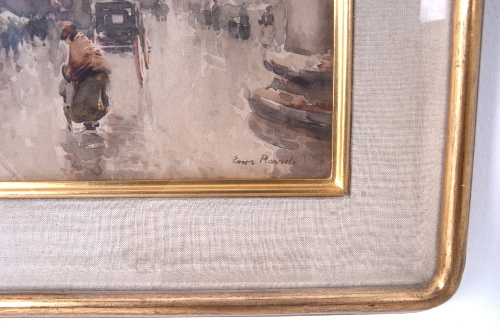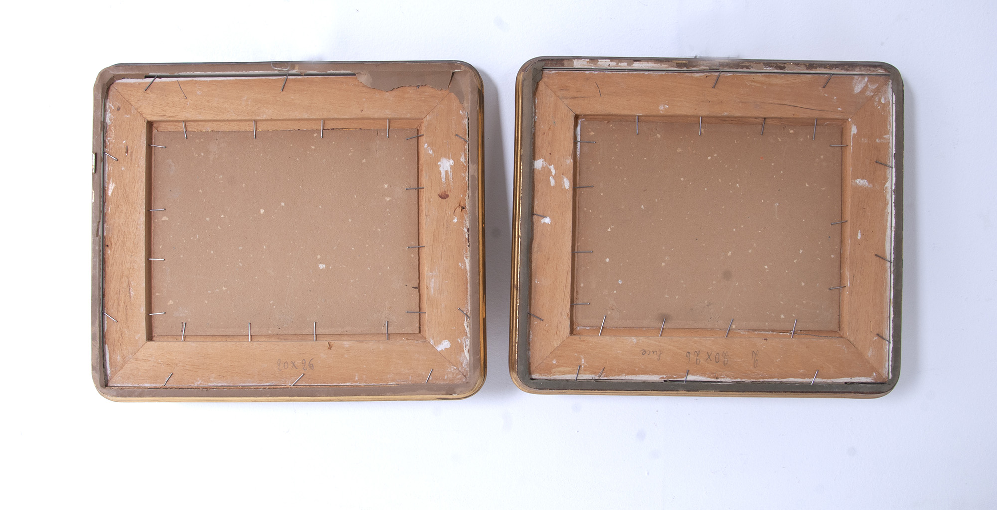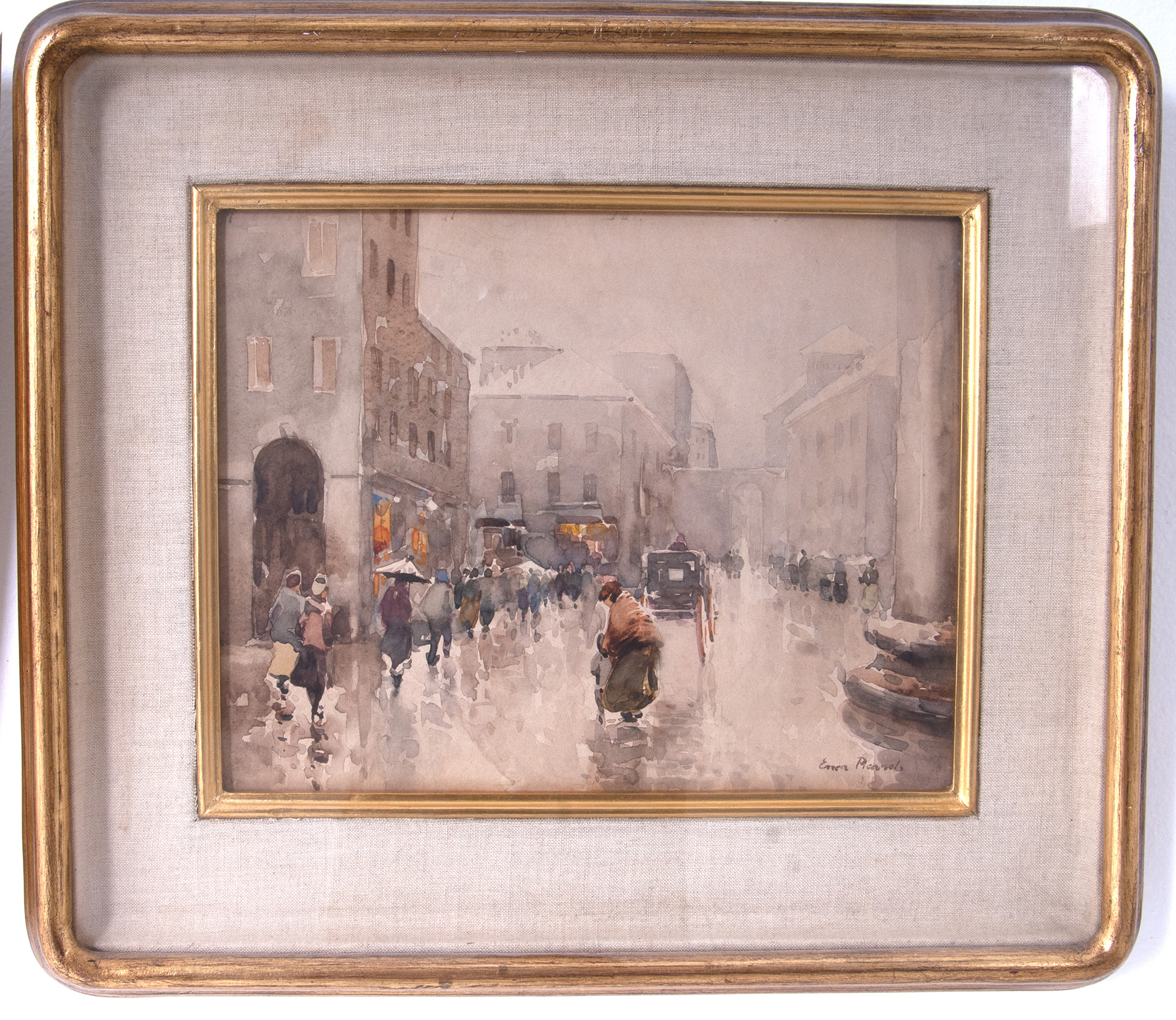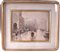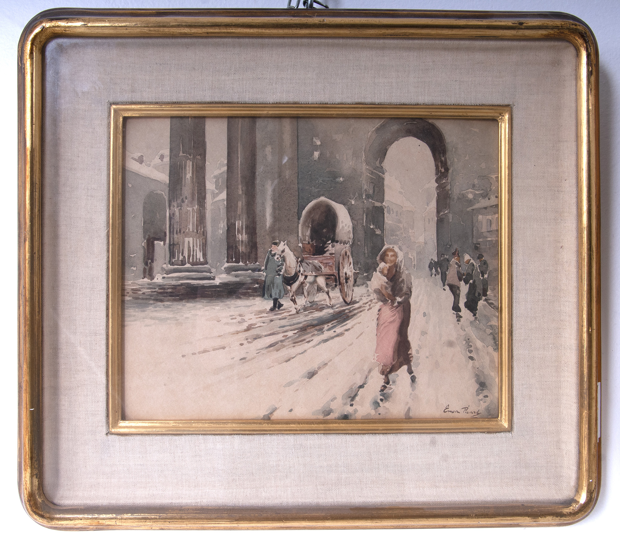 Due acquarelli su cartone raff. ''SCORCI DI CITTA' INNEVATE''. Firma non identificata in basso a destra. Inizi XX secolo. In cornice. Mis. Lung. cm. 26 Alt. cm. 20 ca.