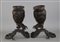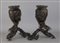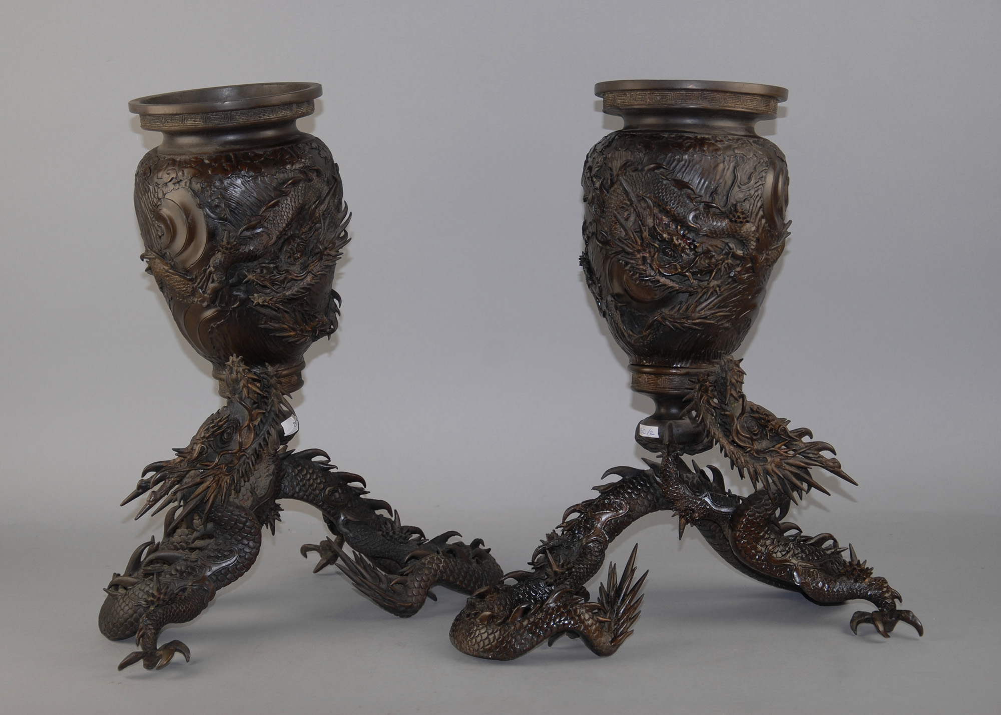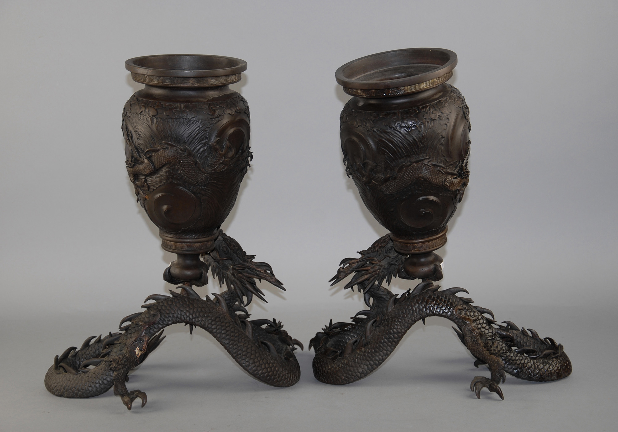 Coppia di vasi in bronzo decorati con draghetti a rilievo e sorretti da draghi. Giappone. XIX secolo. Mis. Lung. cm. 33 Alt. cm. 41 Prof. cm. 20 ca.