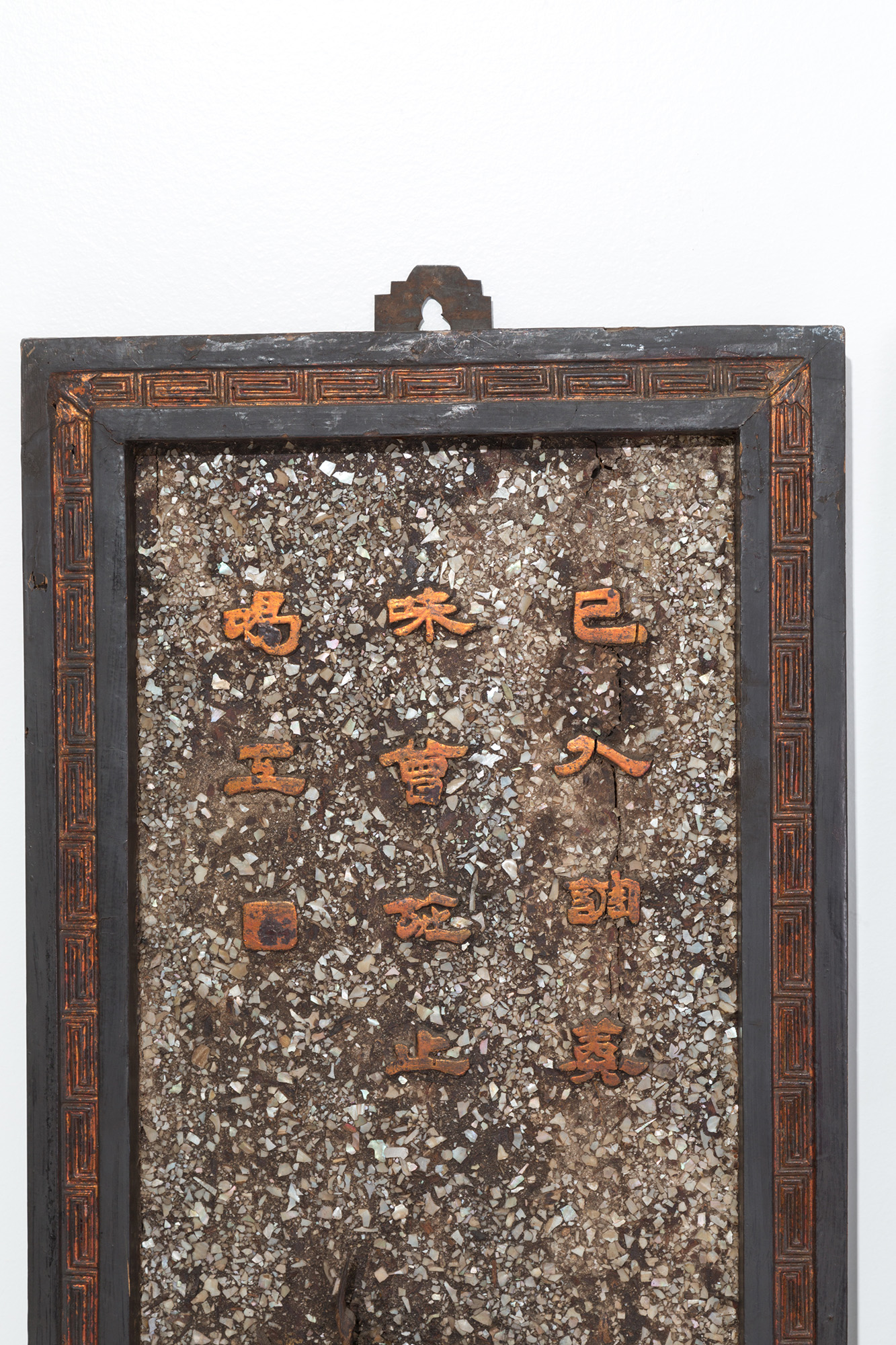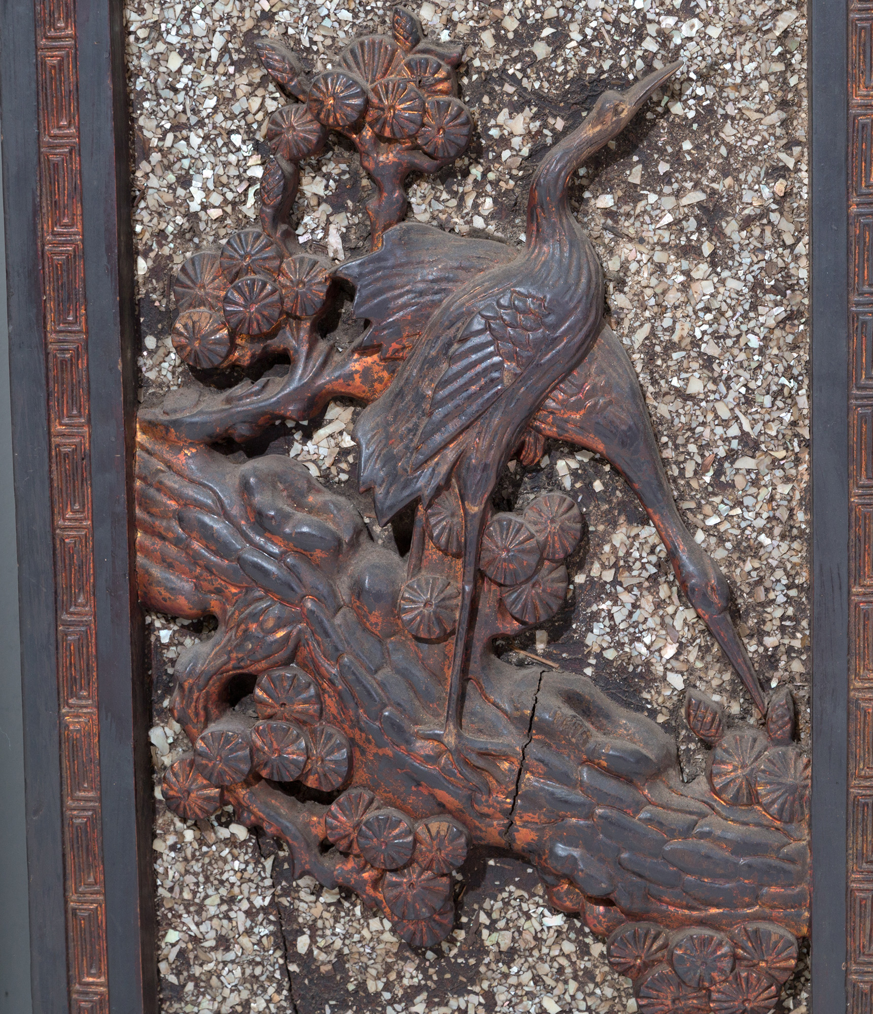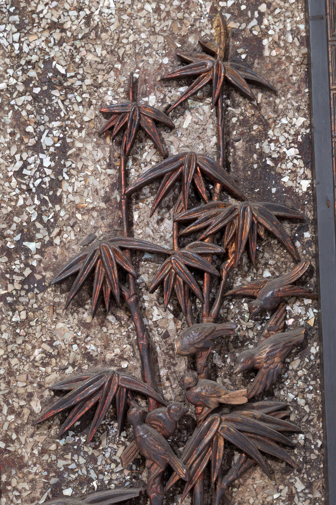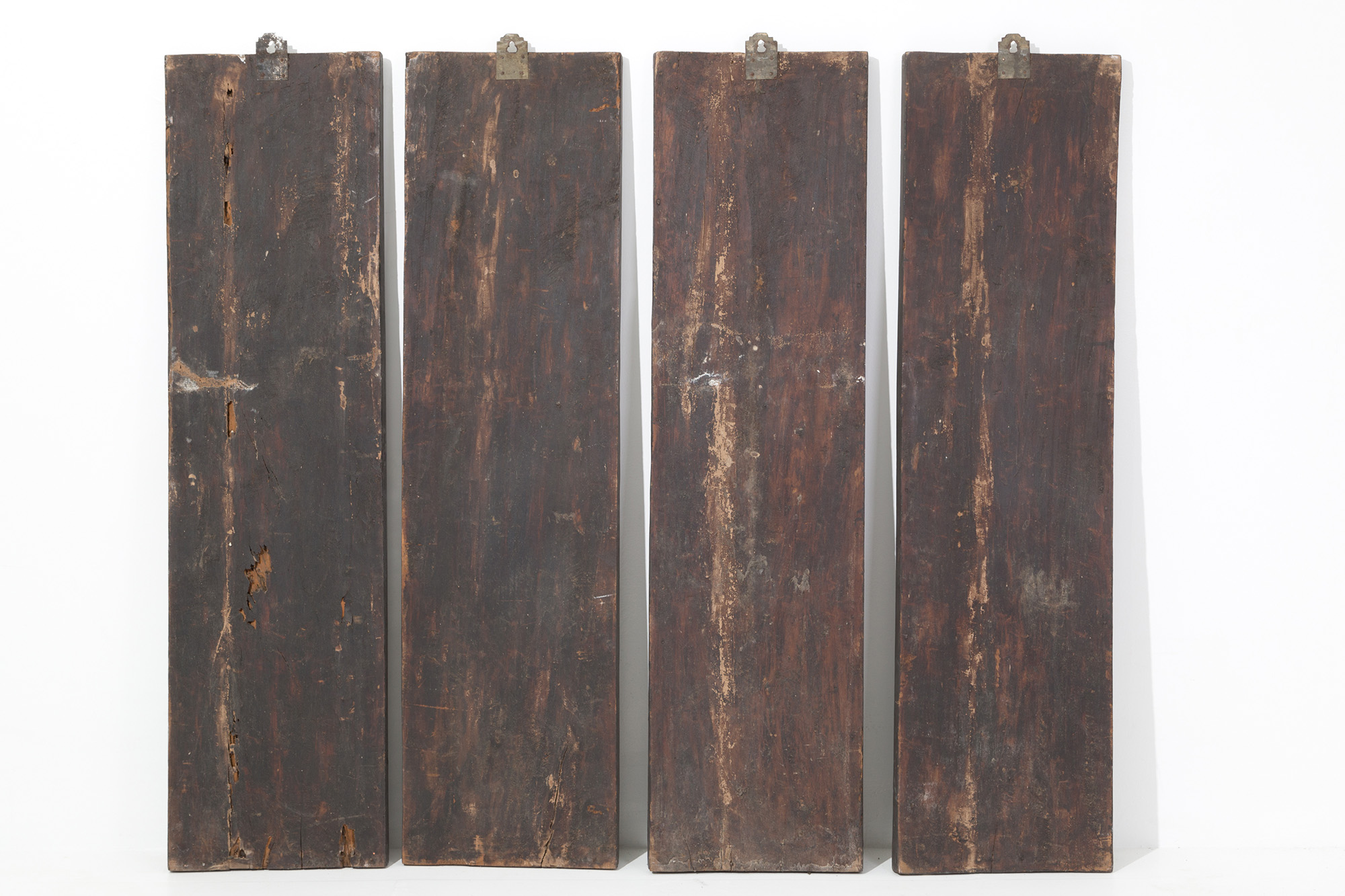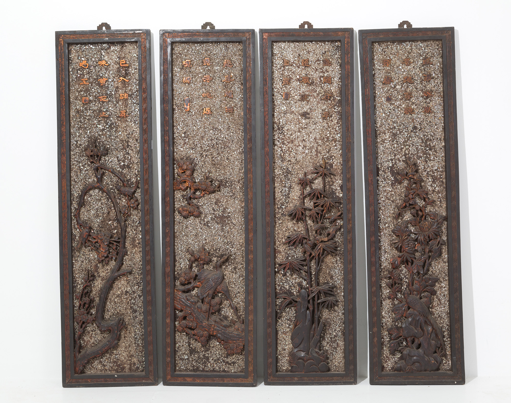 Quattro pannelli in legno intagliato, dorato e dipinto a motivi floreali con frammenti di madreperla sul fondo. Cina. XIX secolo. Mis. Lung. cm. 40 Alt. cm. 151 Prof. cm. 4 ca.